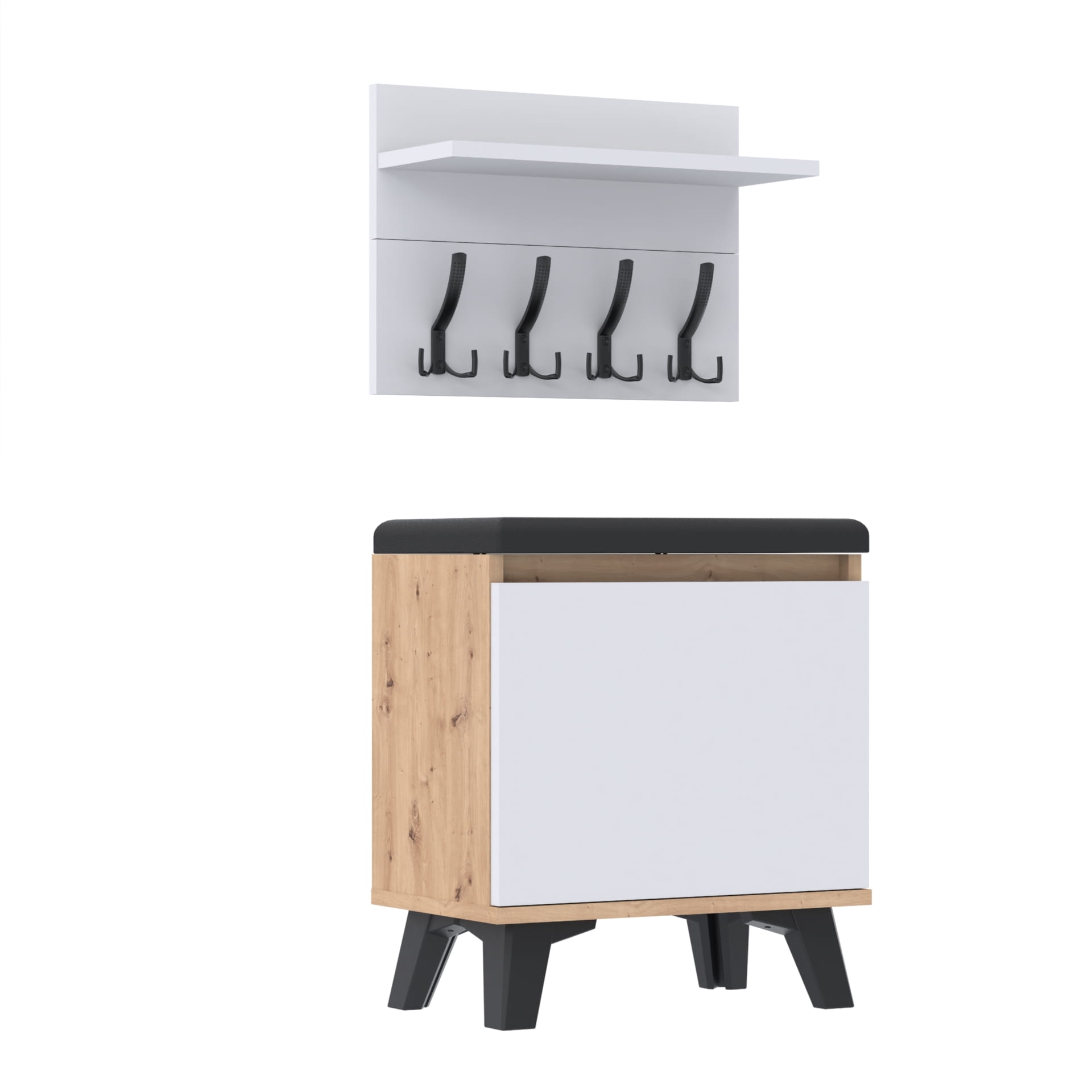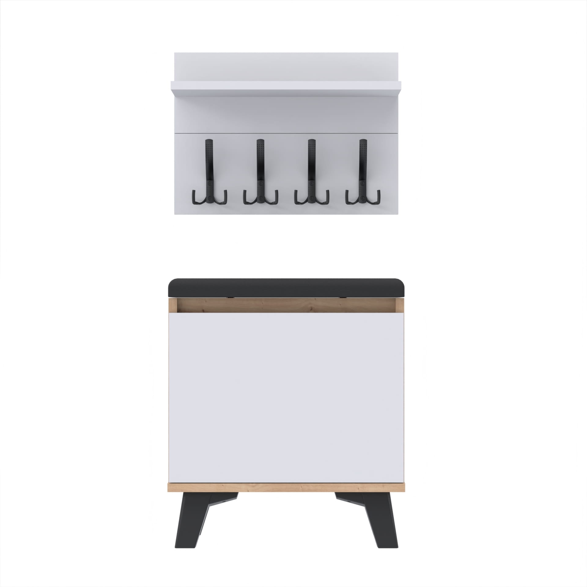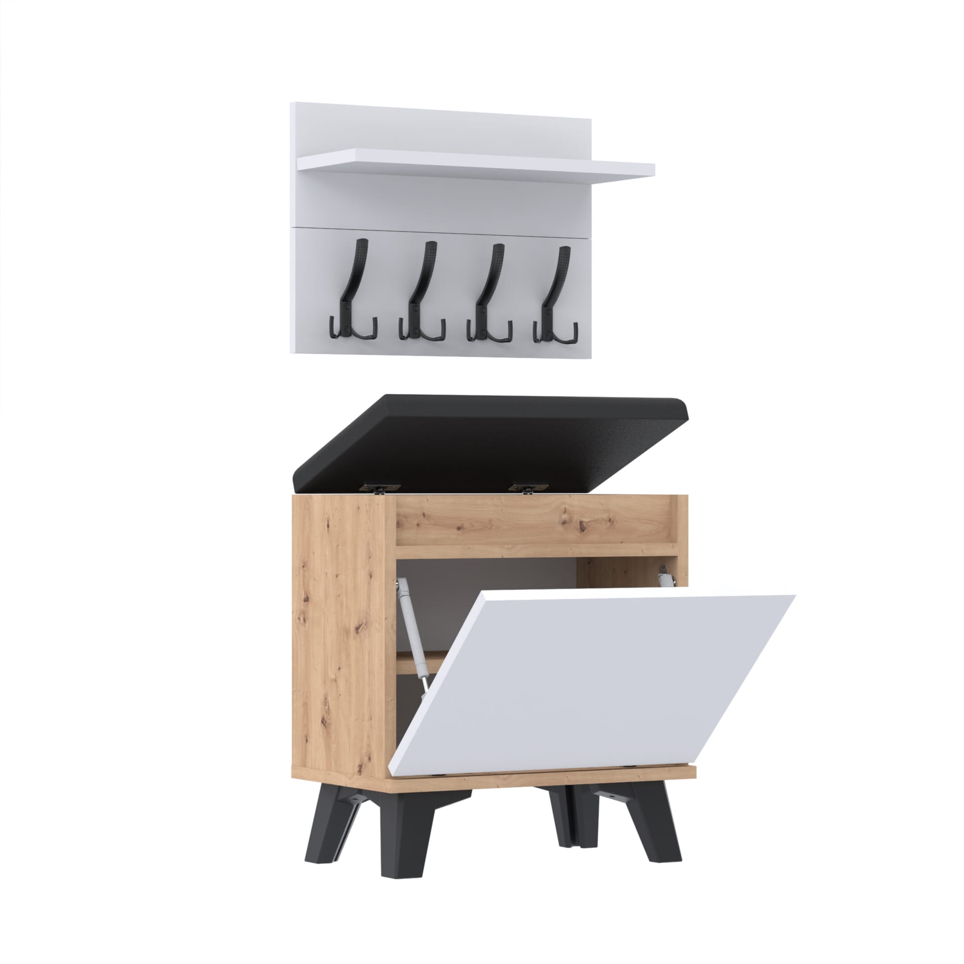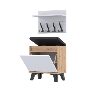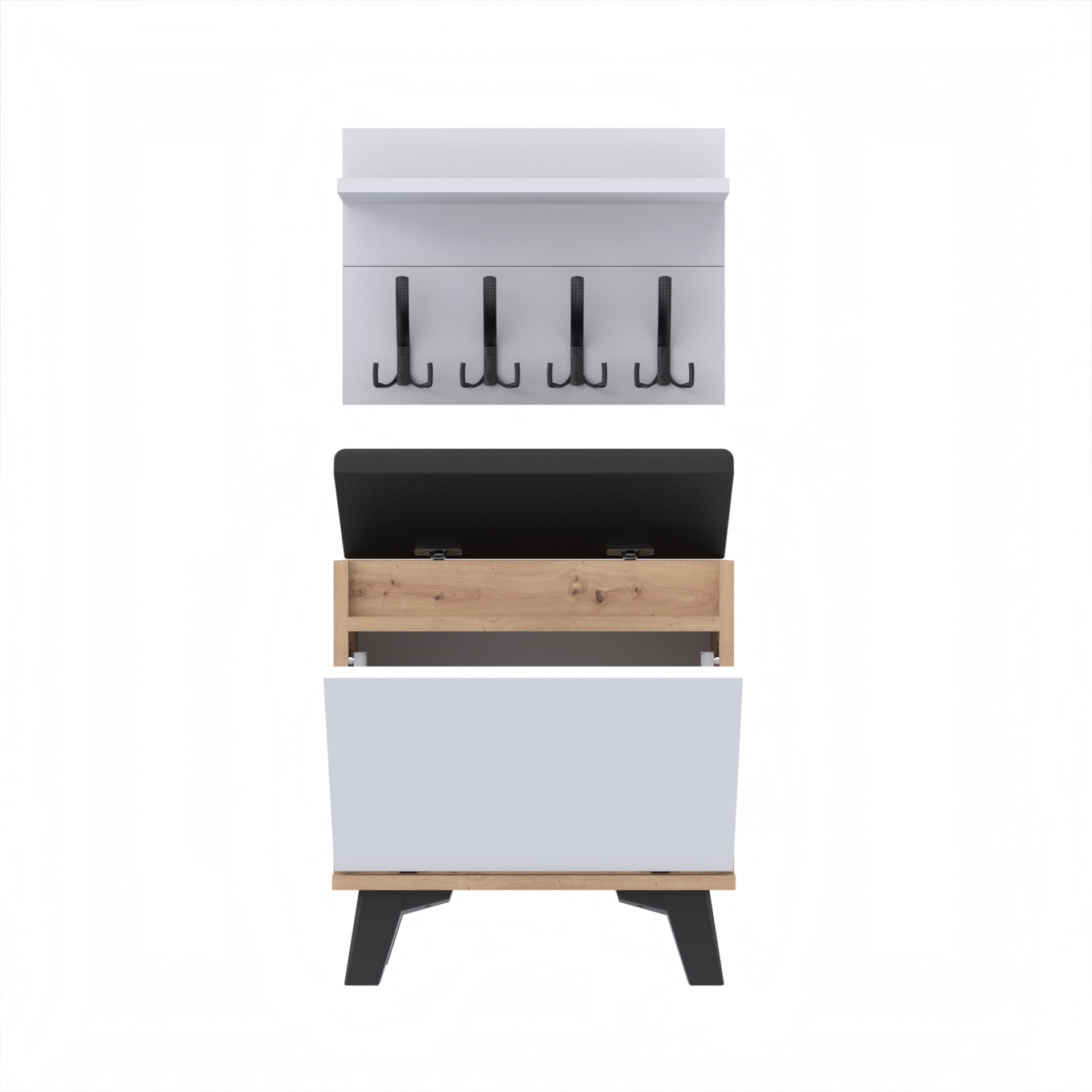 Szafka na buty z siedziskiem tapicerowanym, schowkiem plus wieszak ścienny