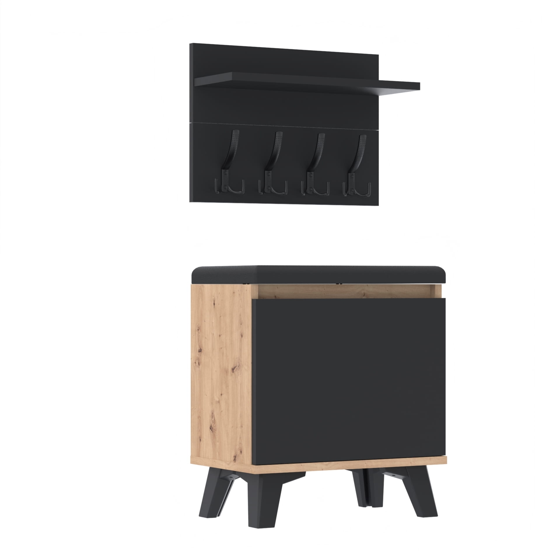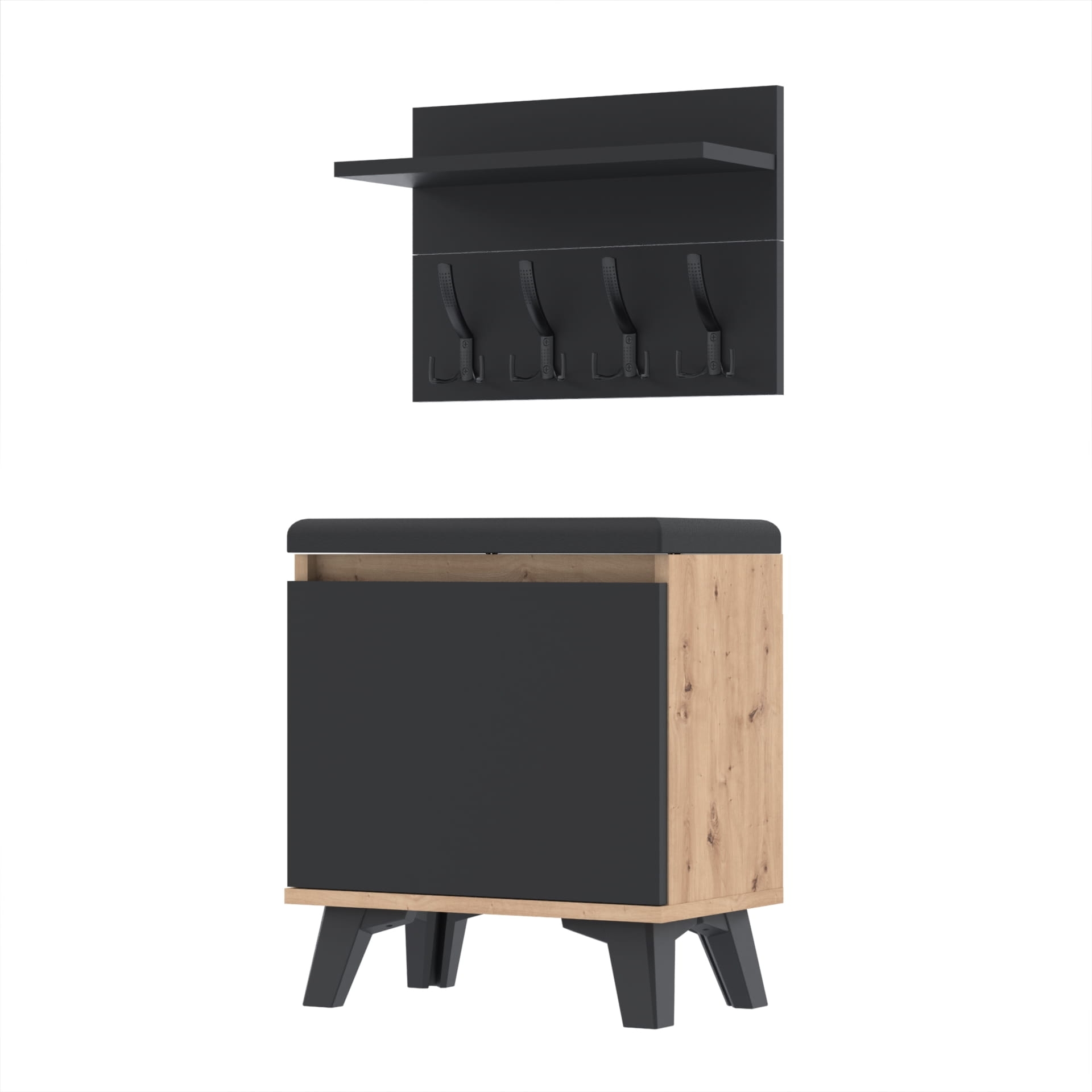 Szafka na buty z siedziskiem tapicerowanym, schowkiem plus wieszak ścienny