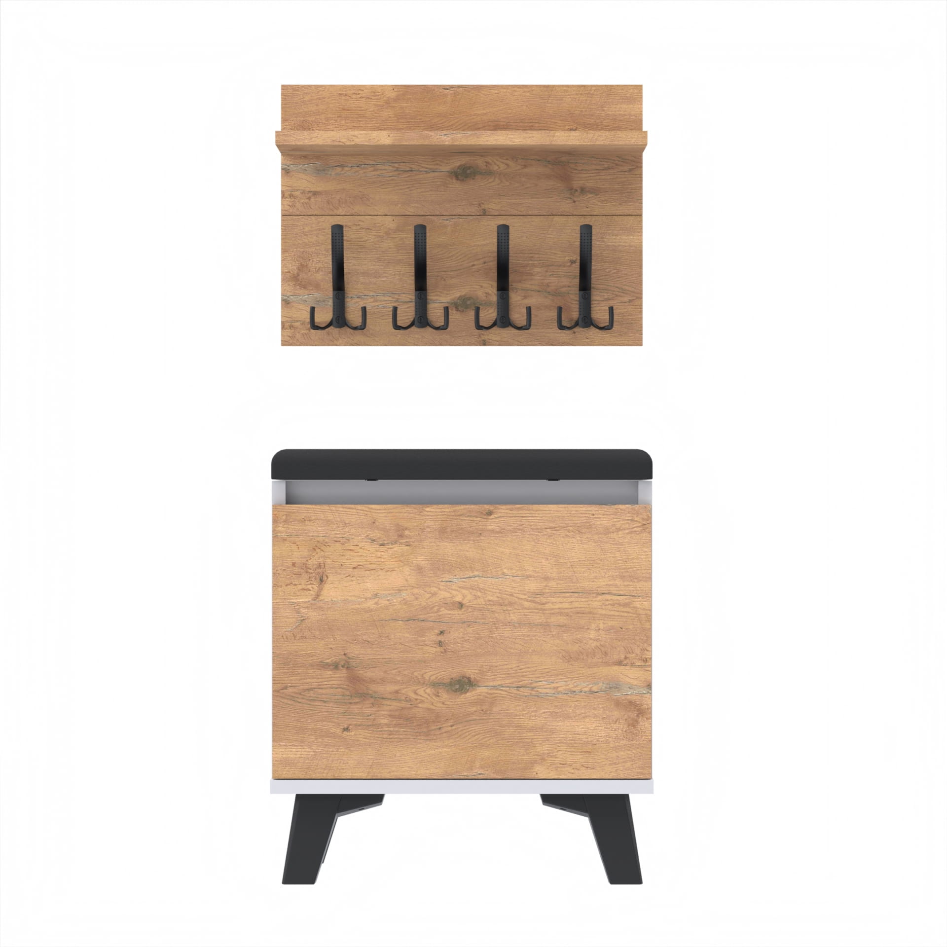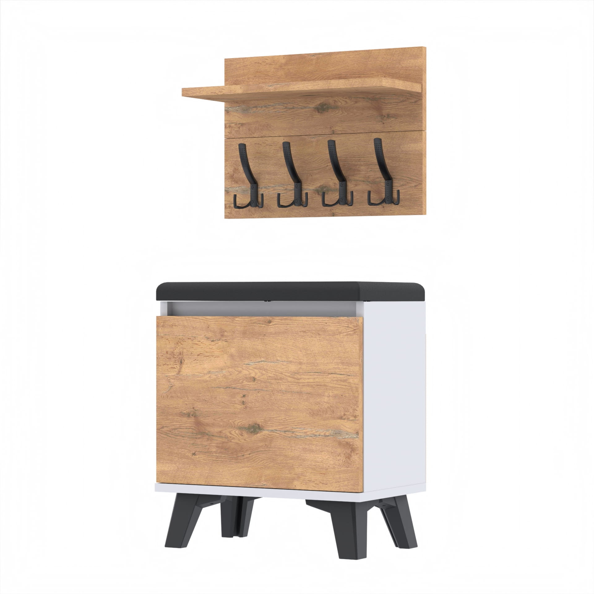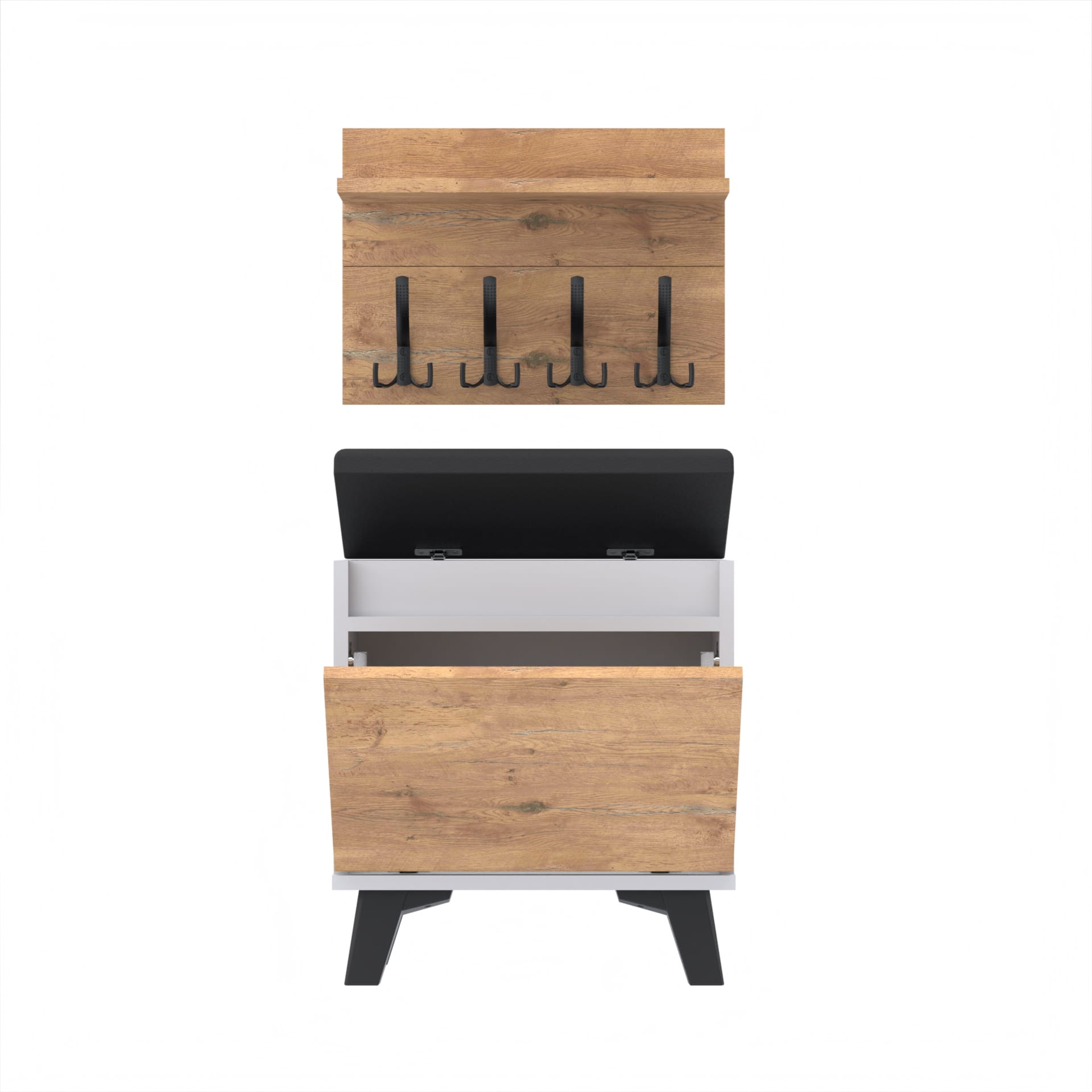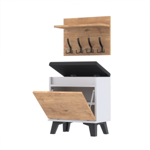 Szafka na buty z siedziskiem tapicerowanym, schowkiem plus wieszak ścienny