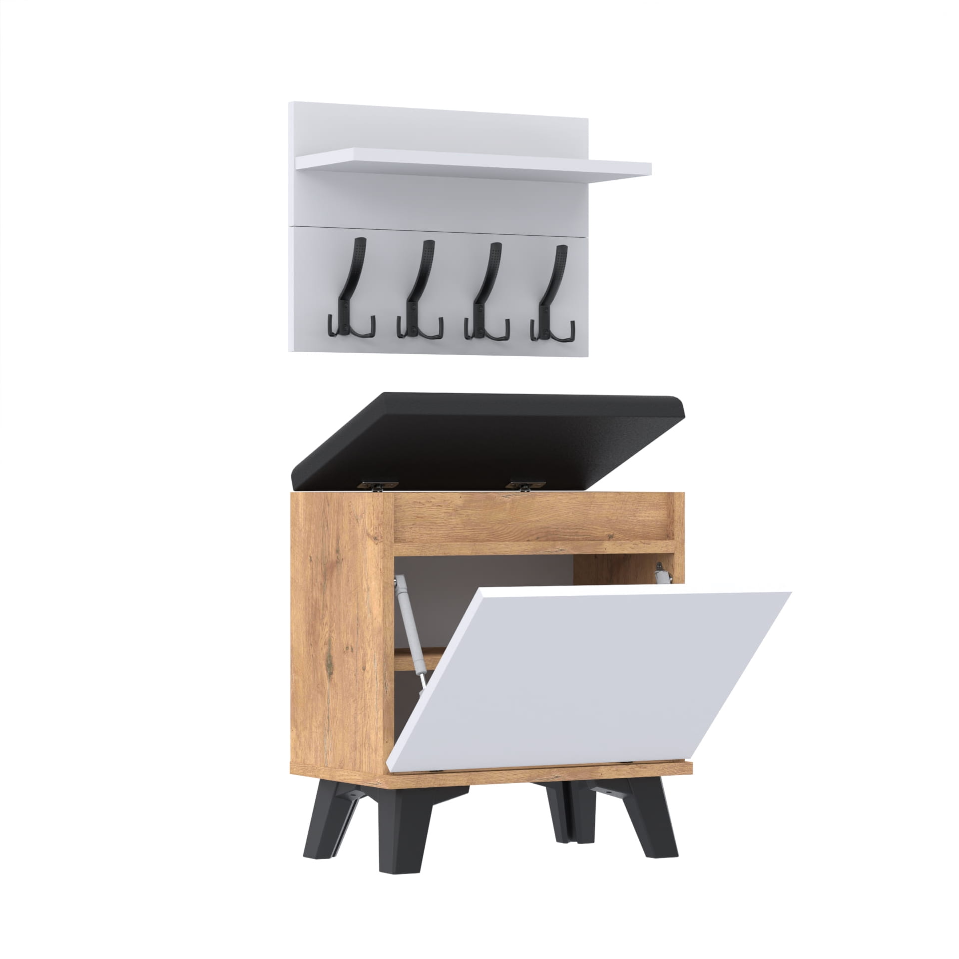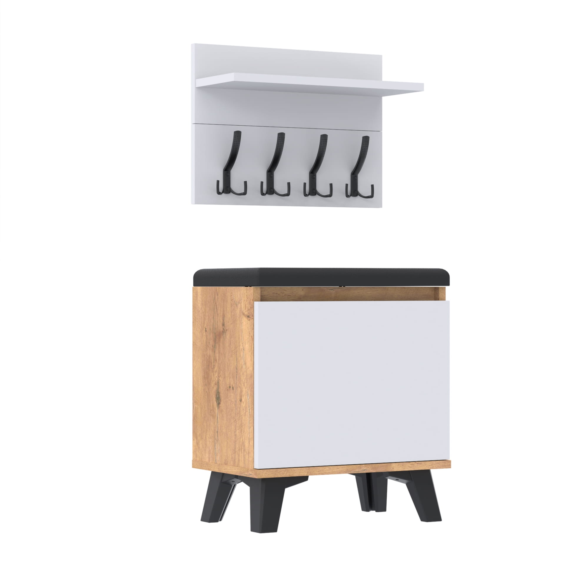 Szafka na buty z siedziskiem tapicerowanym, schowkiem plus wieszak ścienny