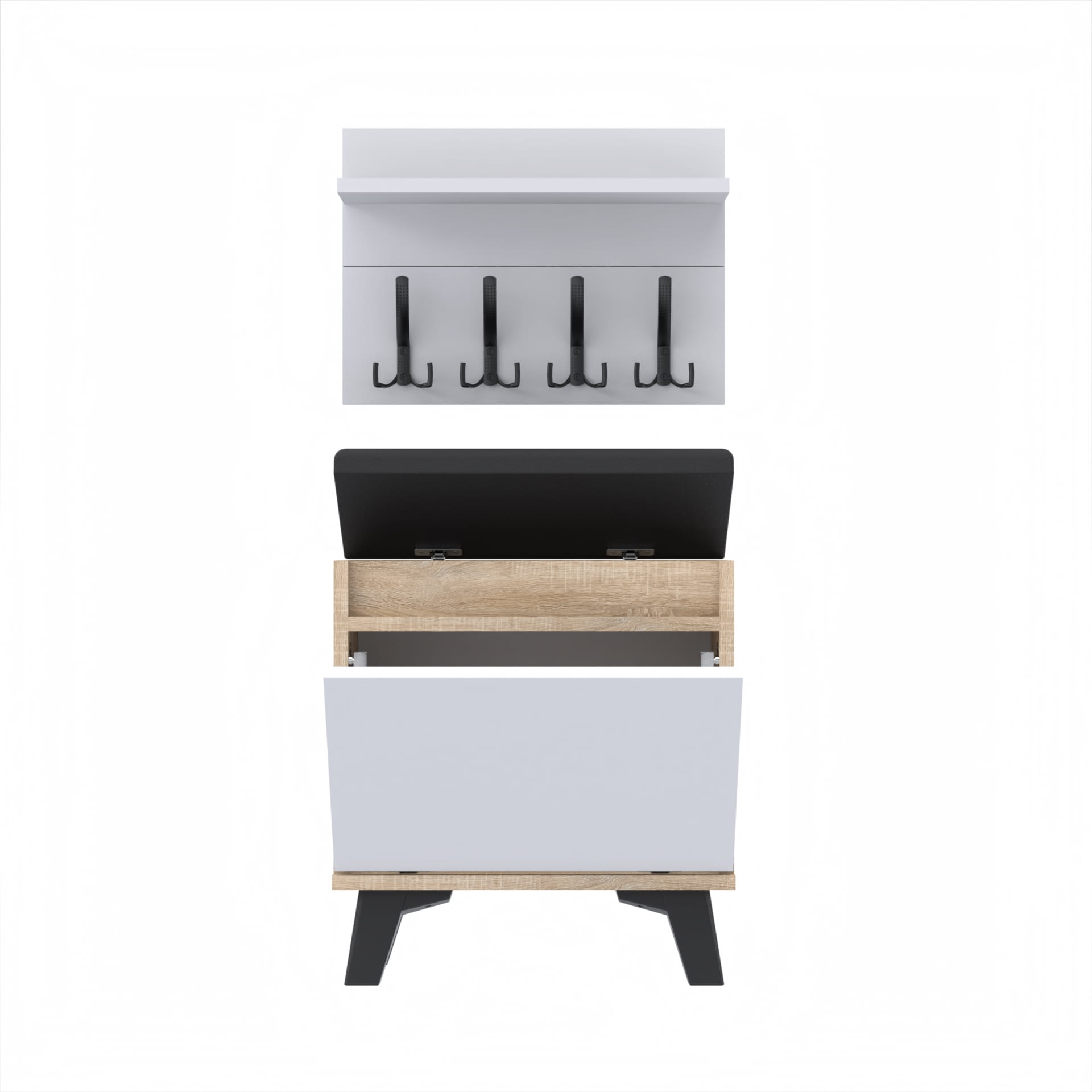 Szafka na buty z siedziskiem tapicerowanym, schowkiem plus wieszak ścienny