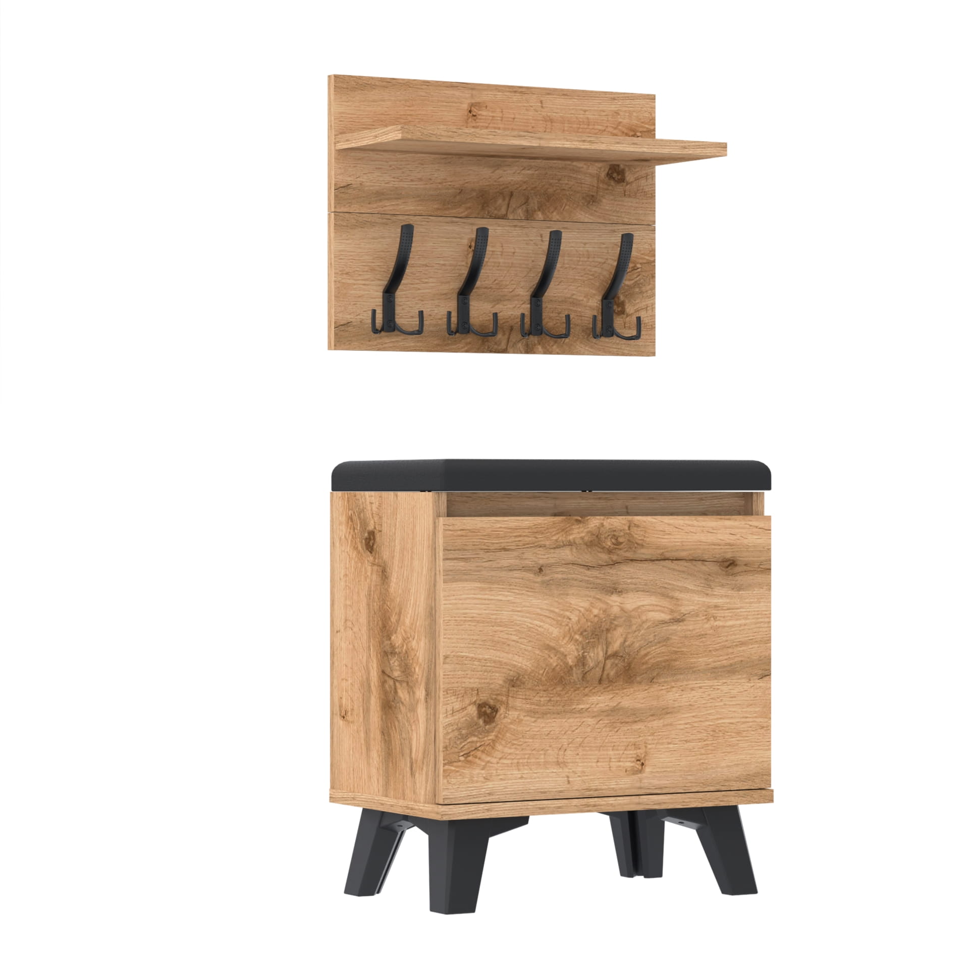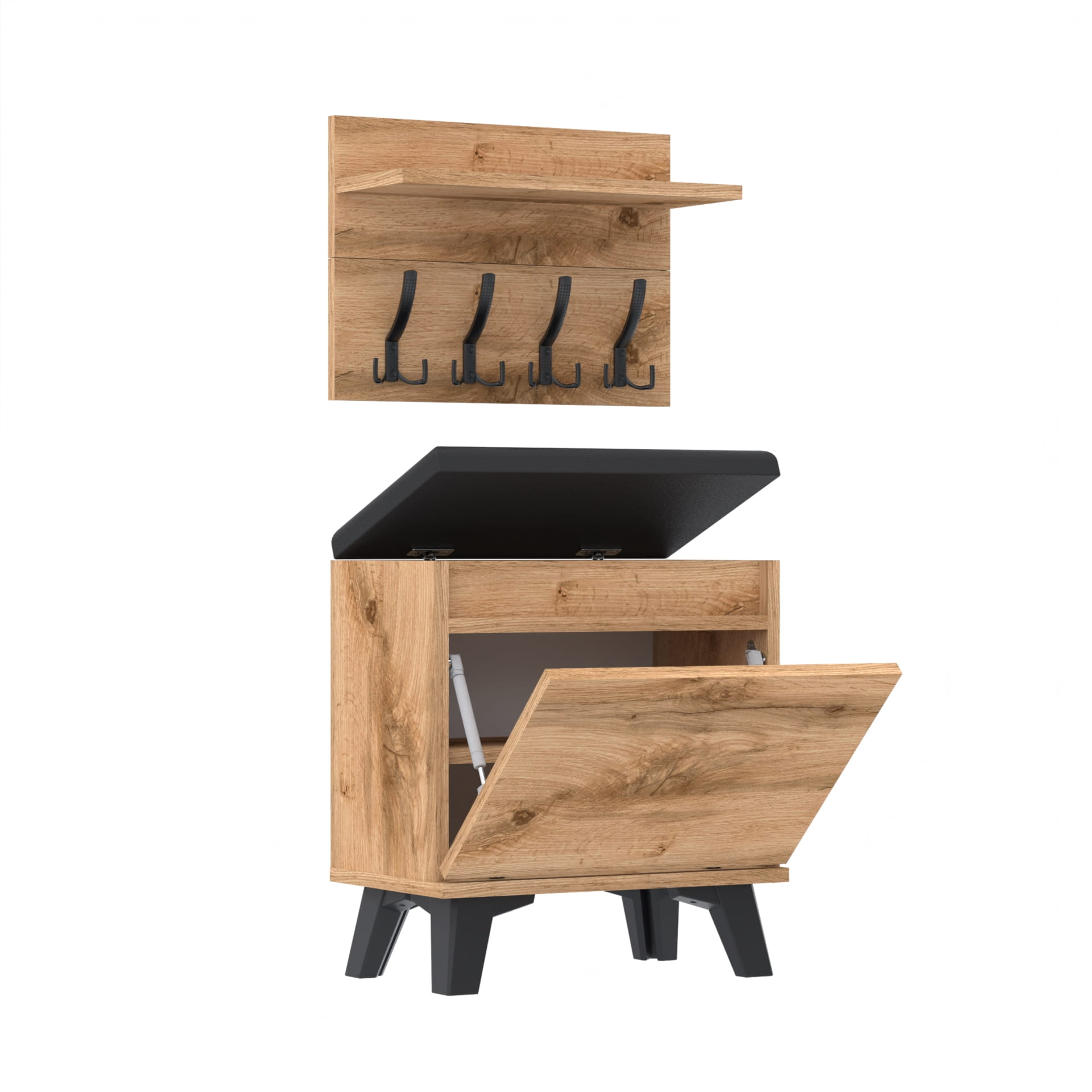 Szafka na buty z siedziskiem tapicerowanym, schowkiem plus wieszak ścienny