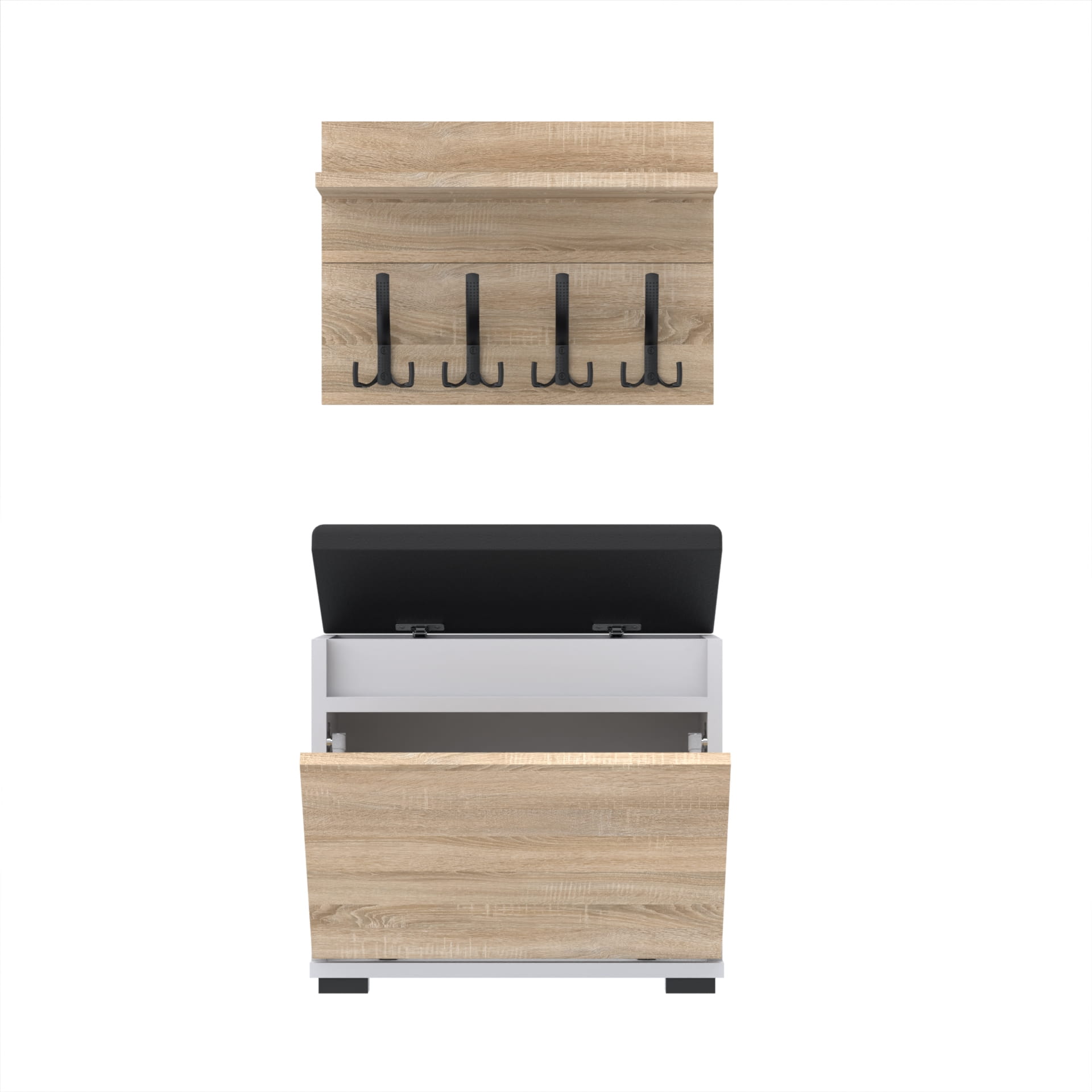 Szafka na buty z siedziskiem tapicerowanym, schowkiem plus wieszak ścienny