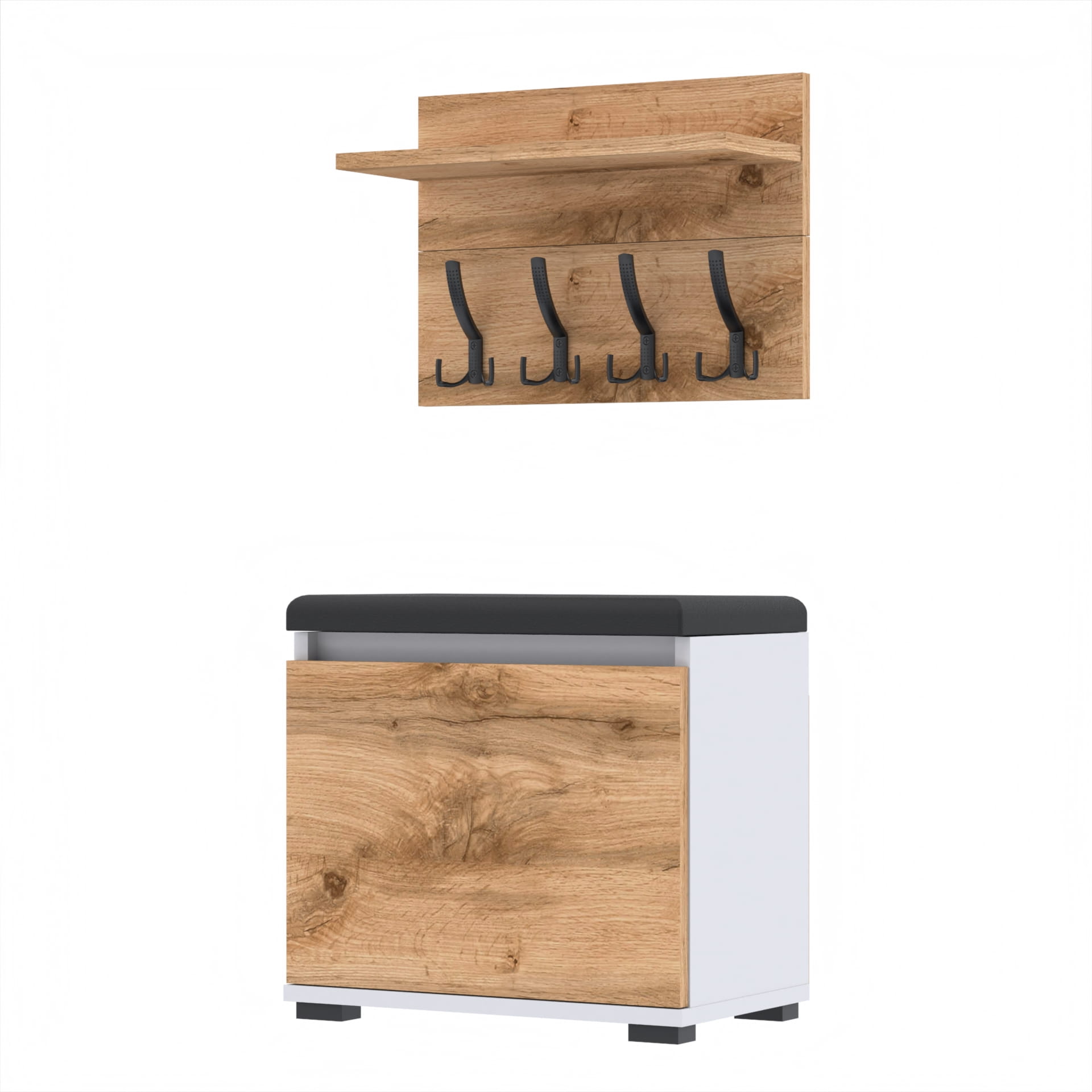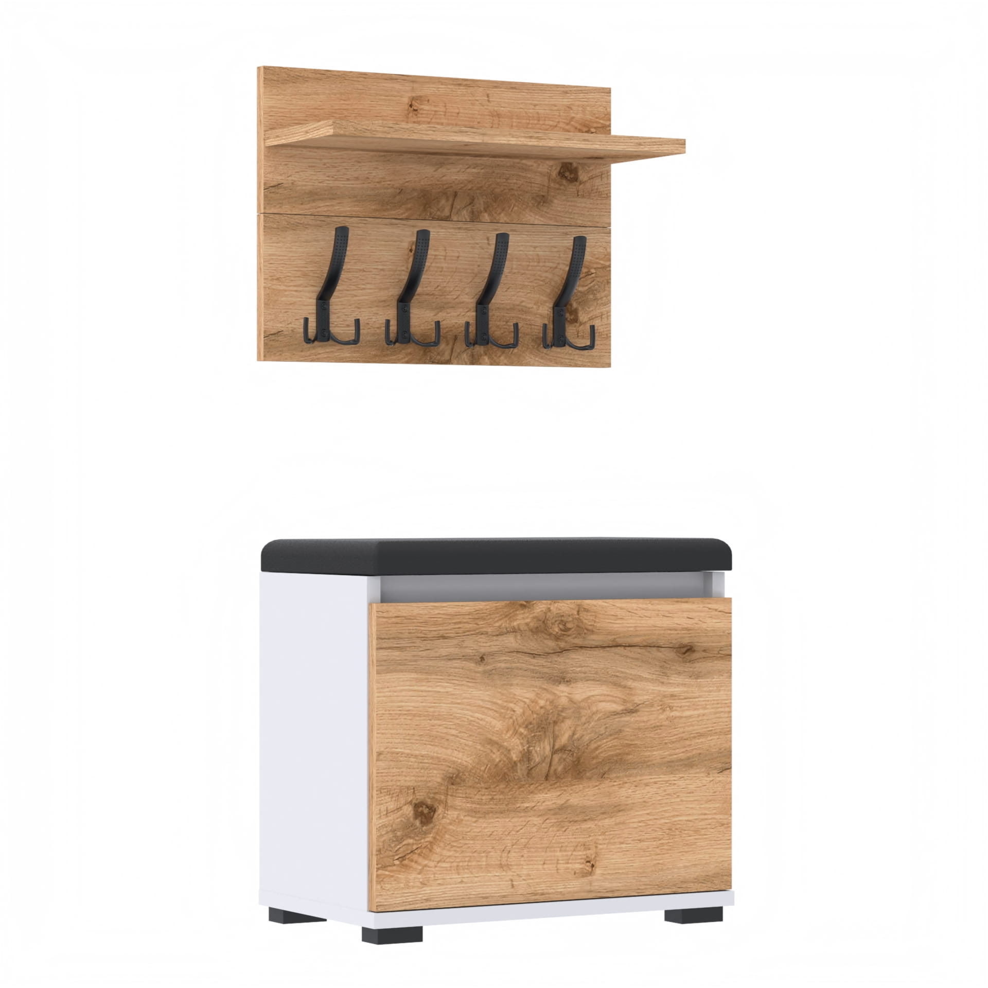 Szafka na buty z siedziskiem tapicerowanym, schowkiem plus wieszak ścienny