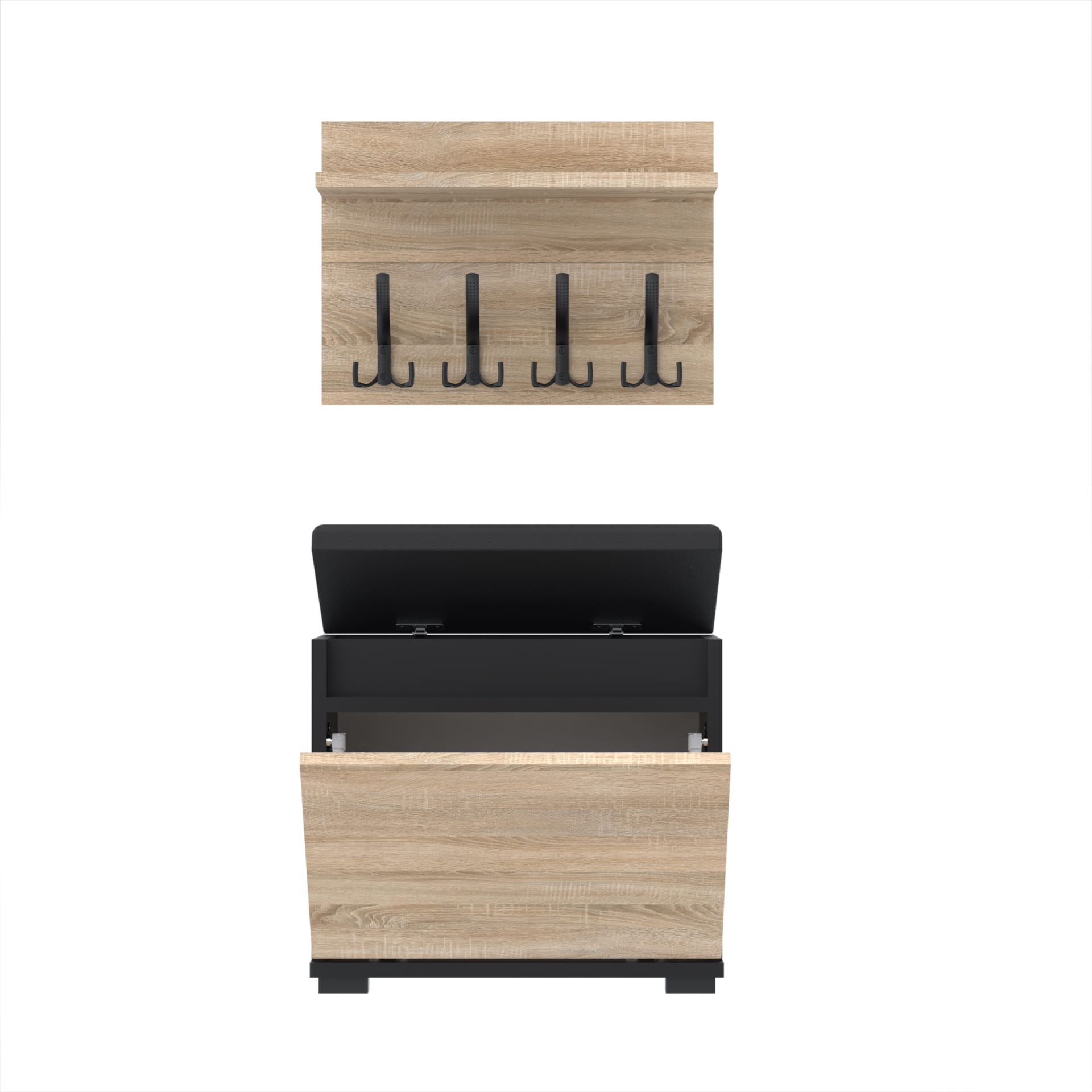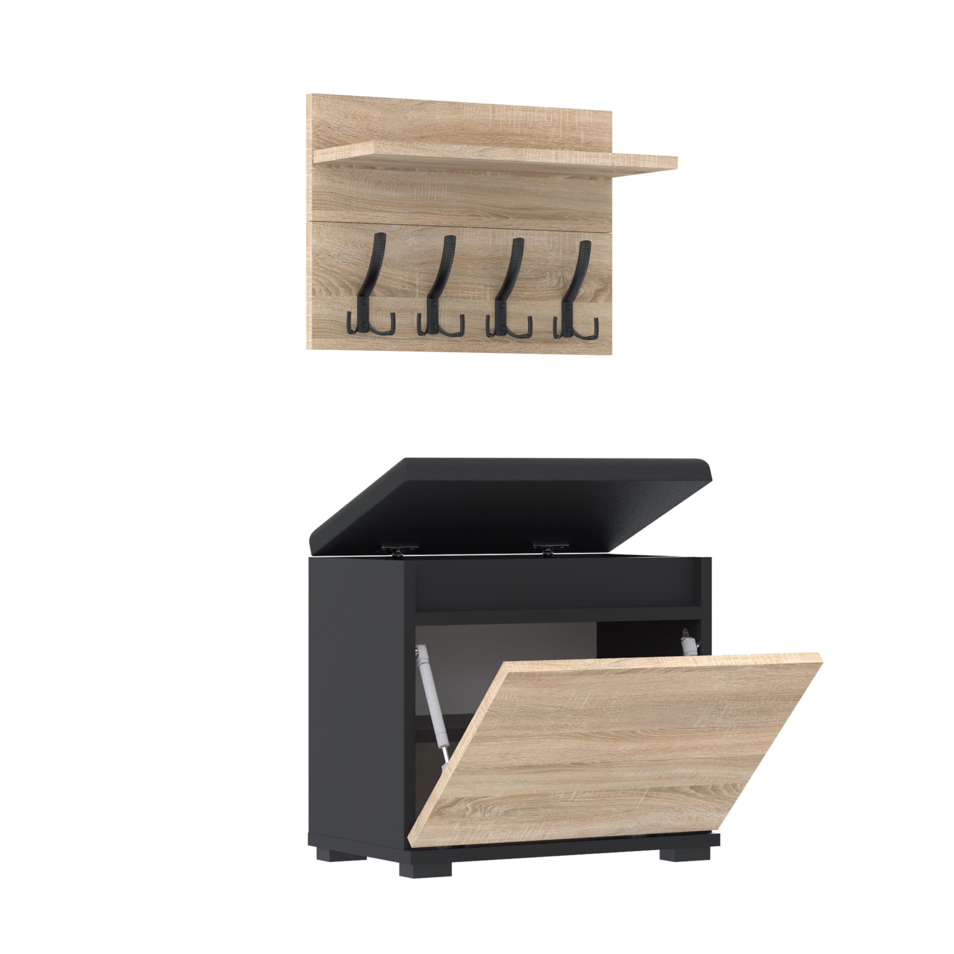 Szafka na buty z siedziskiem tapicerowanym, schowkiem plus wieszak ścienny