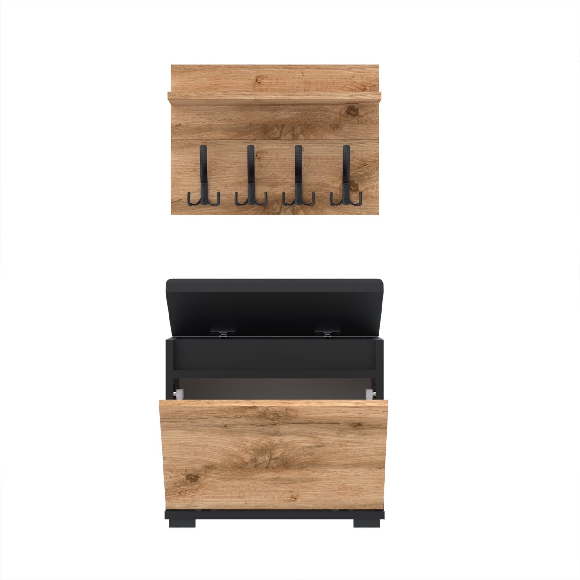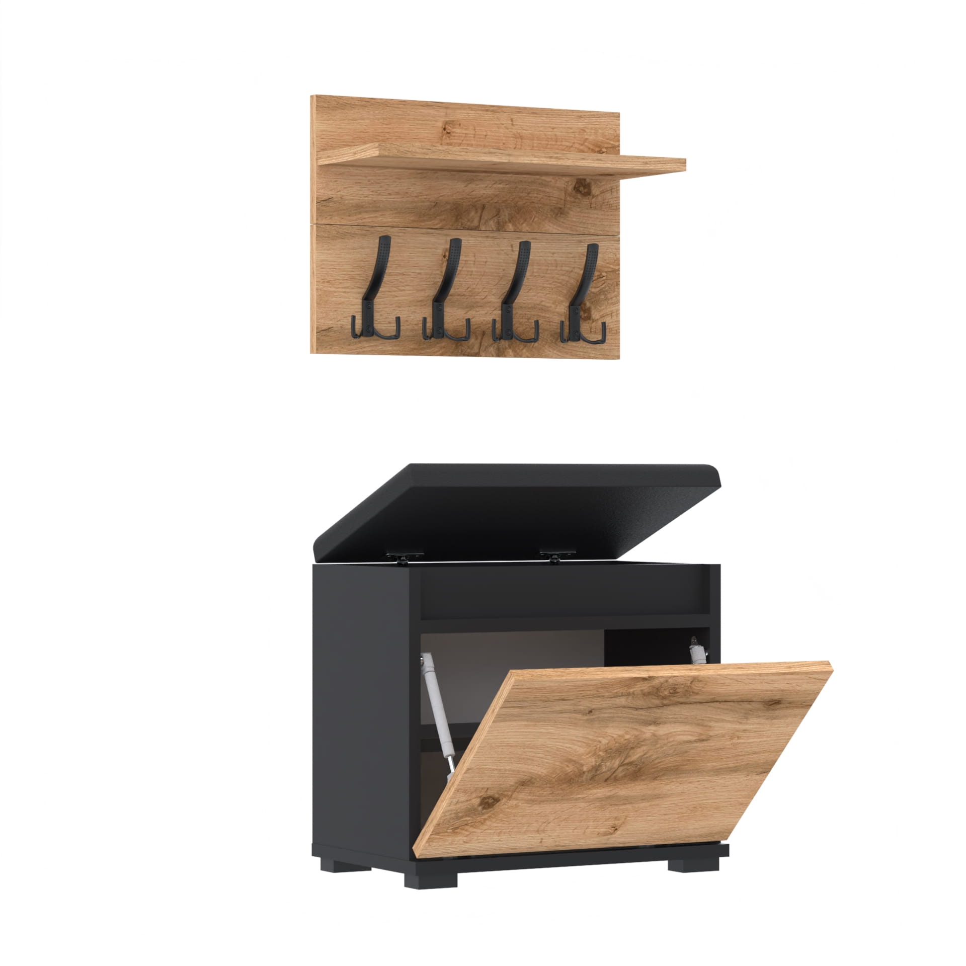 Szafka na buty z siedziskiem tapicerowanym, schowkiem plus wieszak ścienny