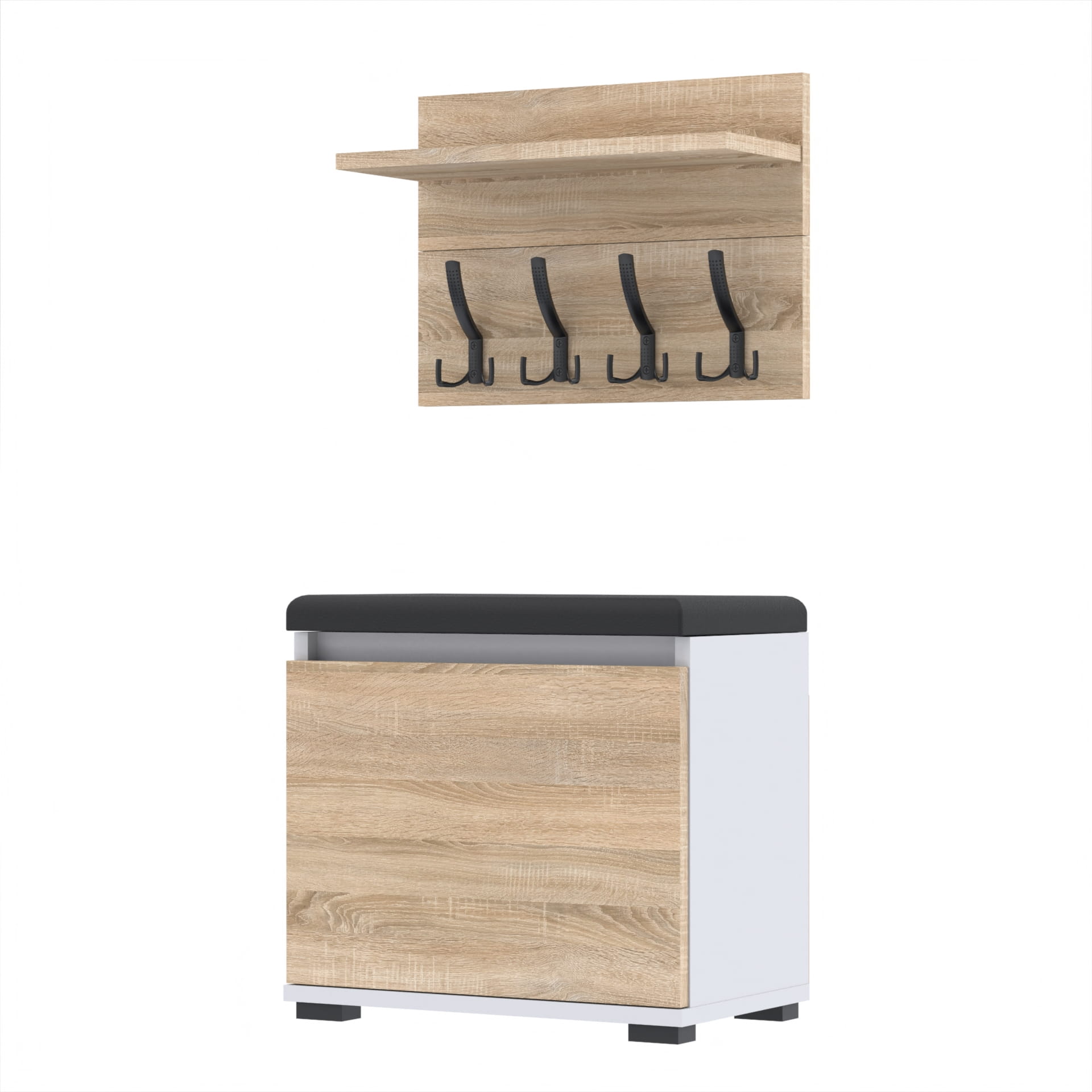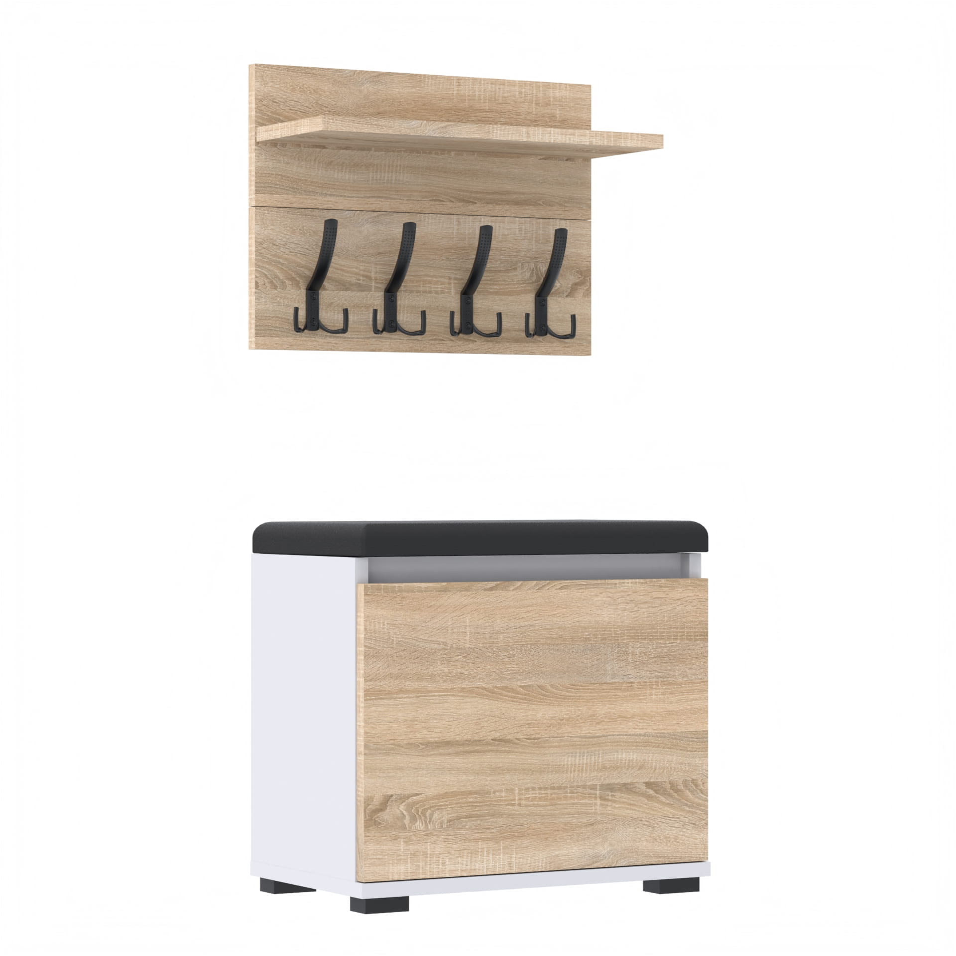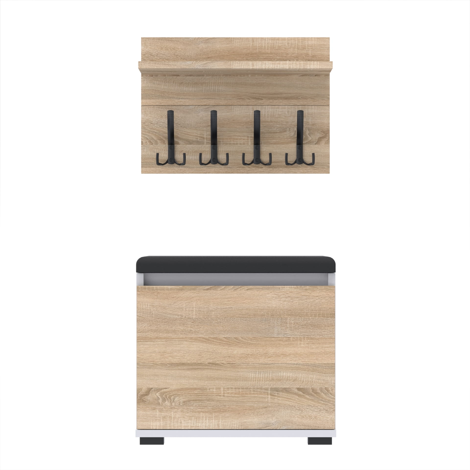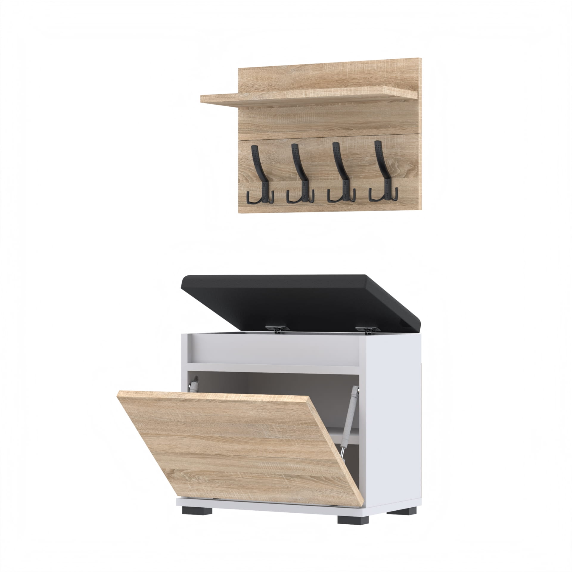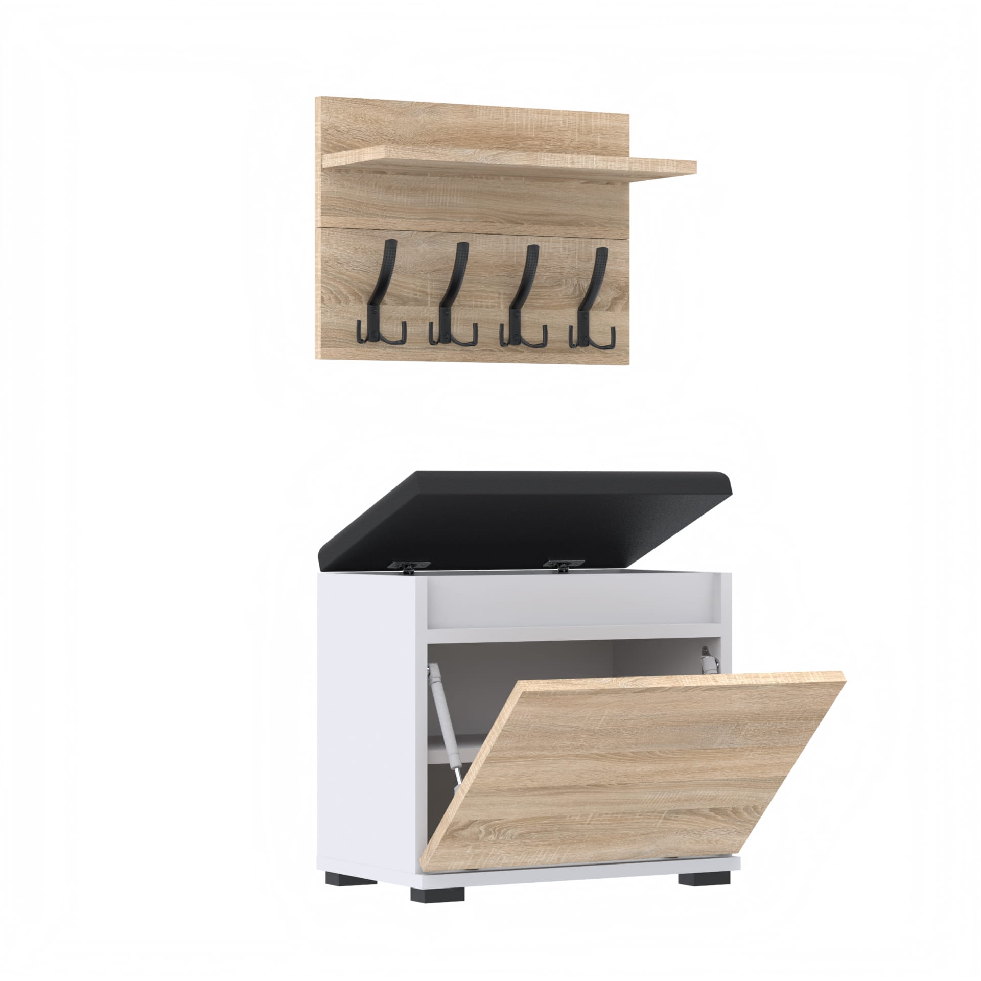 Szafka na buty z siedziskiem tapicerowanym, schowkiem plus wieszak ścienny