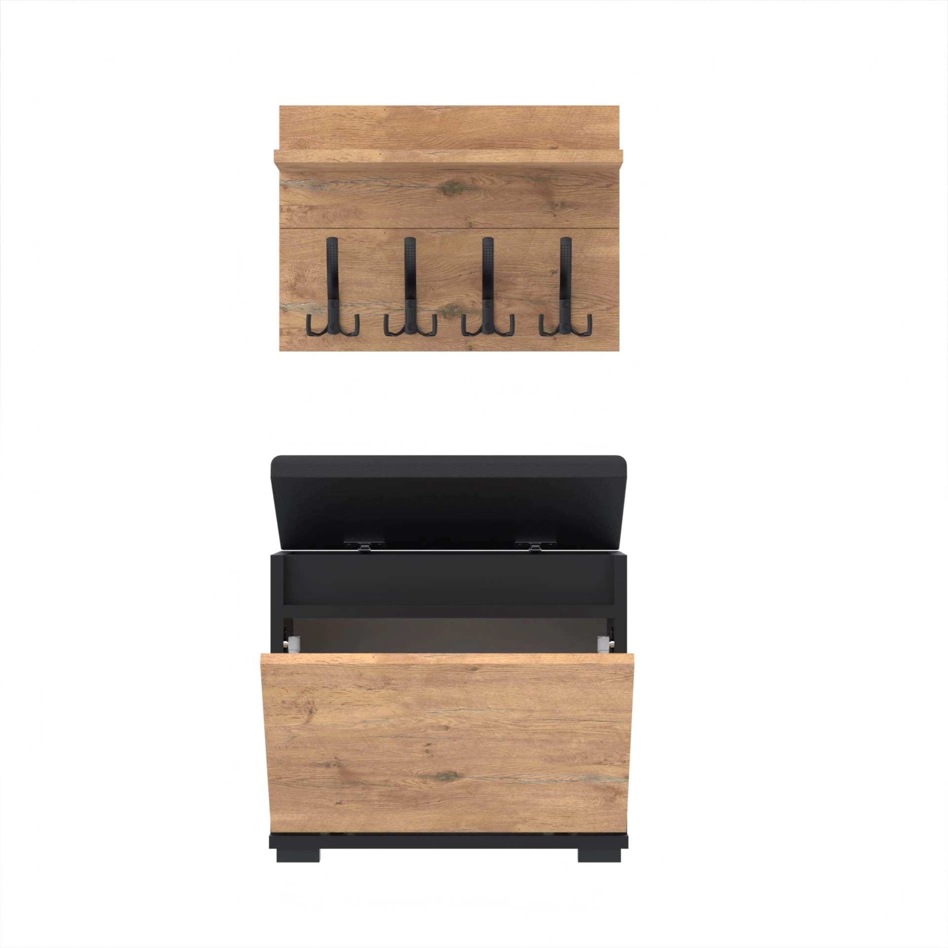 Szafka na buty z siedziskiem tapicerowanym, schowkiem plus wieszak ścienny