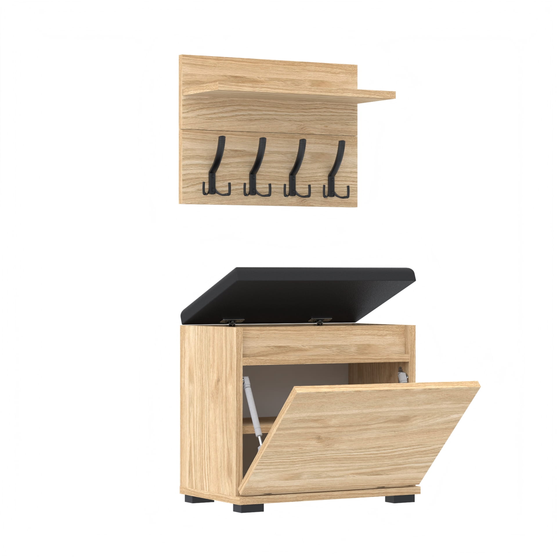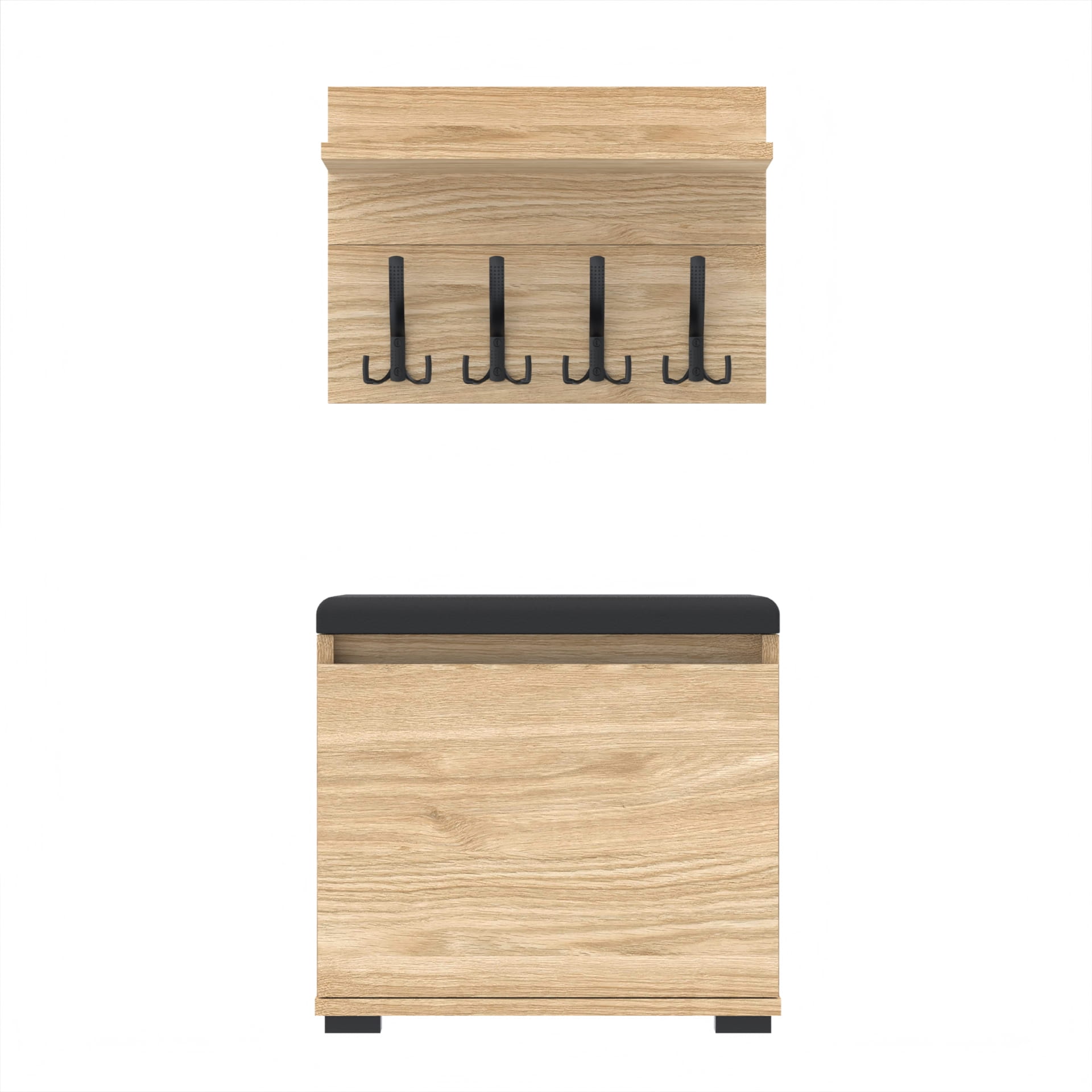 Szafka na buty z siedziskiem tapicerowanym, schowkiem plus wieszak ścienny