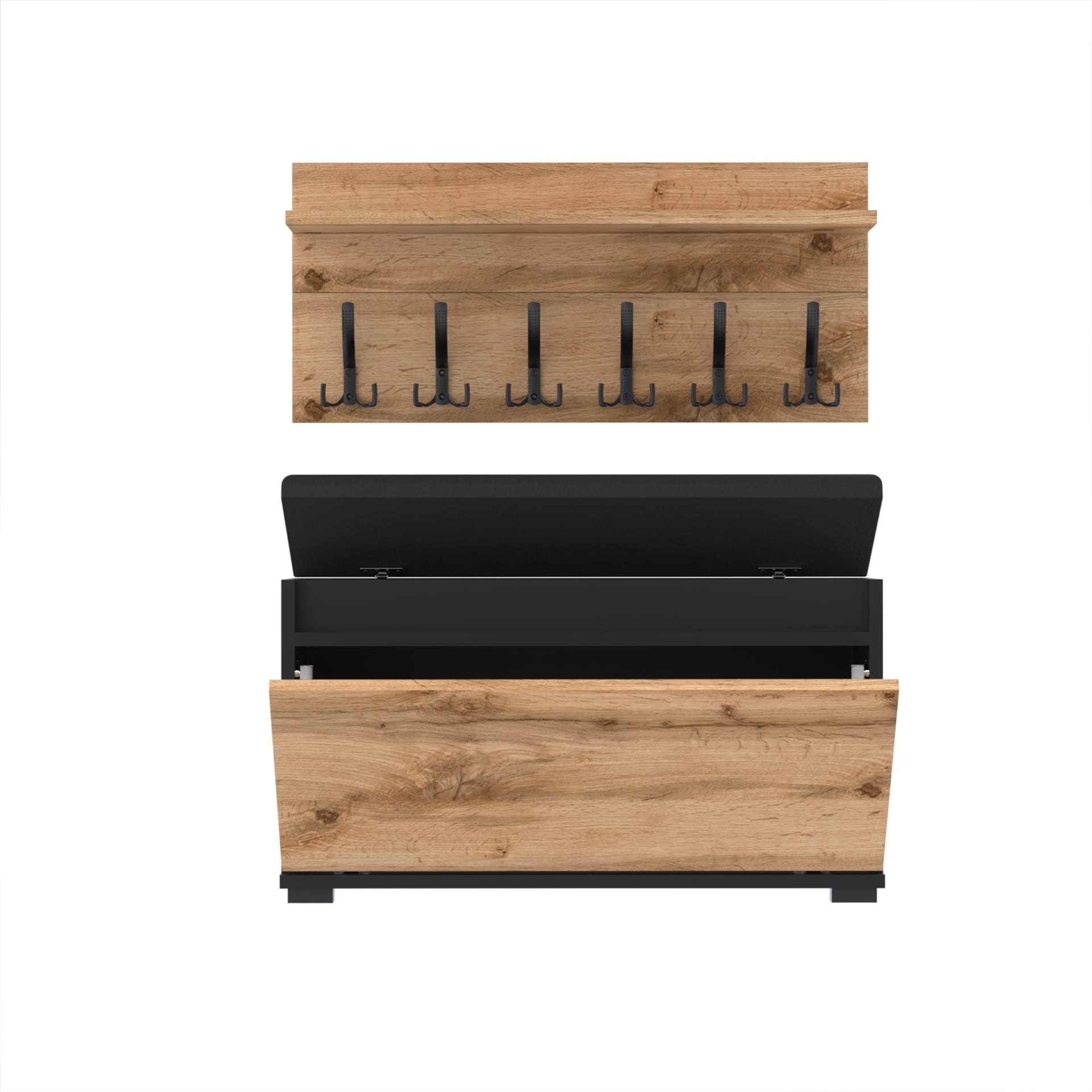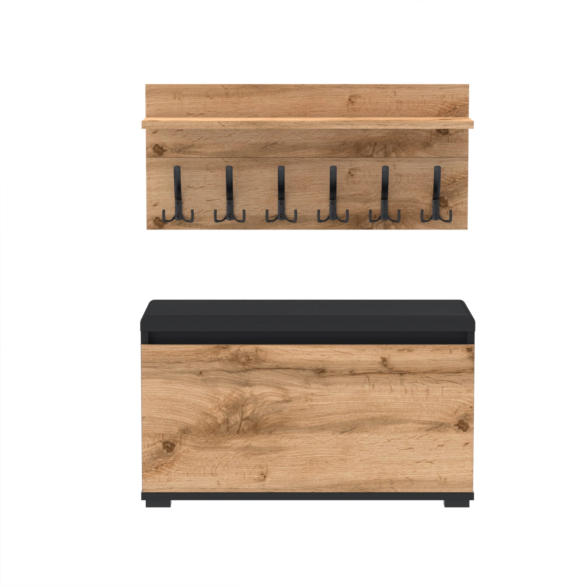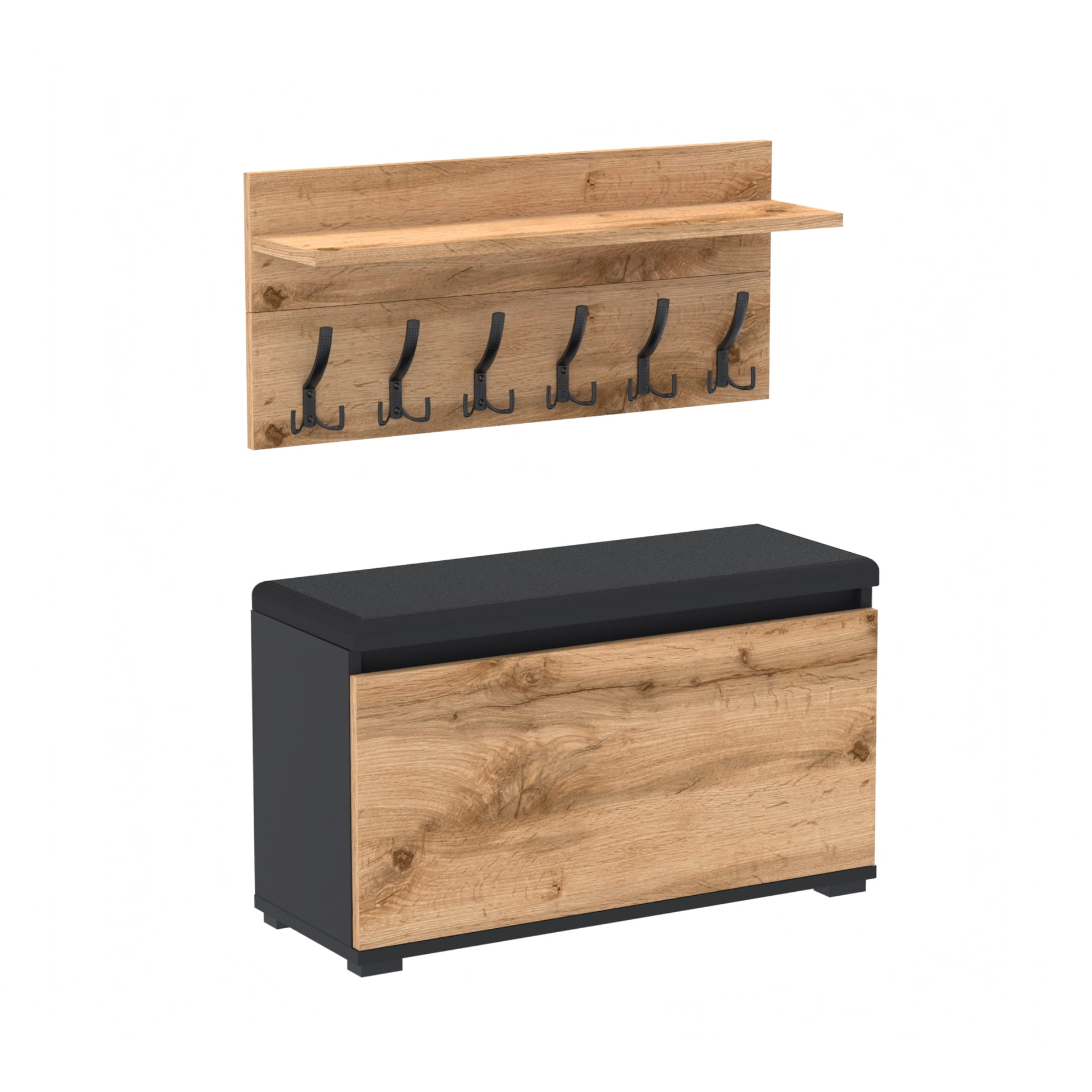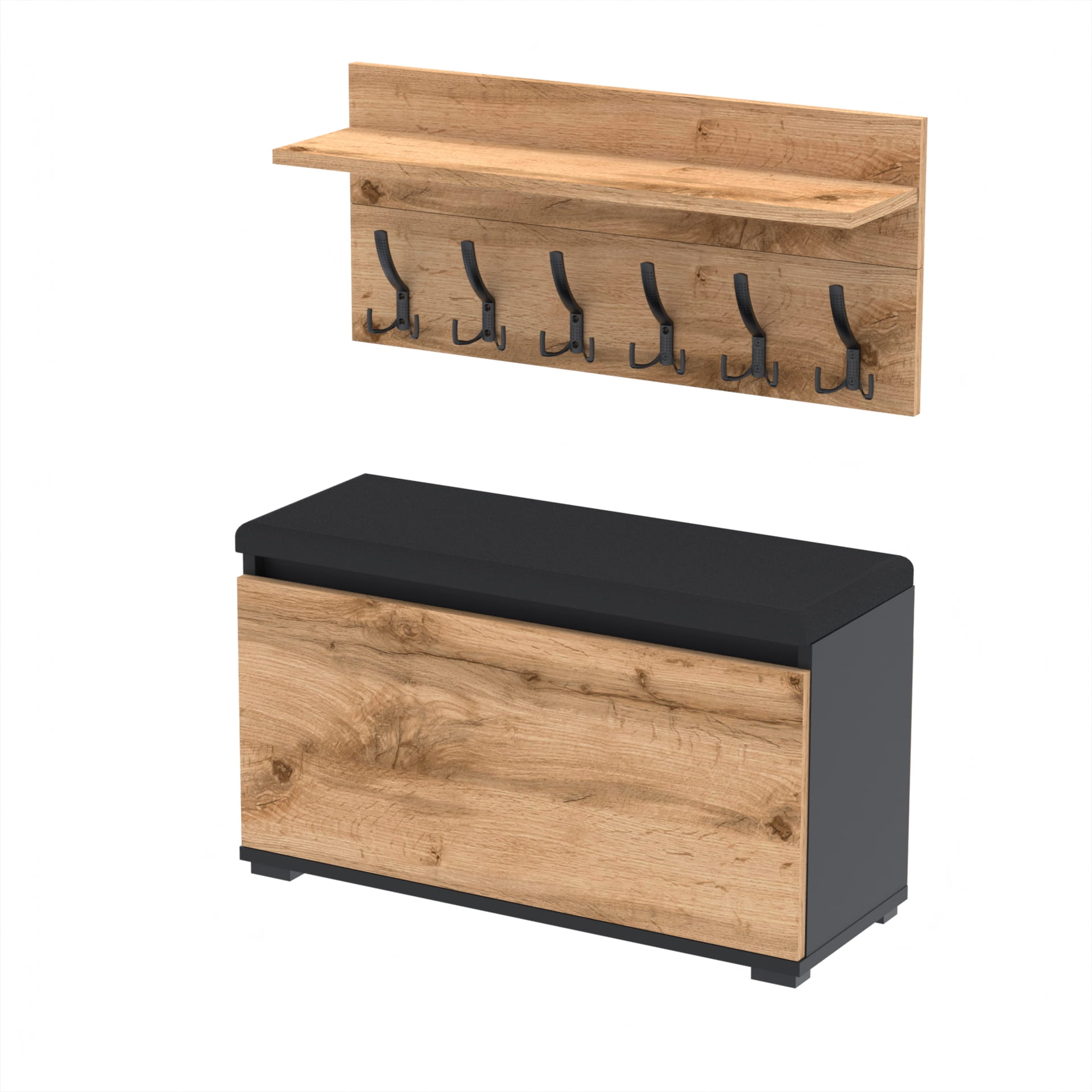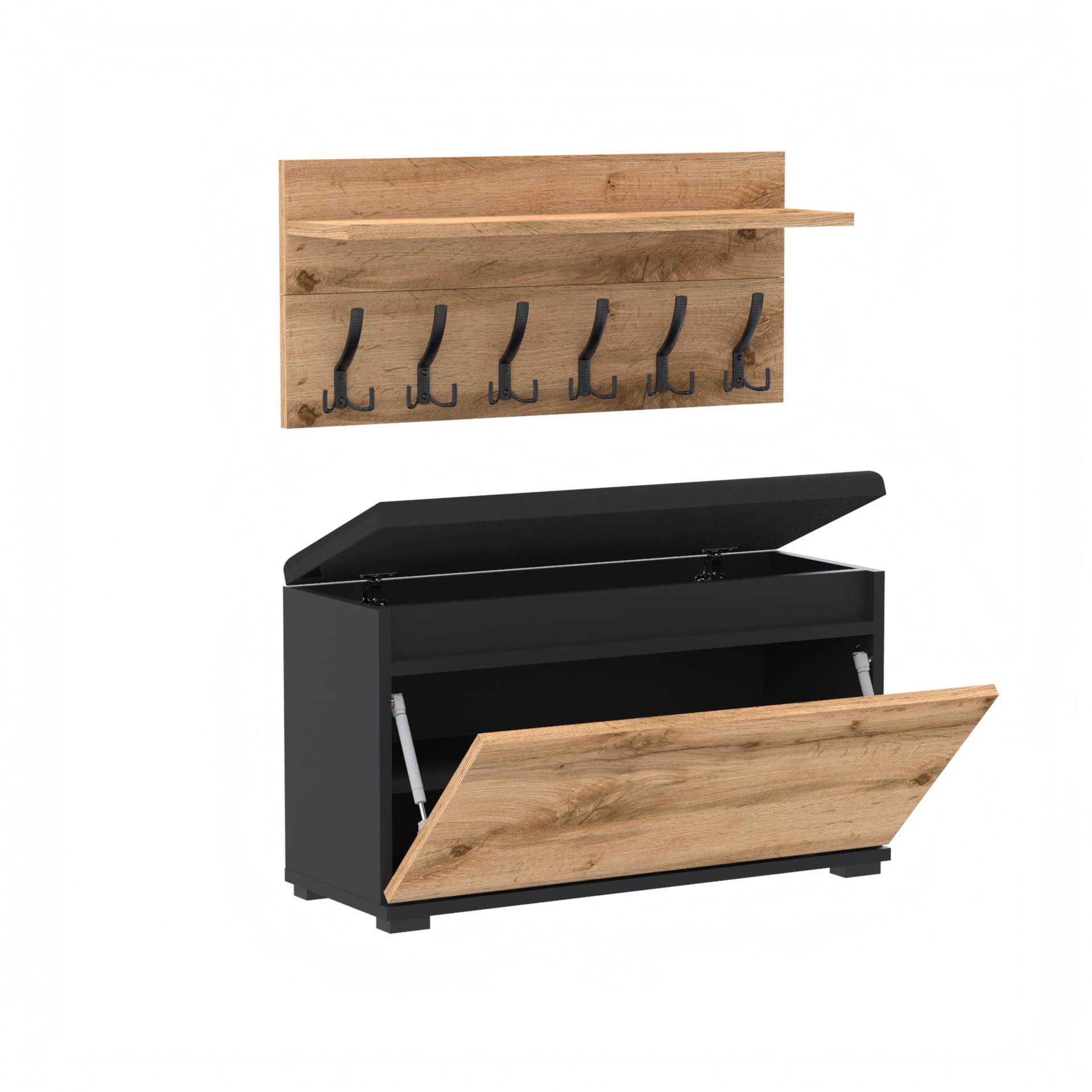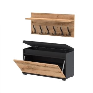 Szafka na buty z siedziskiem tapicerowanym, schowkiem plus wieszak ścienny