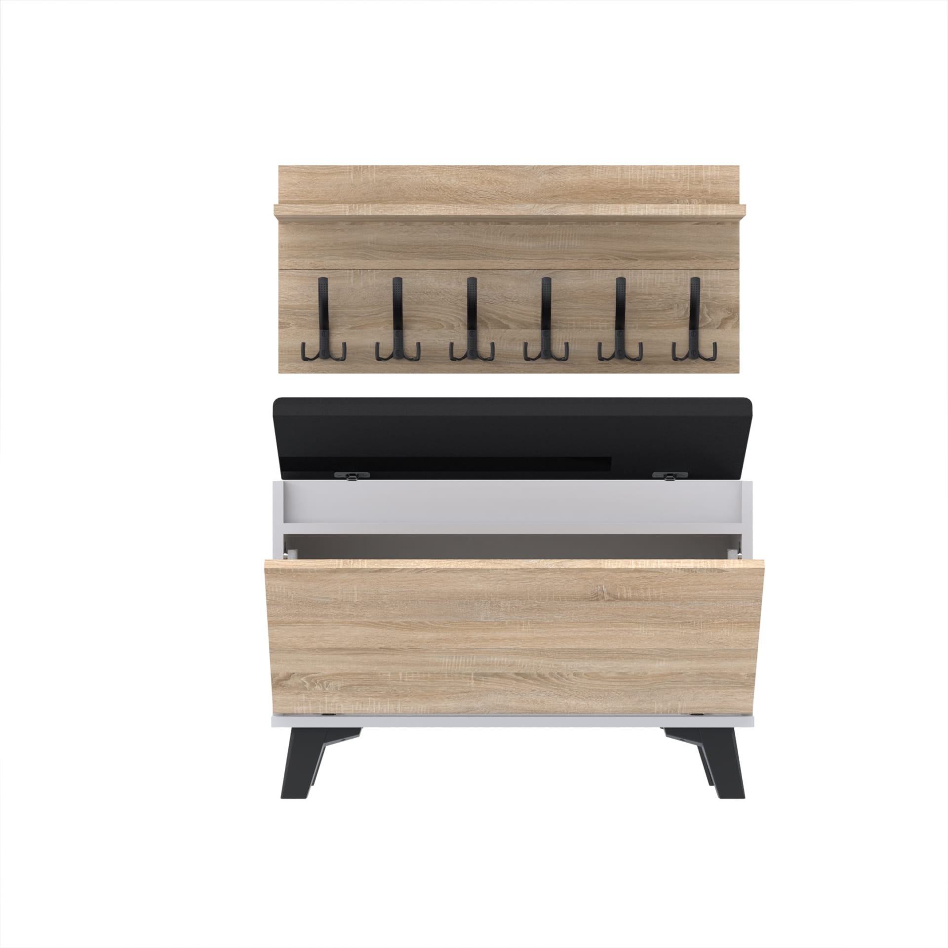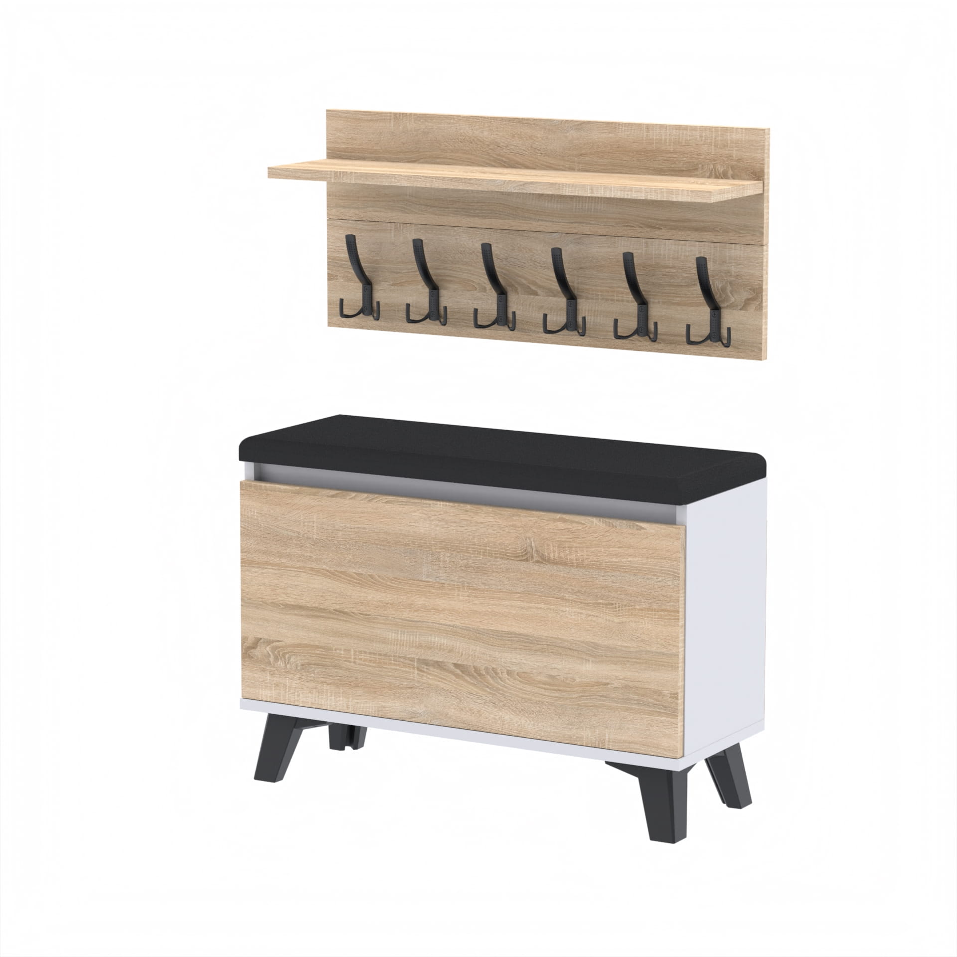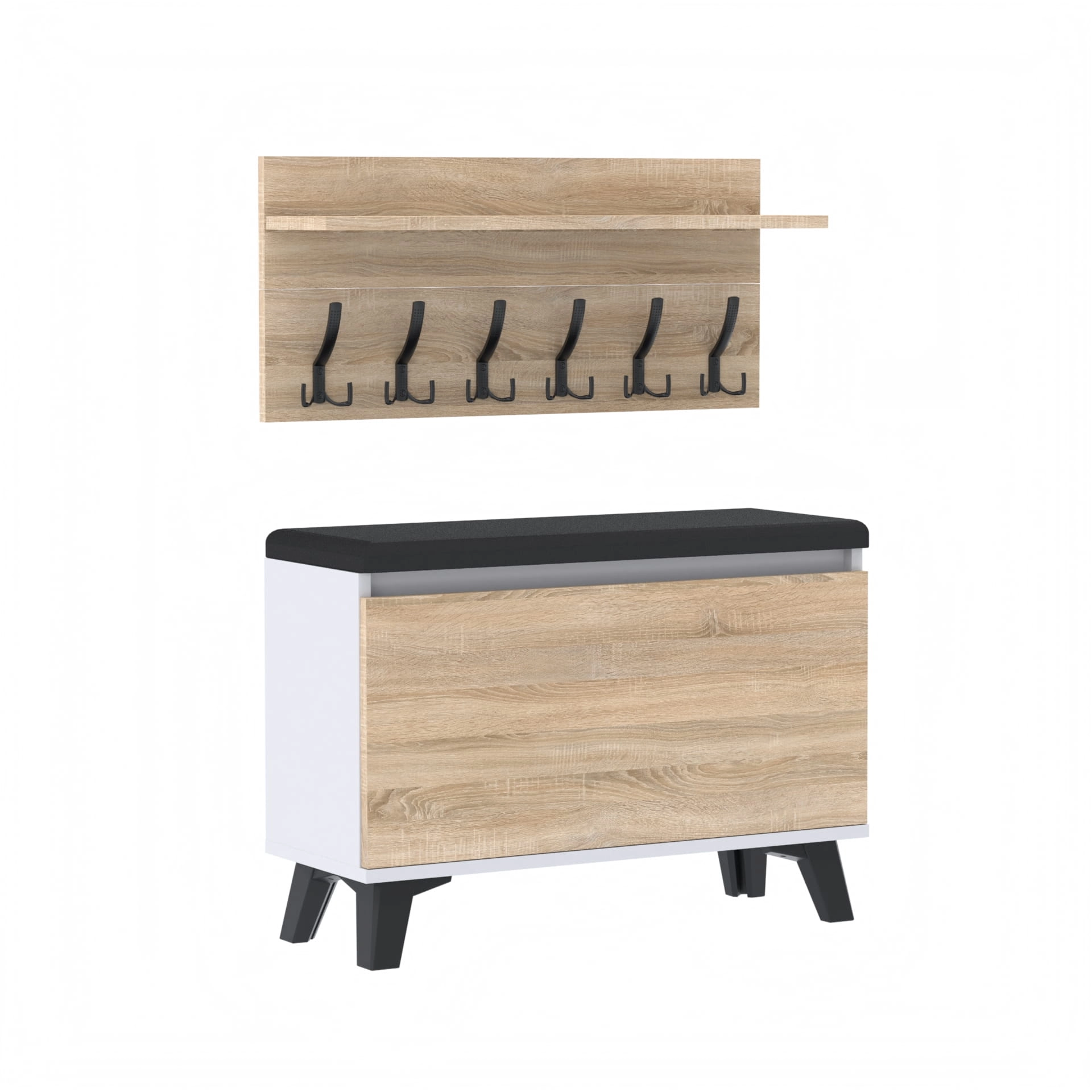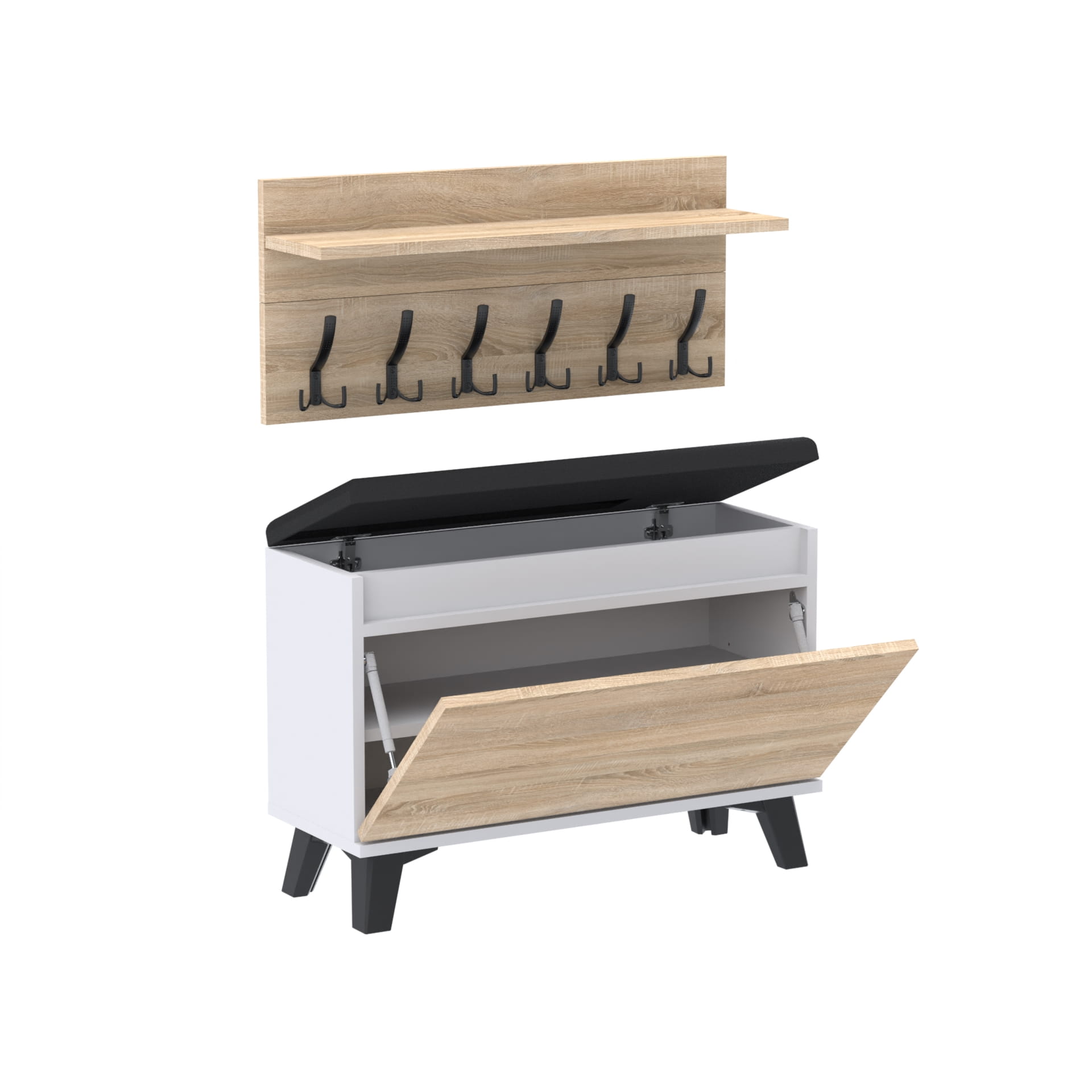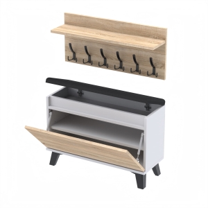 Szafka na buty z siedziskiem tapicerowanym, schowkiem plus wieszak ścienny