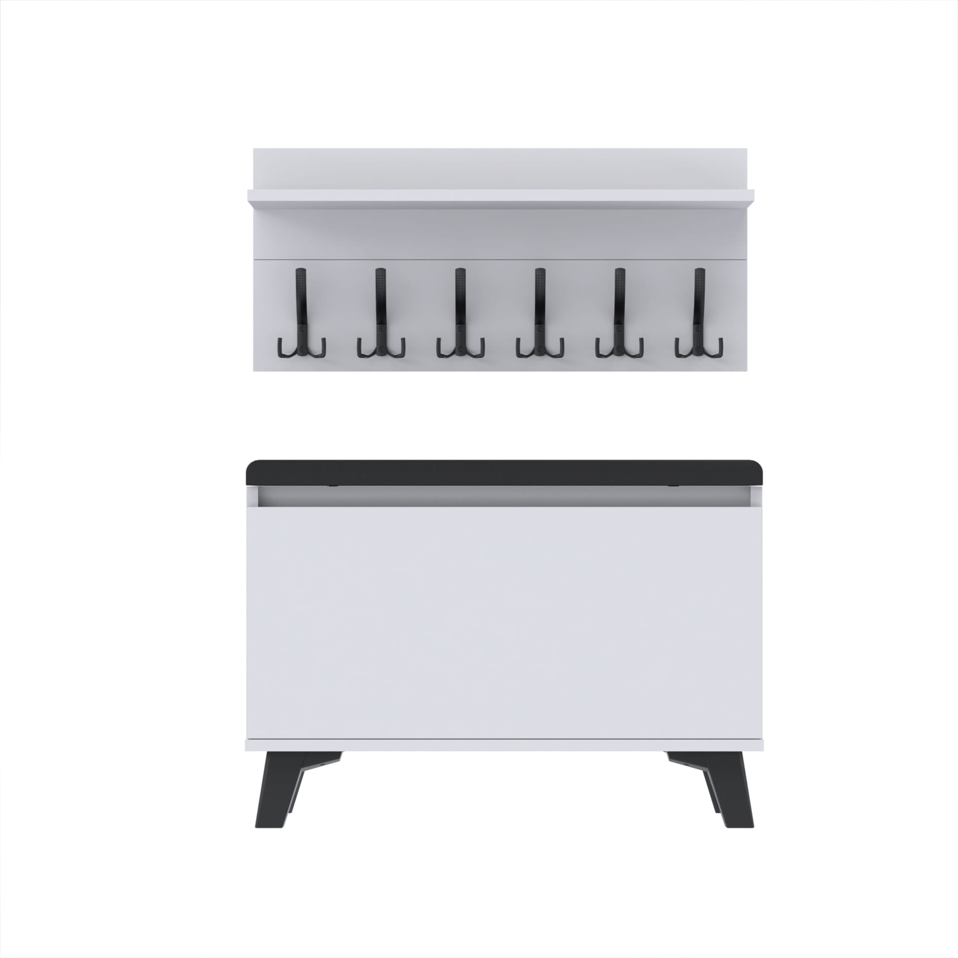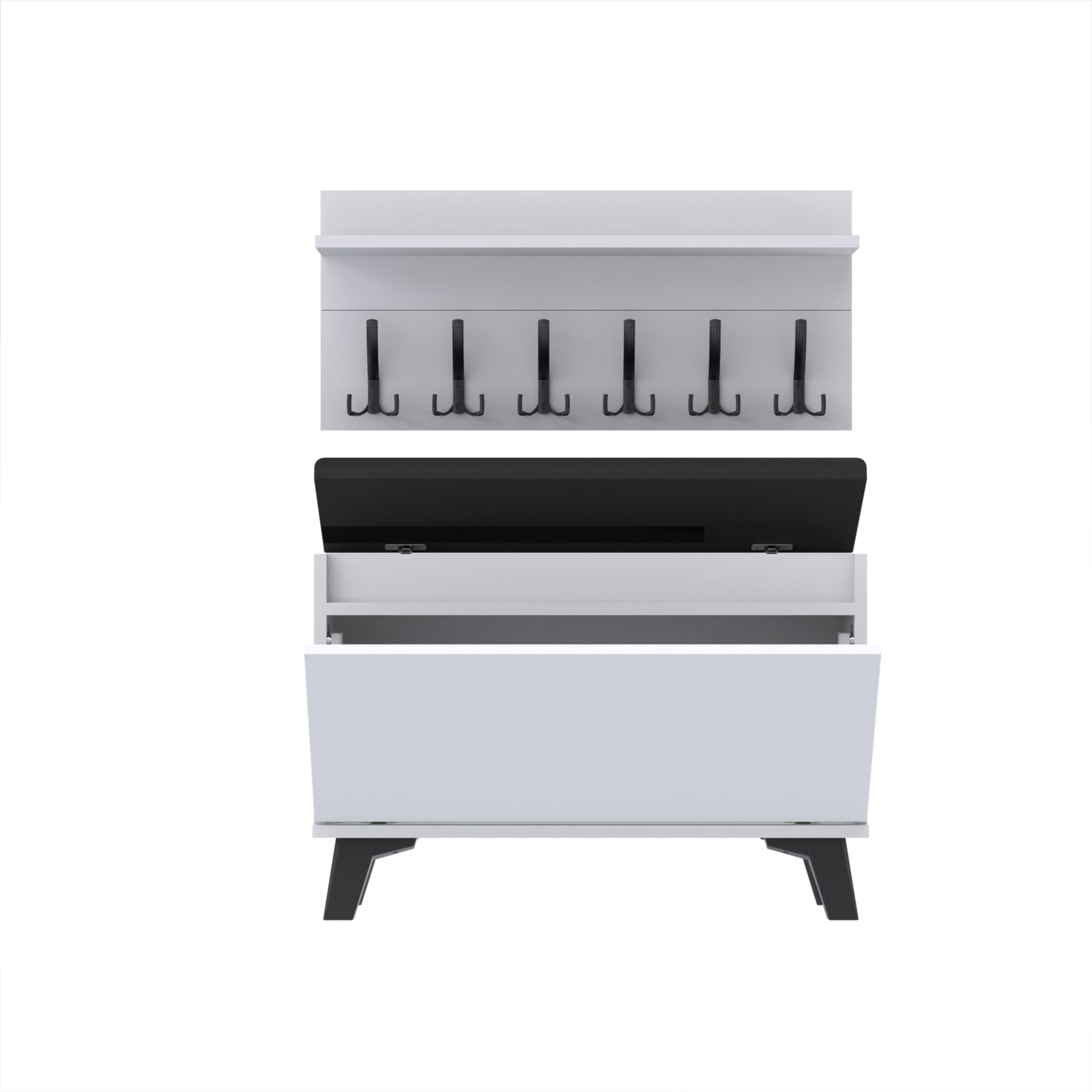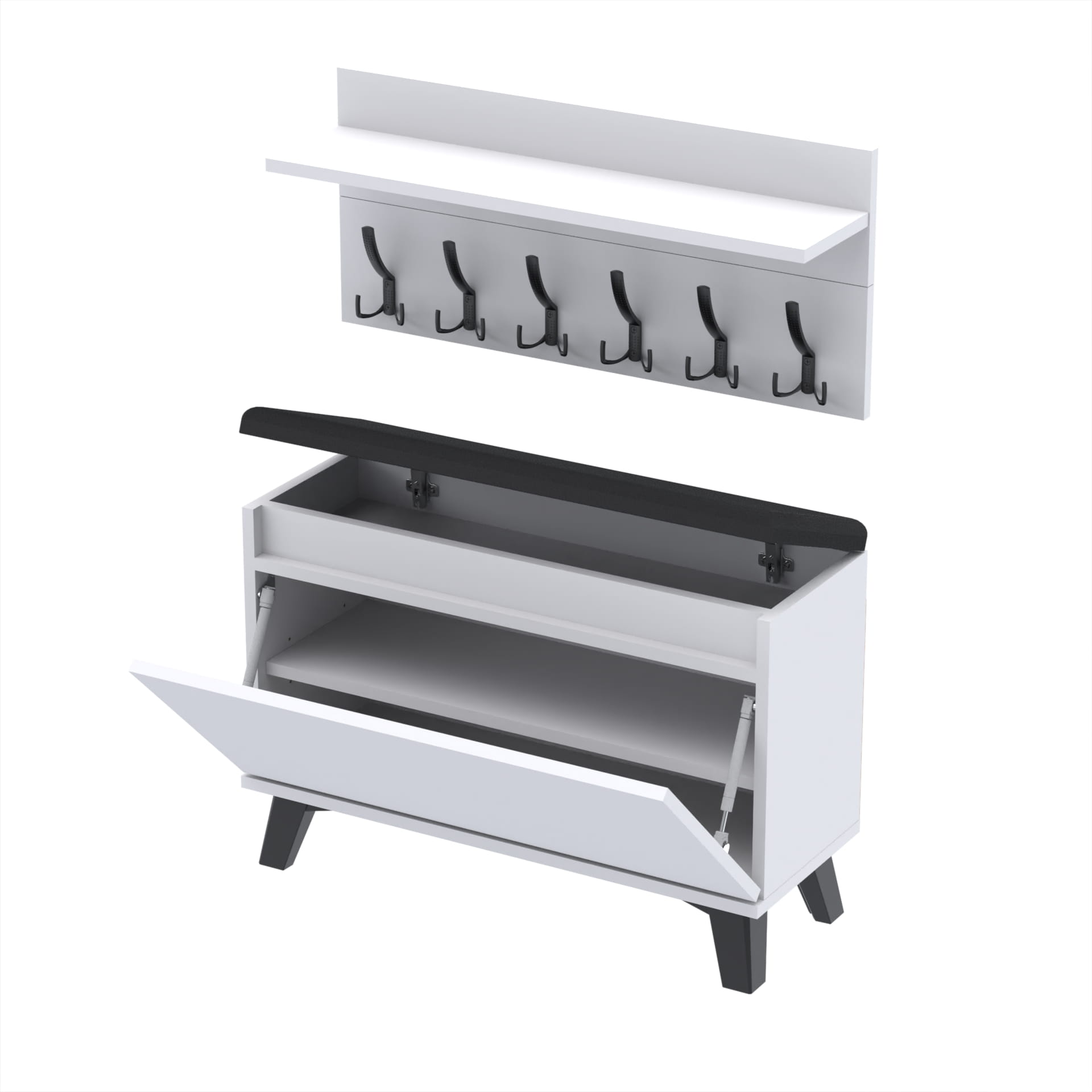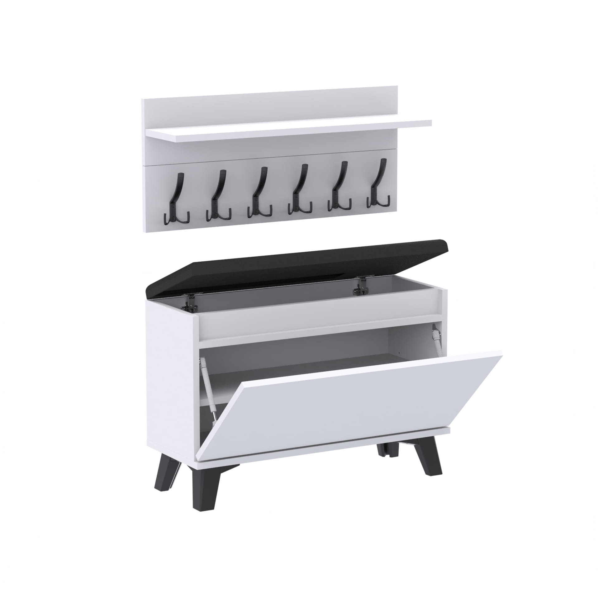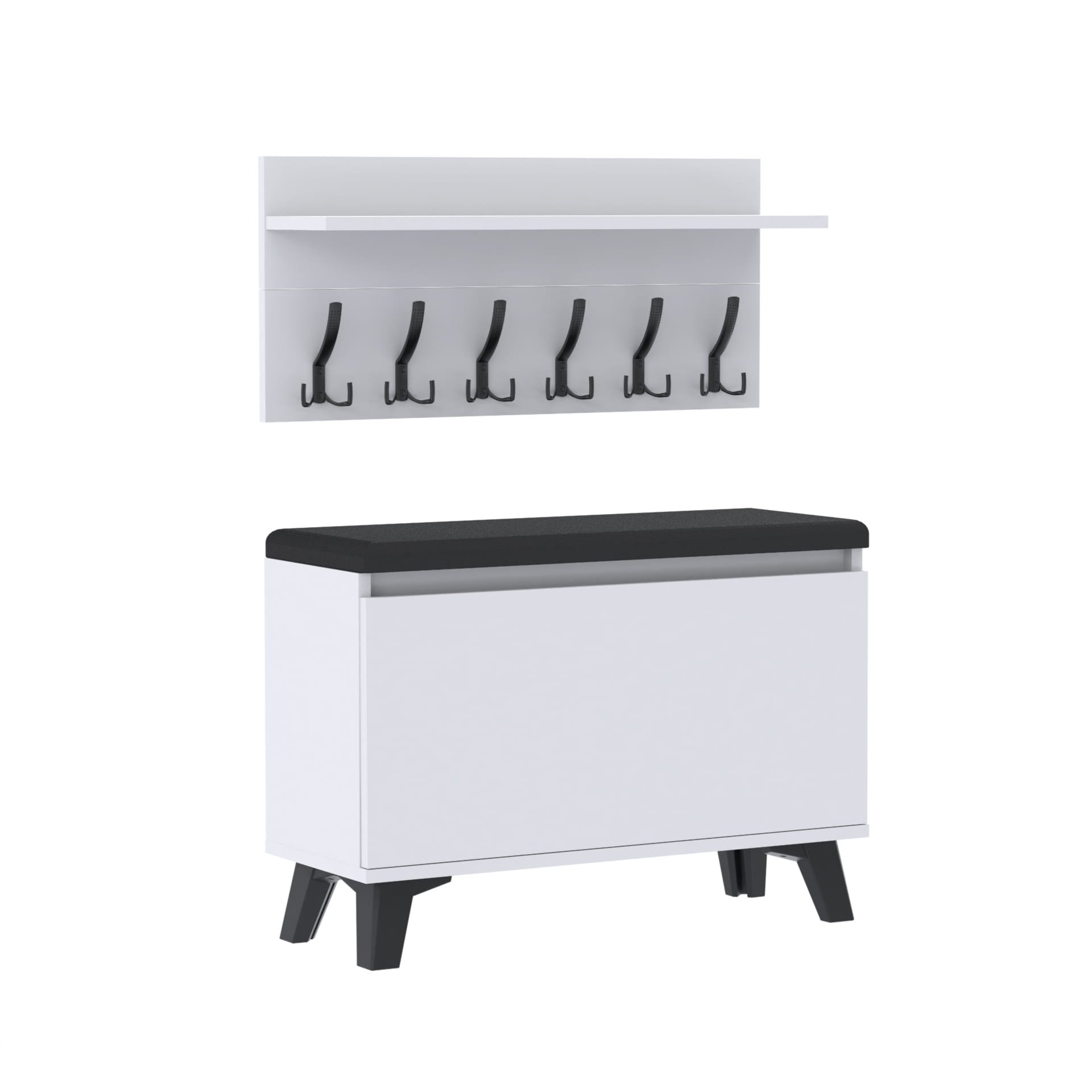 Szafka na buty z siedziskiem tapicerowanym, schowkiem plus wieszak ścienny