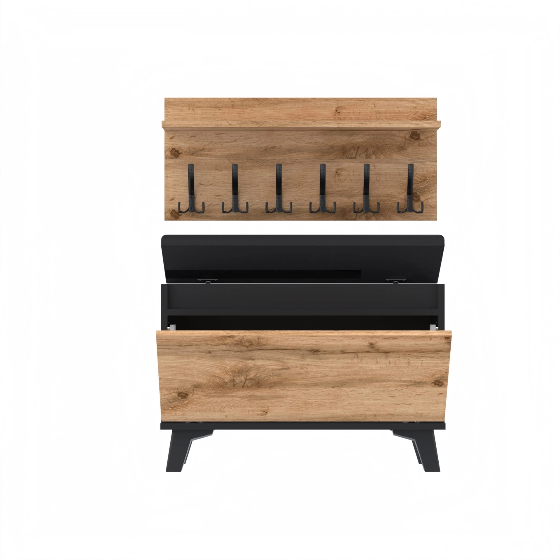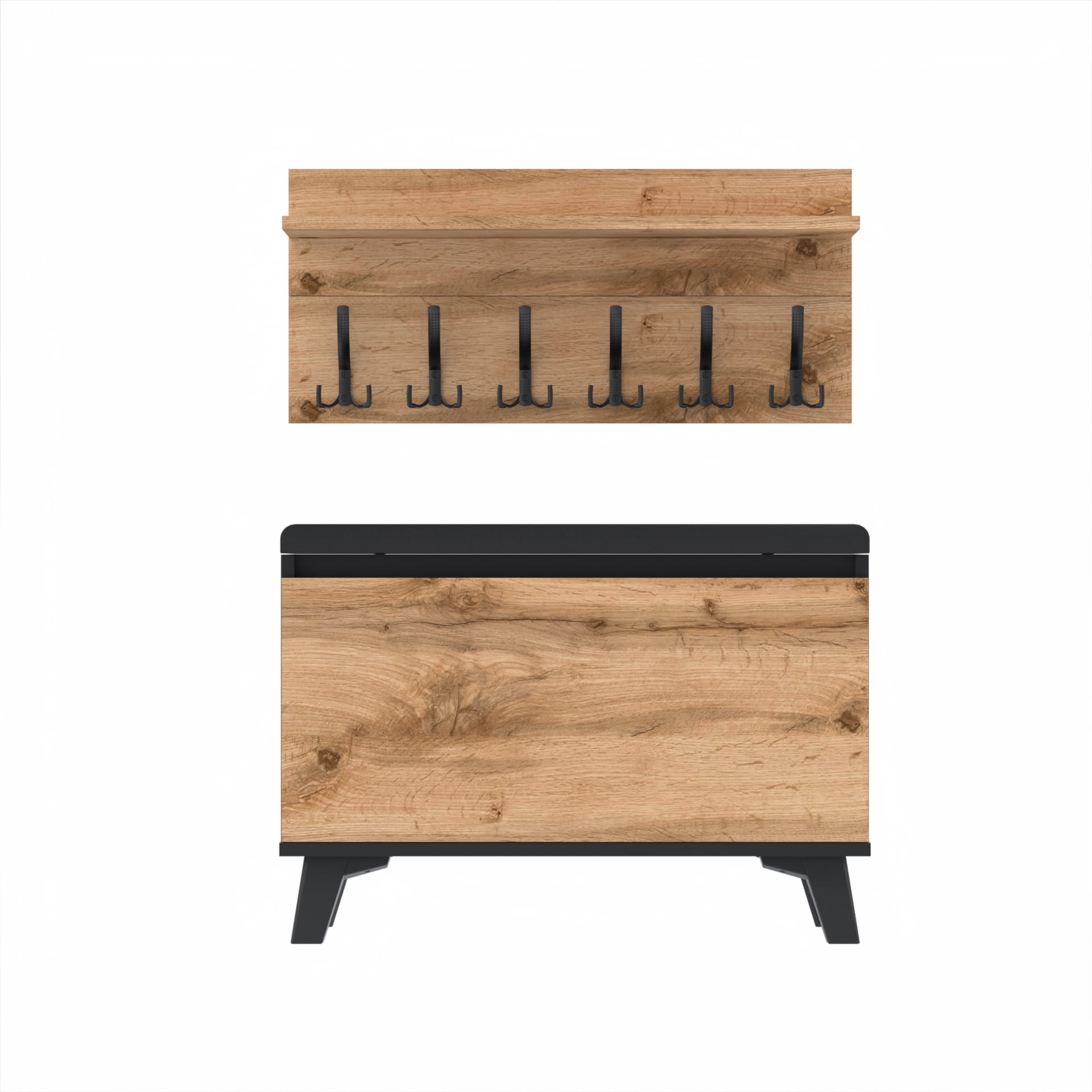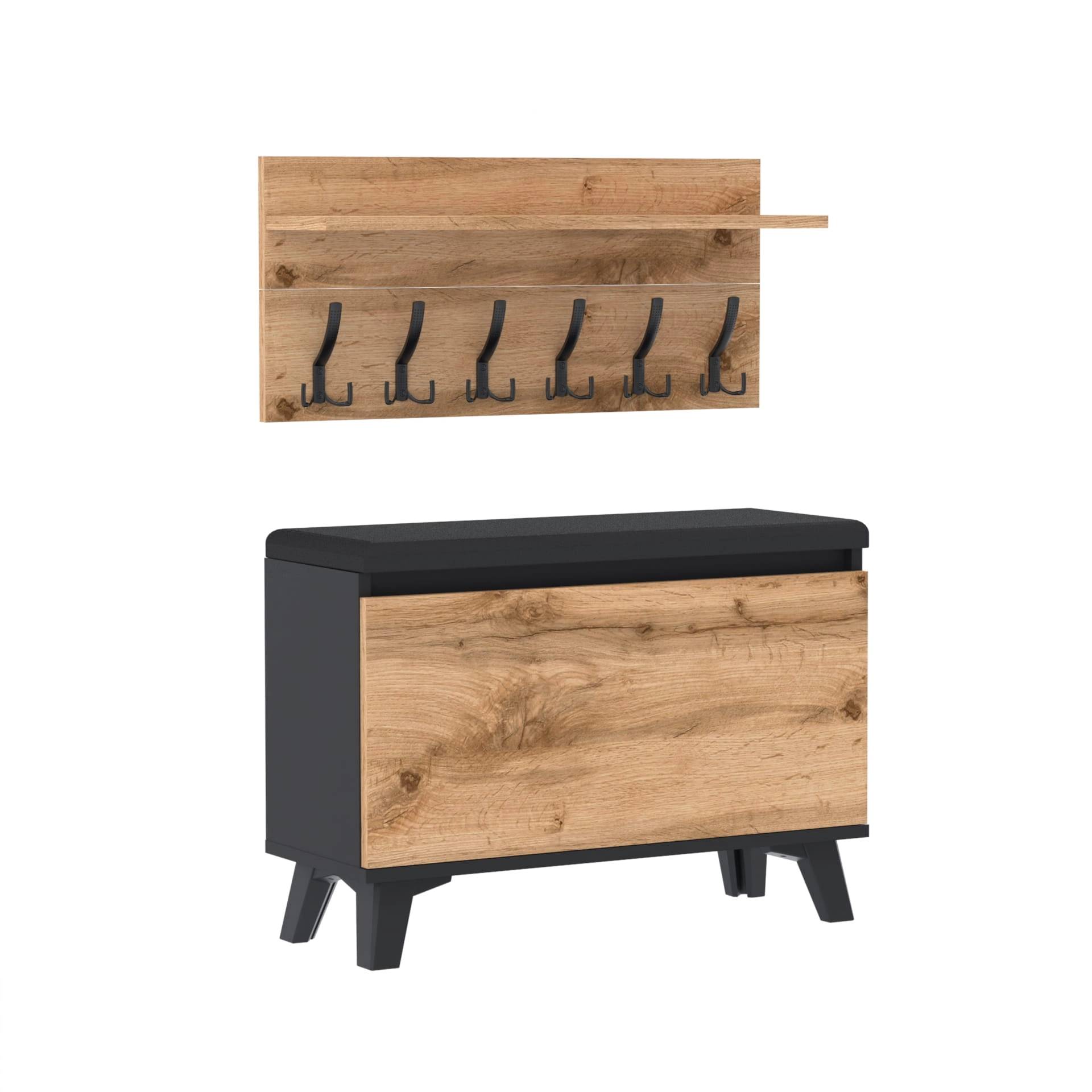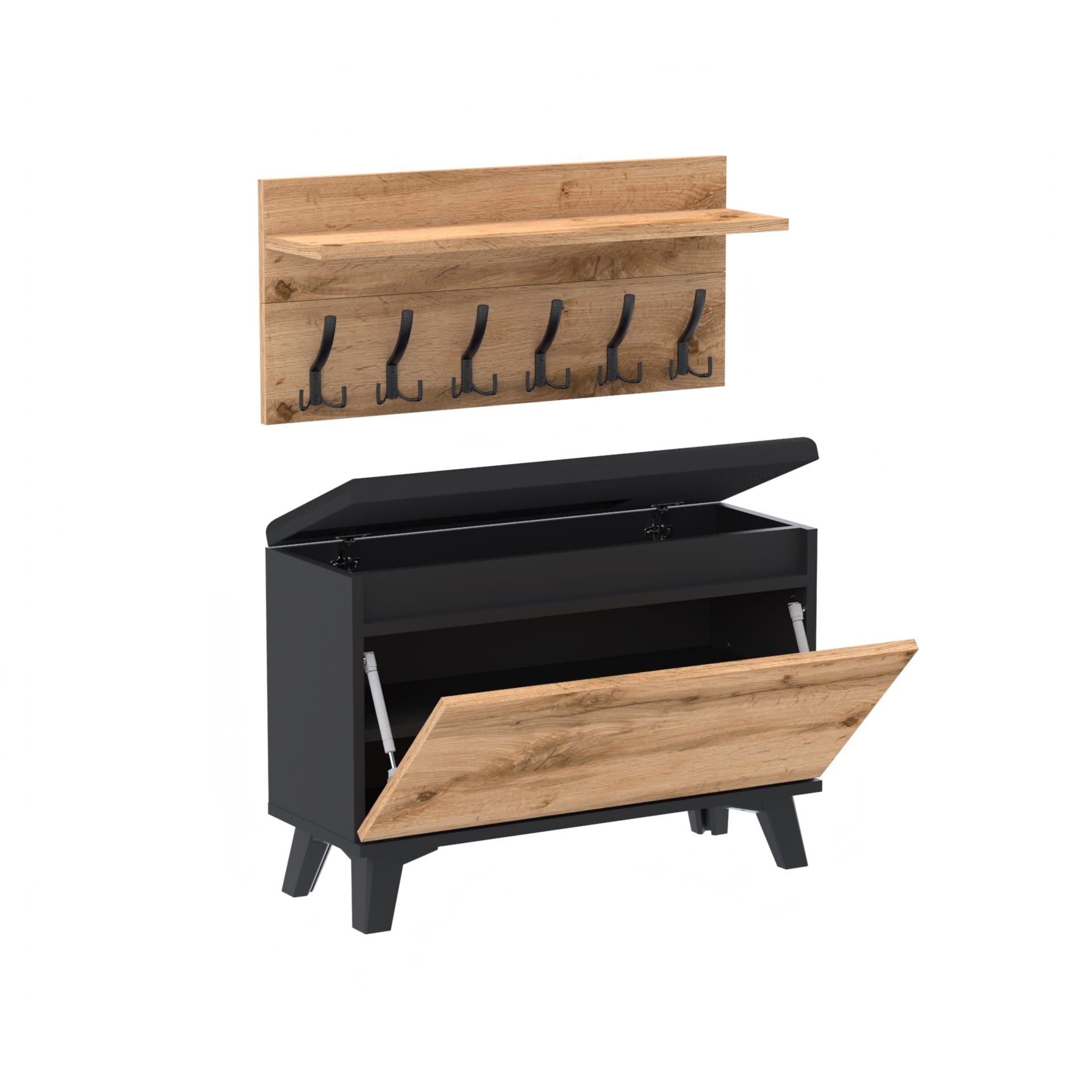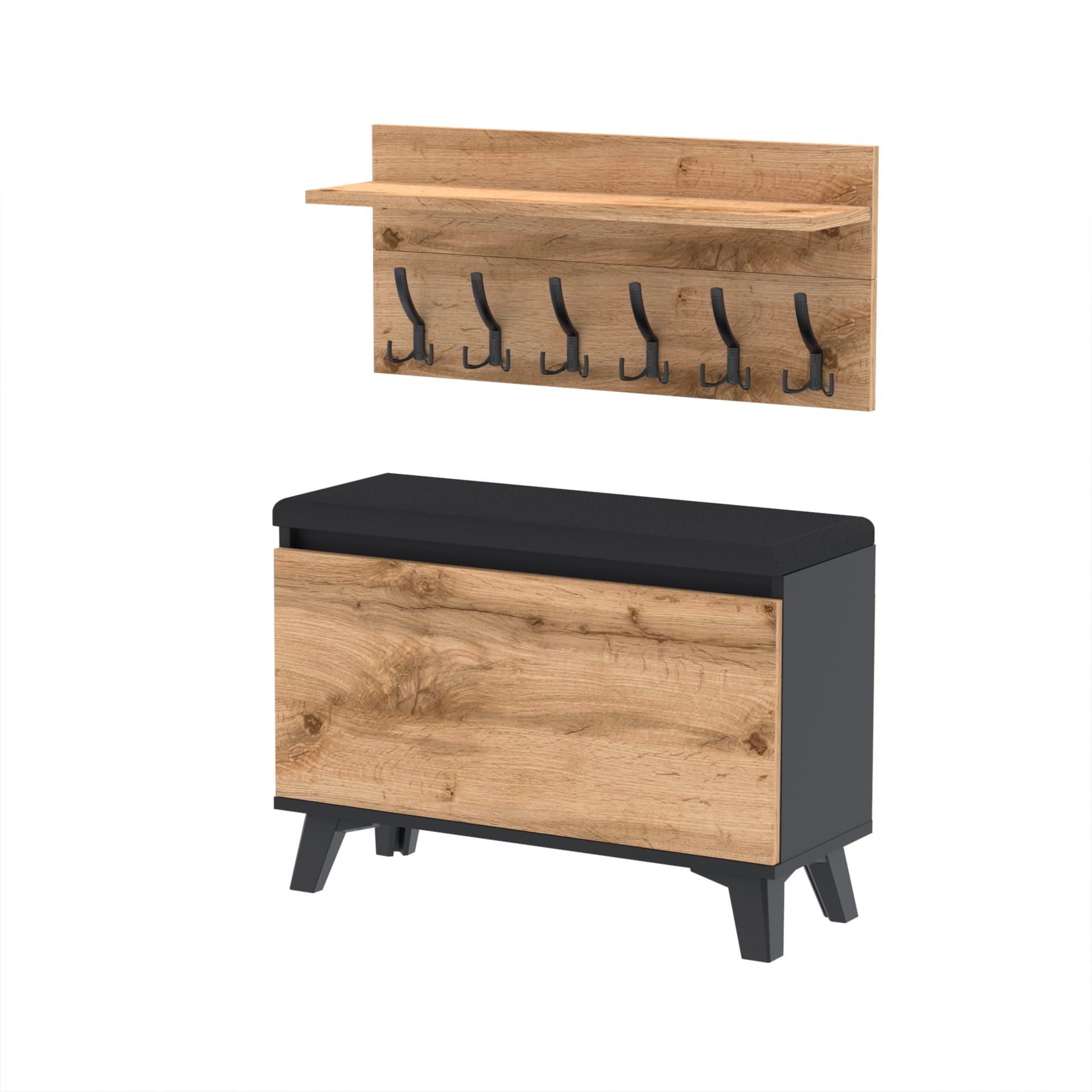 Szafka na buty z siedziskiem tapicerowanym, schowkiem plus wieszak ścienny