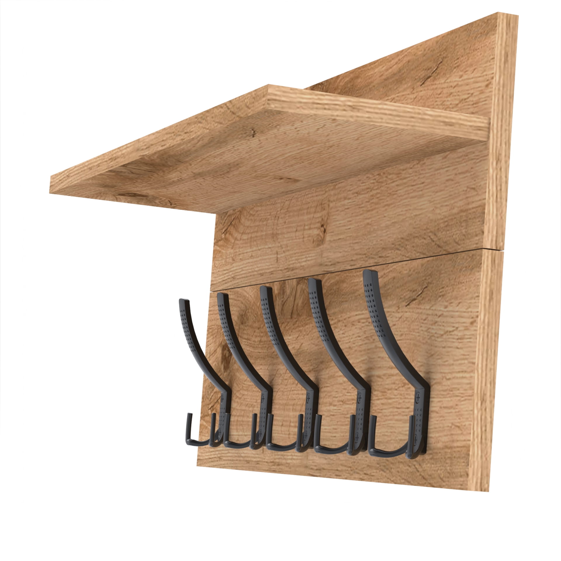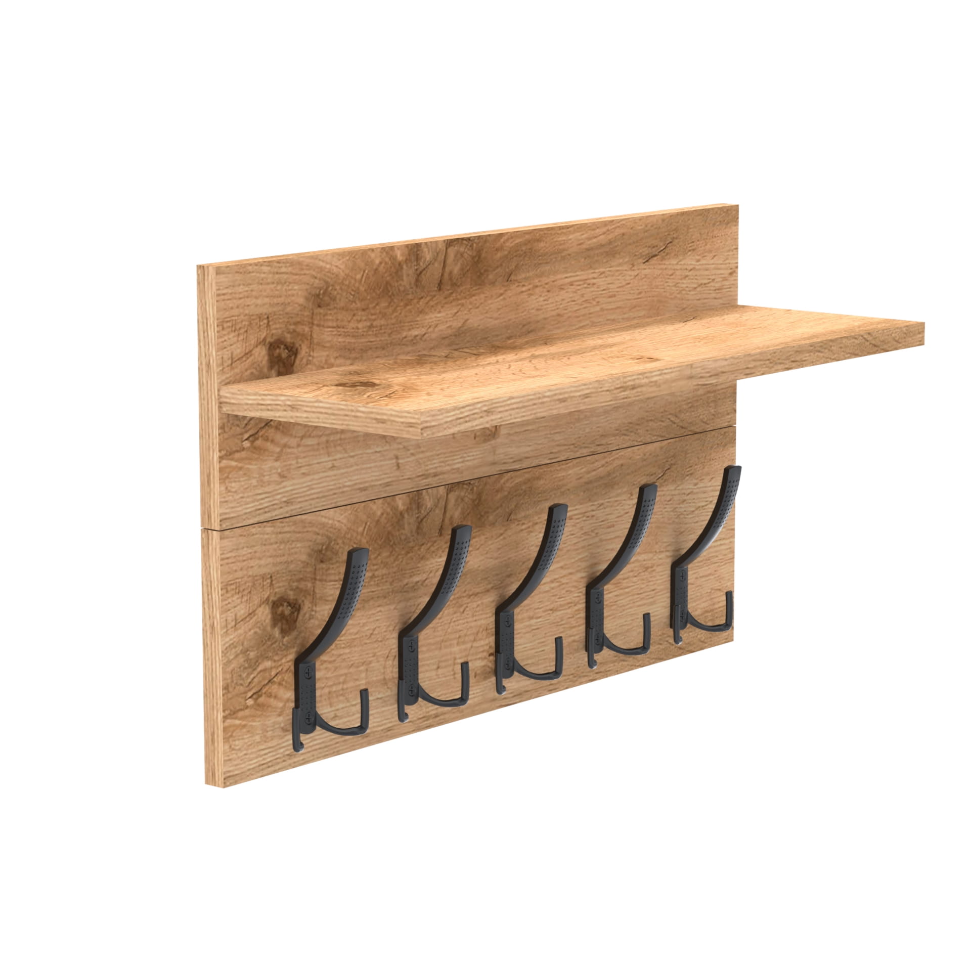 Konstrukcja: Wieszak składa się z dwóch harmonijnie połączonych części: wieszak i półka. Zarówno płyta tylna wieszaka, jak i półka, mają po 18 cm wysokości, co nadaje całości spójnego i nowoczesnego wyglądu.