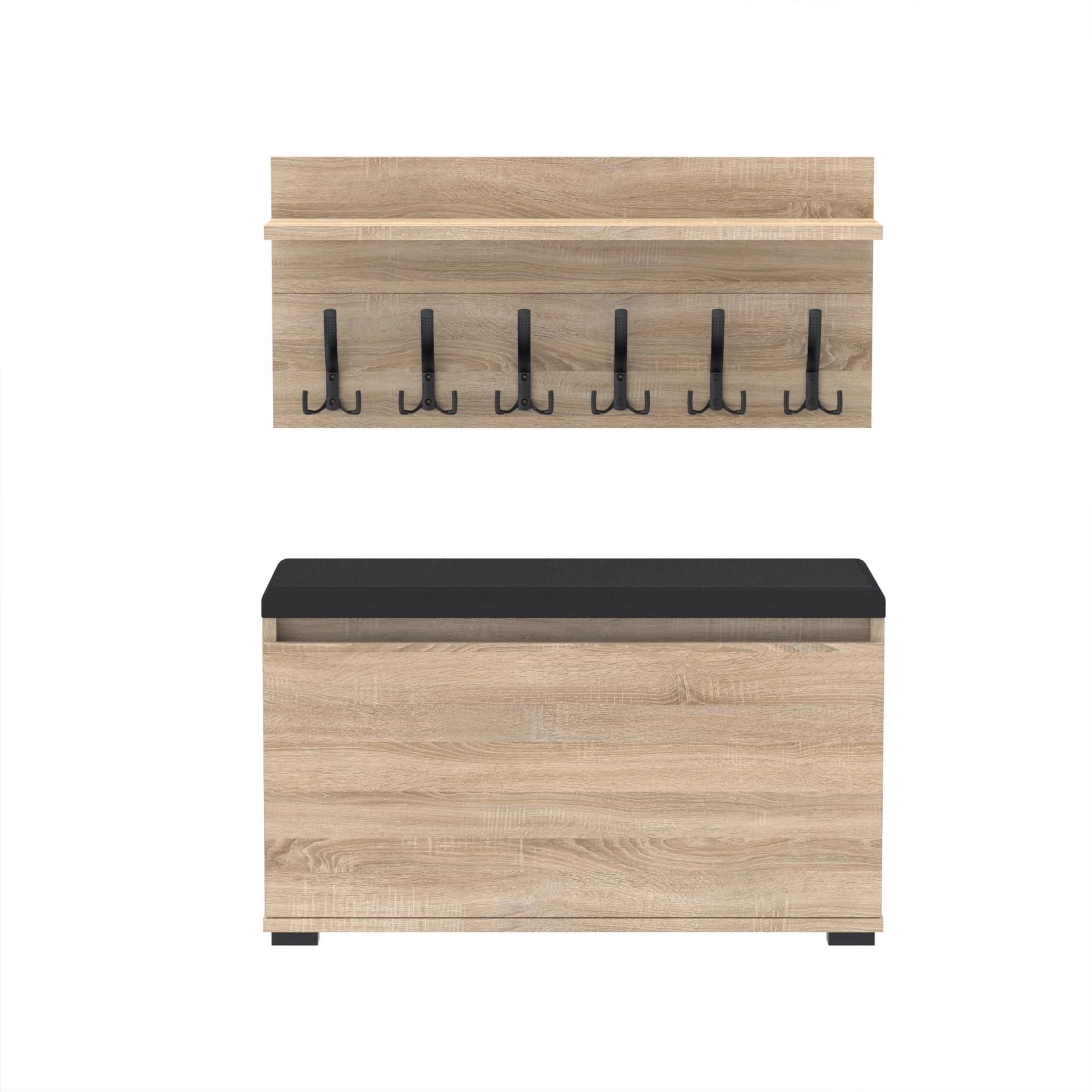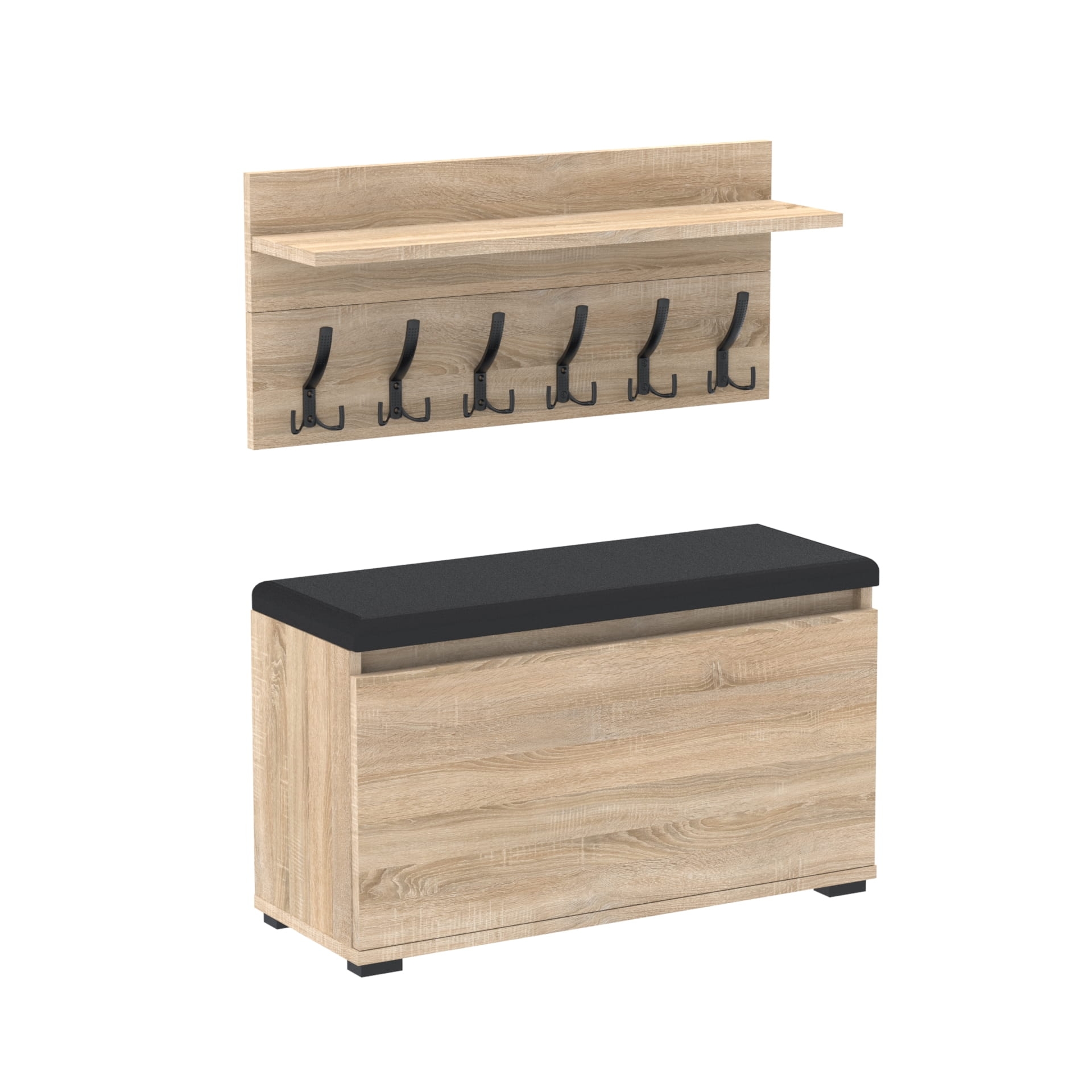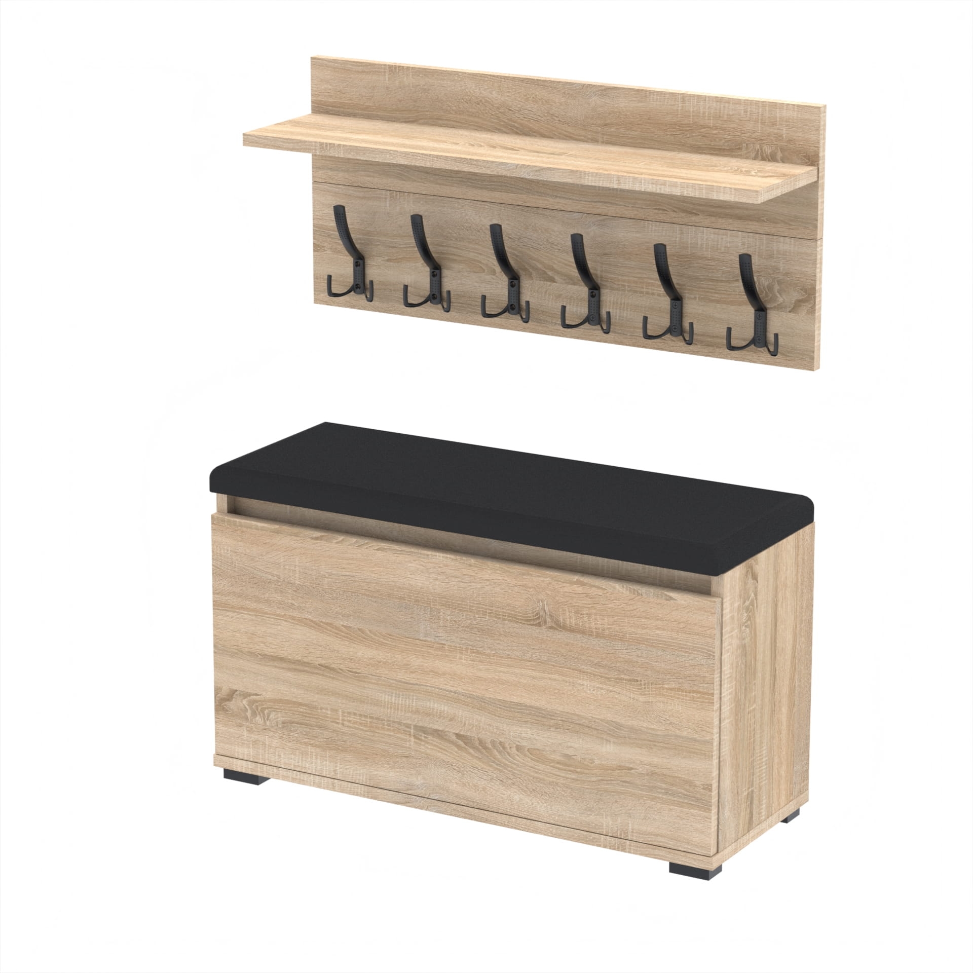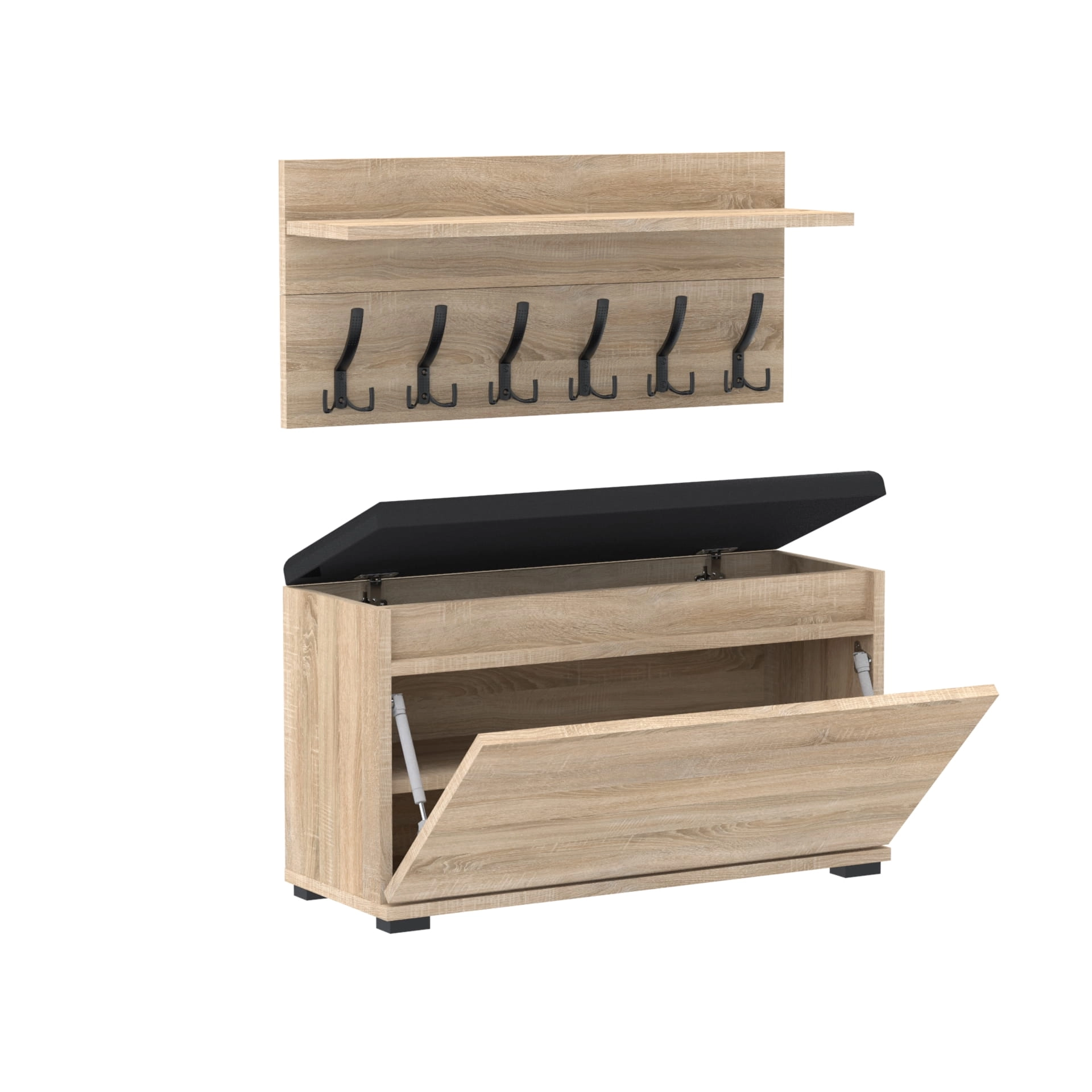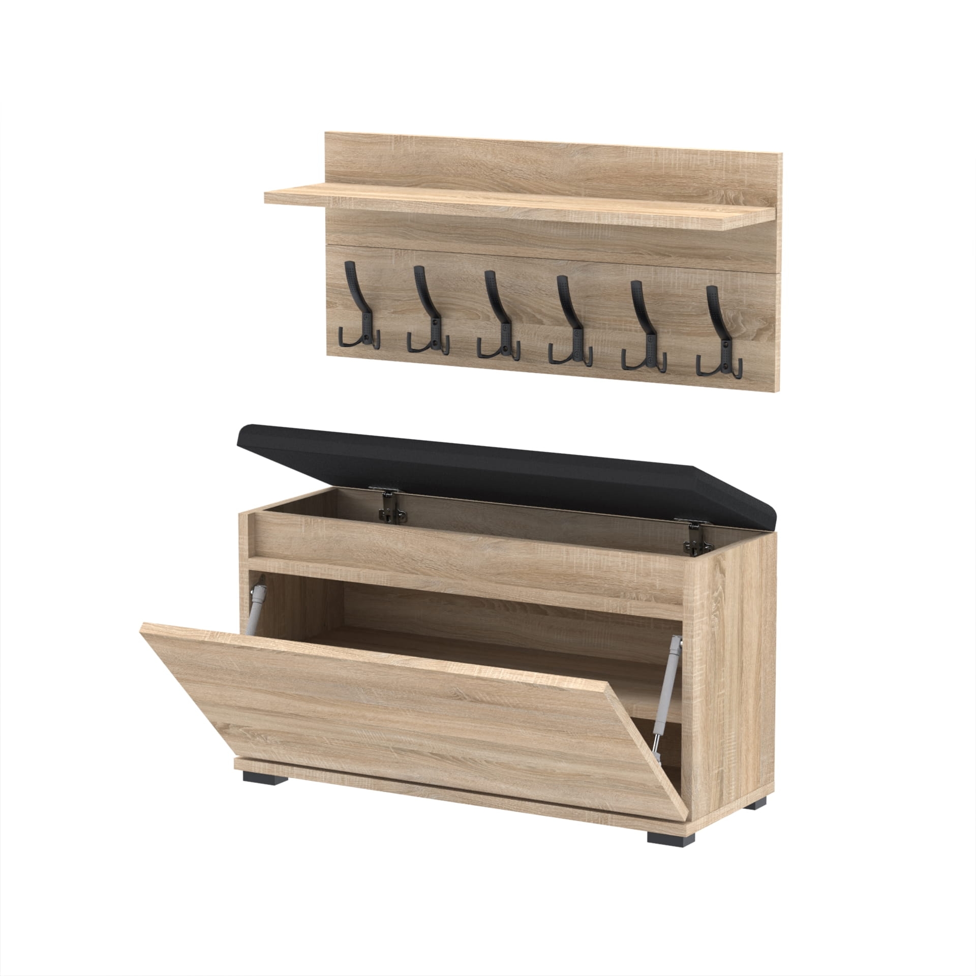 Szafka na buty z siedziskiem tapicerowanym, schowkiem plus wieszak ścienny