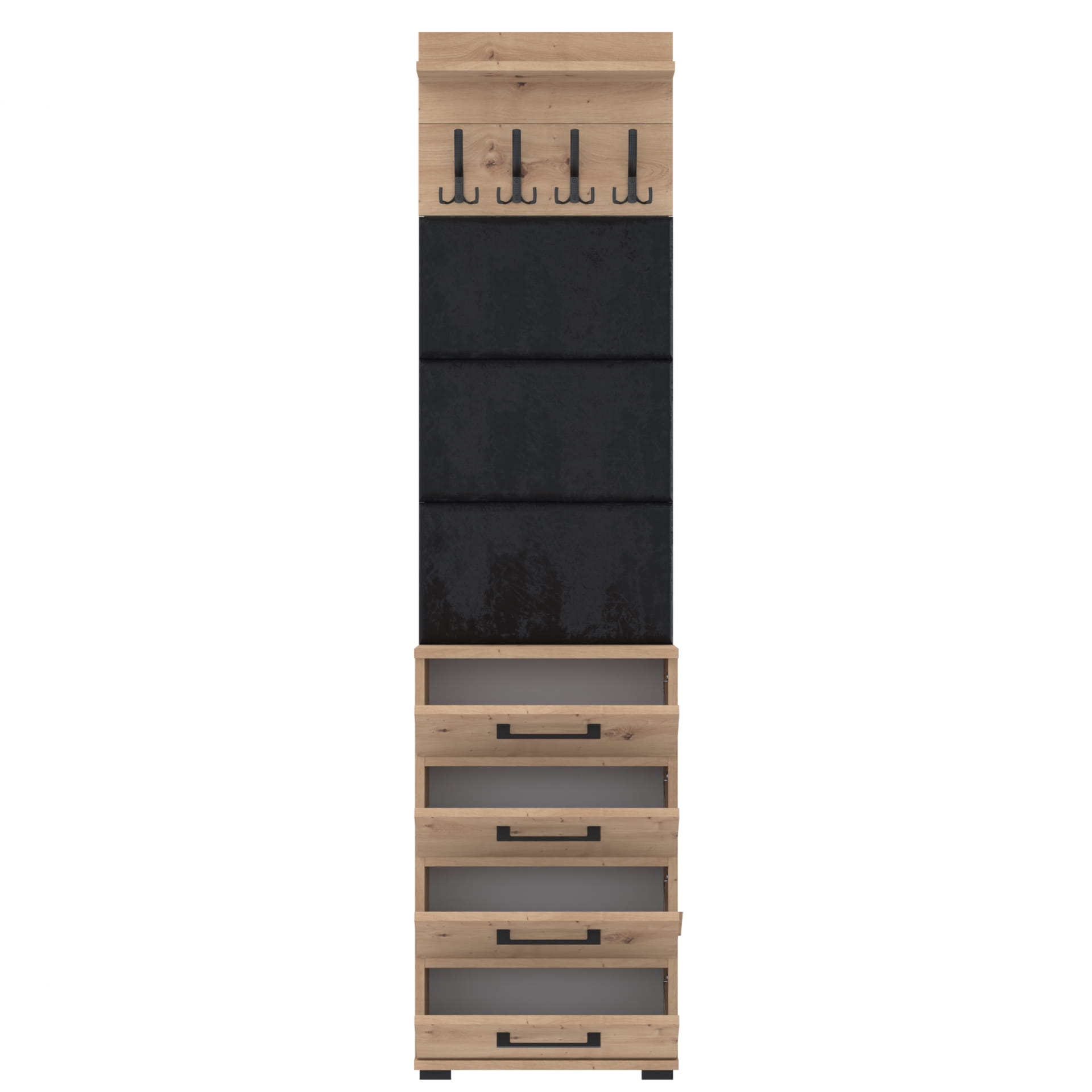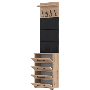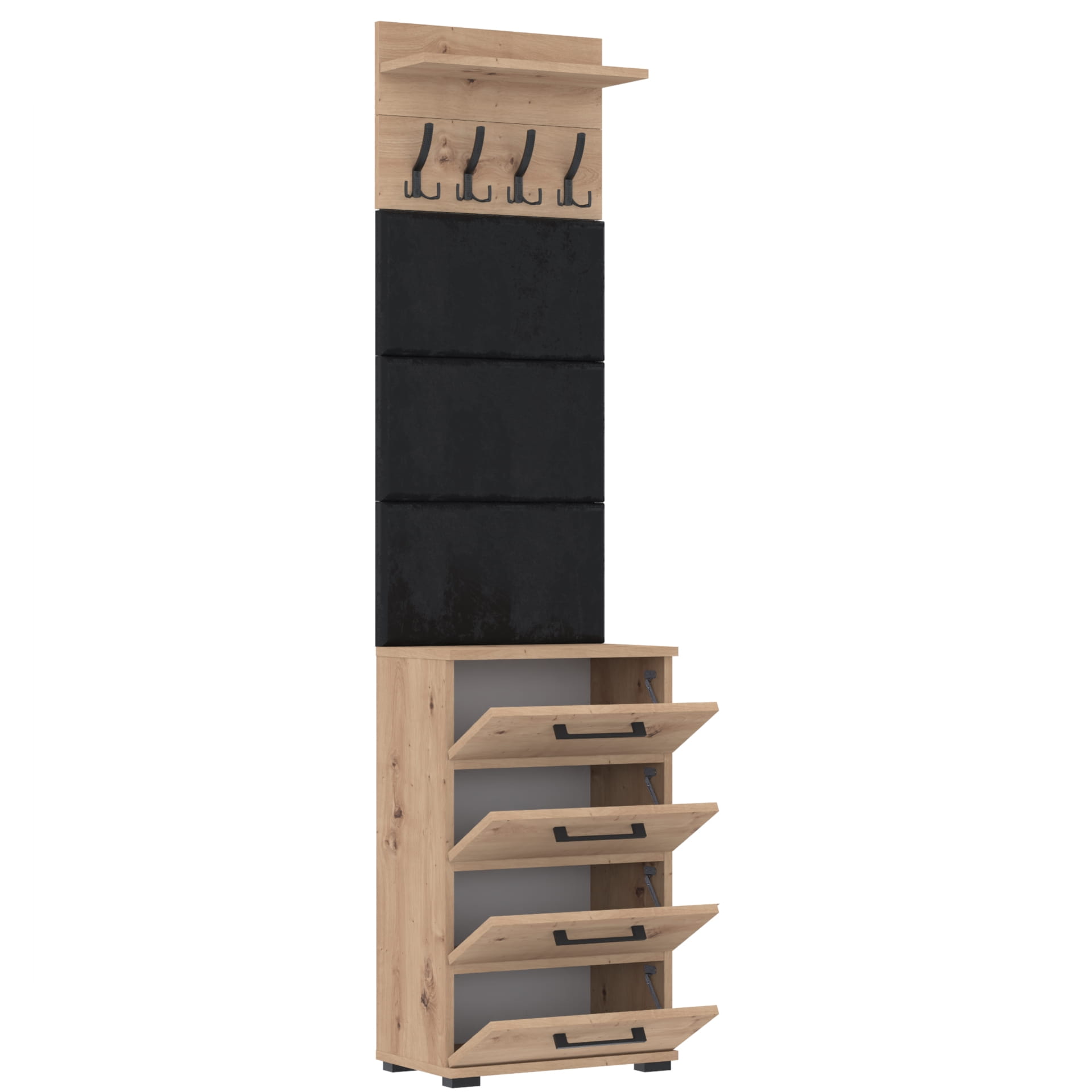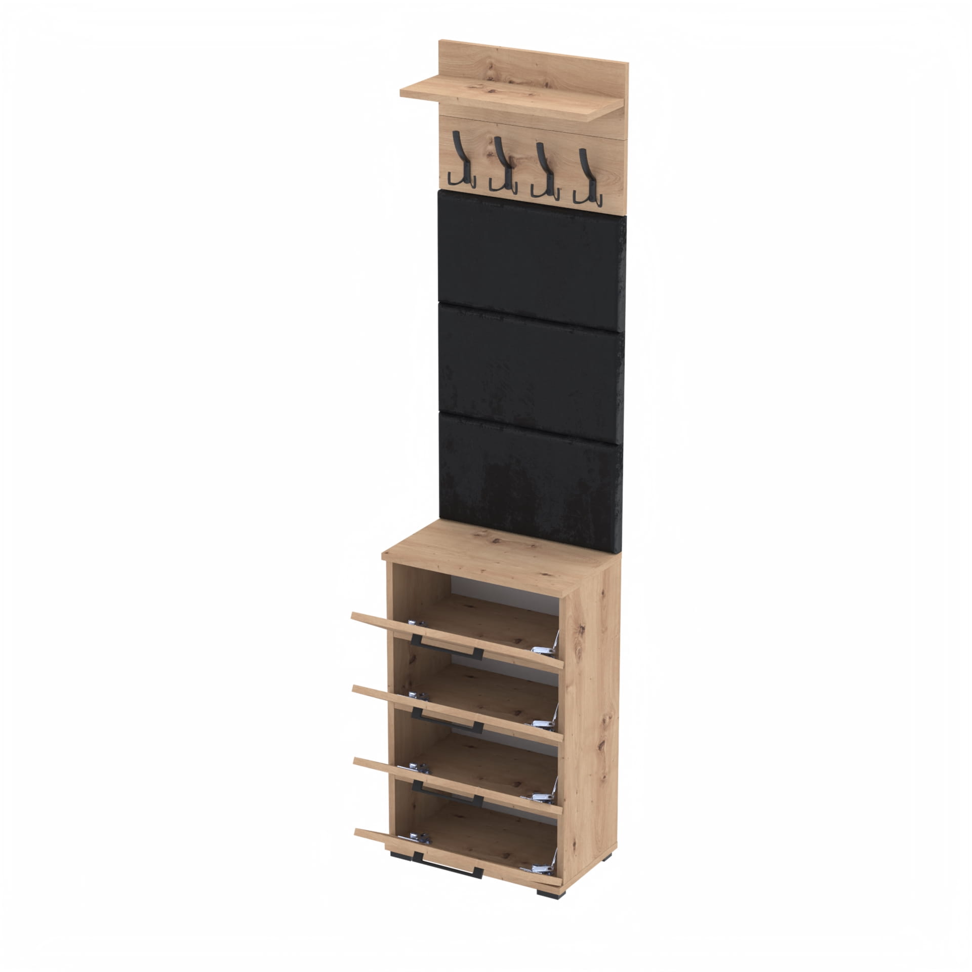 Zestaw składa się z różnorodnych elementów - szafki ALTUS z 4 półkami na buty, paneli ściennych oraz wieszaka. Te elementy razem tworzą harmonijną całość, ale mogą być również ustawiane w dowolnej konfiguracji, zgodnie z indywidualnymi potrzebami i preferencjami.