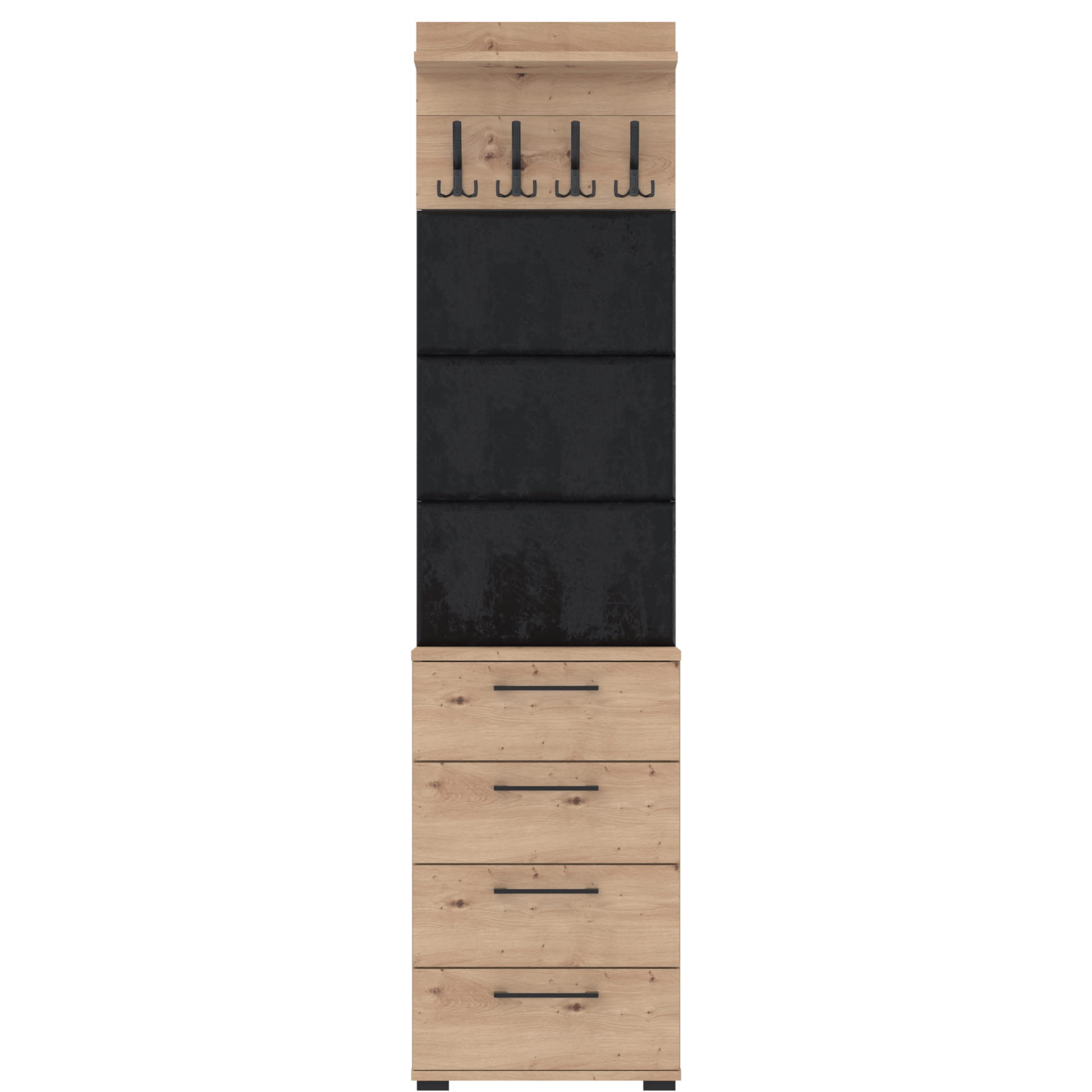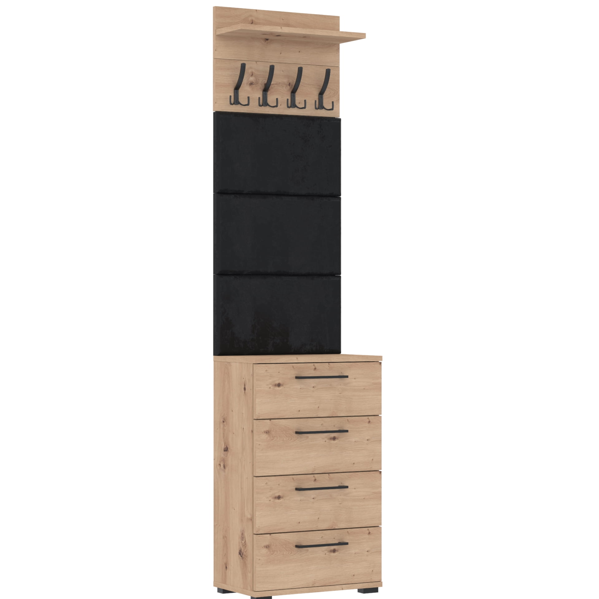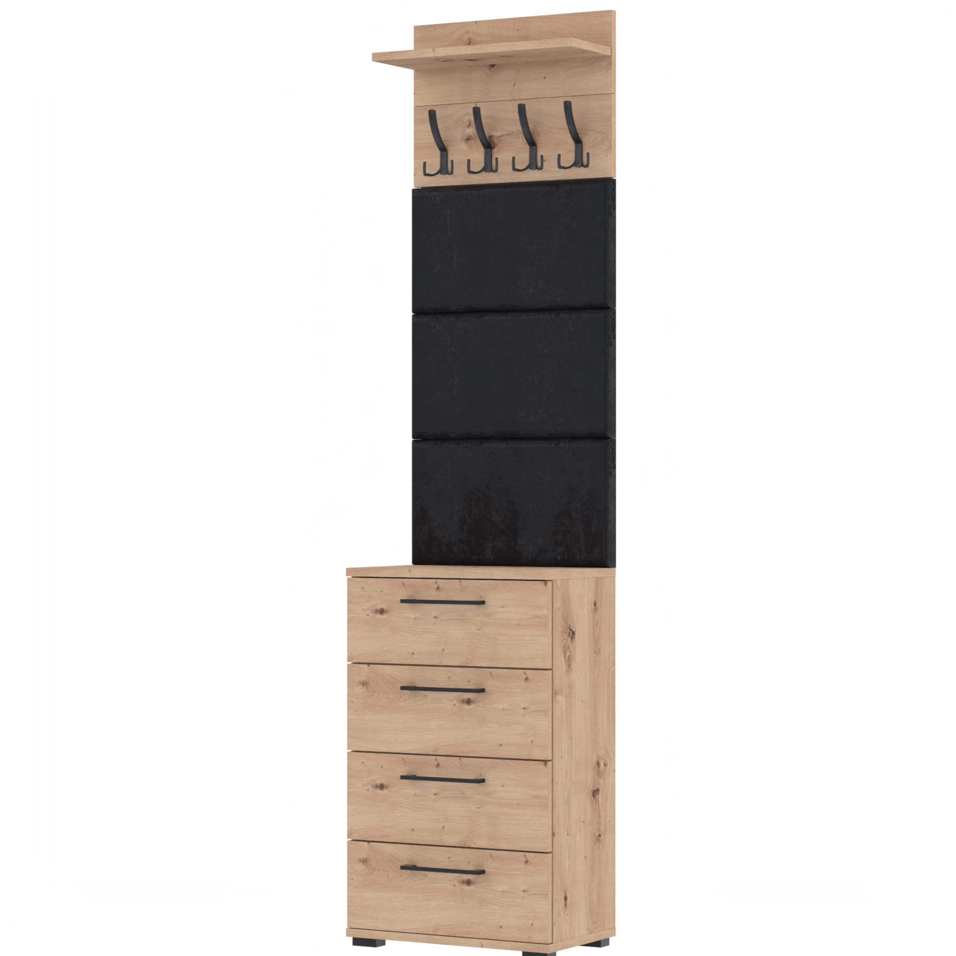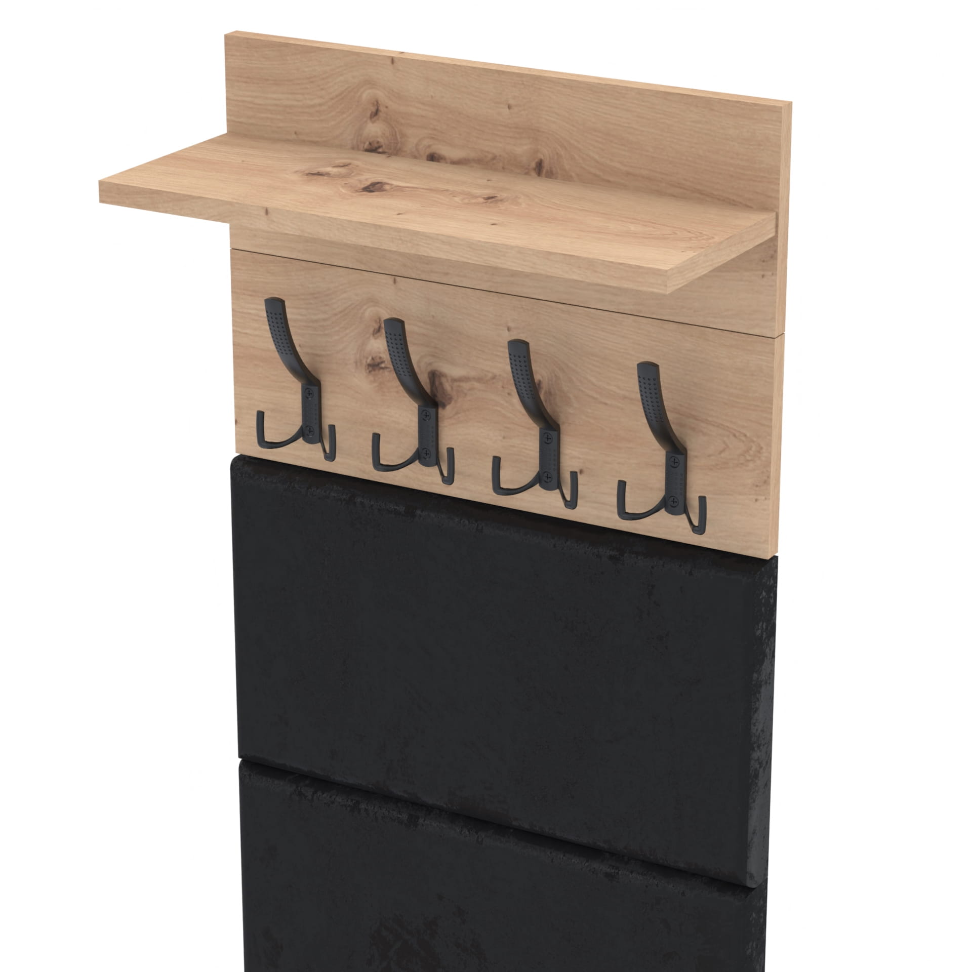 Zestaw składa się z różnorodnych elementów - szafki ALTUS z 4 półkami na buty, paneli ściennych oraz wieszaka. Te elementy razem tworzą harmonijną całość, ale mogą być również ustawiane w dowolnej konfiguracji, zgodnie z indywidualnymi potrzebami i preferencjami.