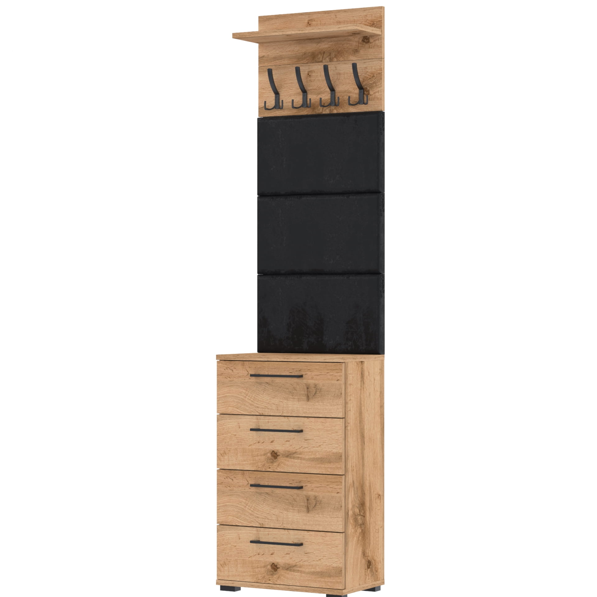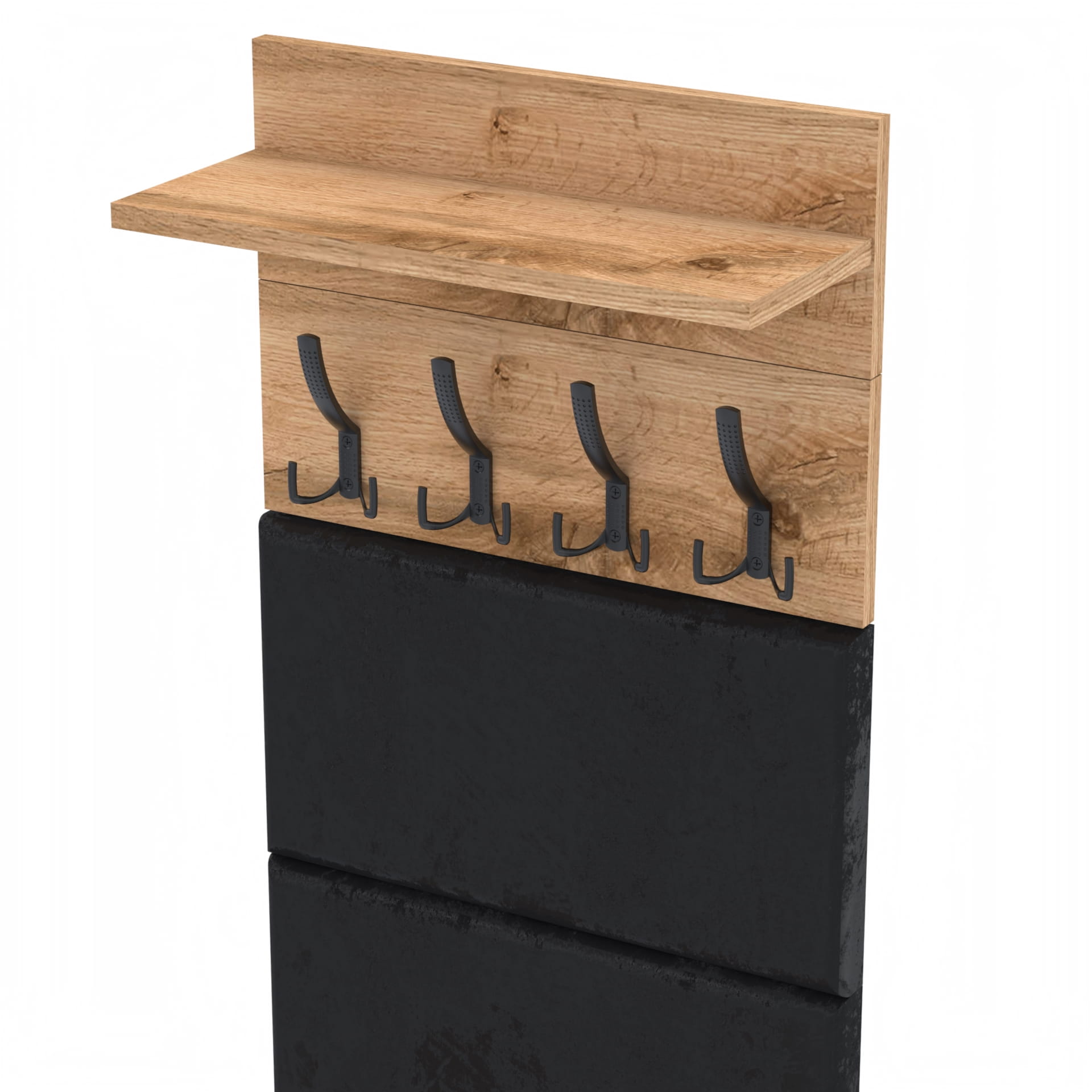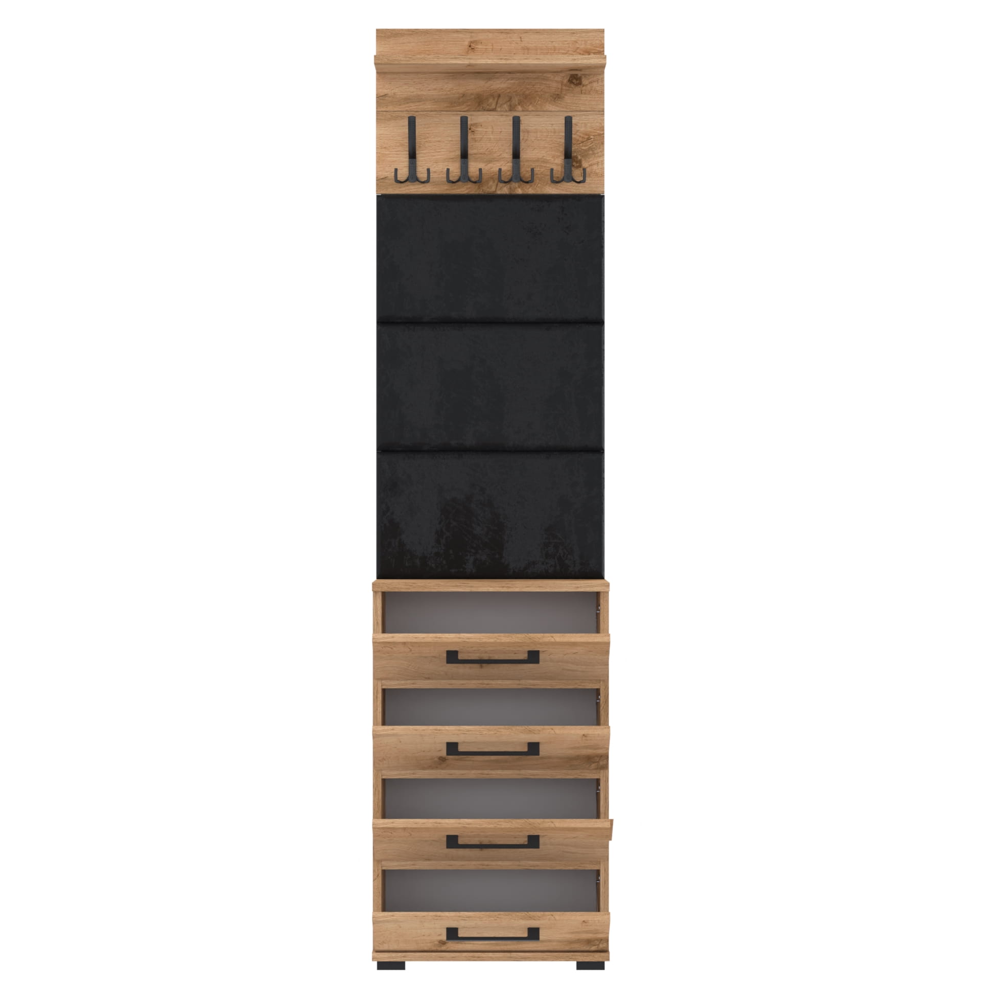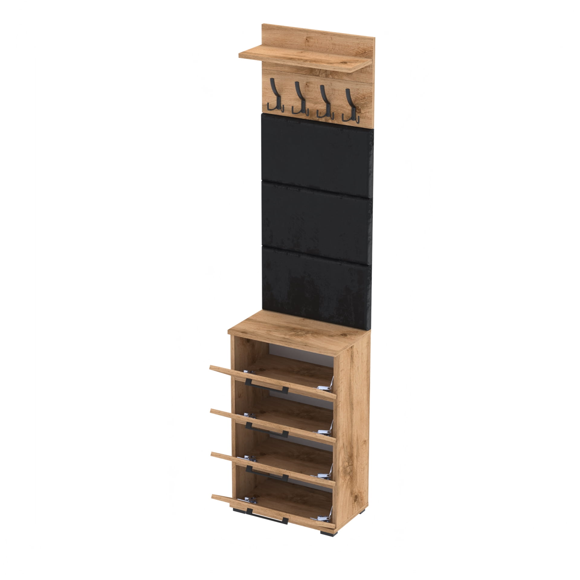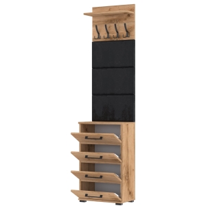 Zestaw składa się z różnorodnych elementów - szafki ALTUS z 4 półkami na buty, paneli ściennych oraz wieszaka. Te elementy razem tworzą harmonijną całość, ale mogą być również ustawiane w dowolnej konfiguracji, zgodnie z indywidualnymi potrzebami i preferencjami.