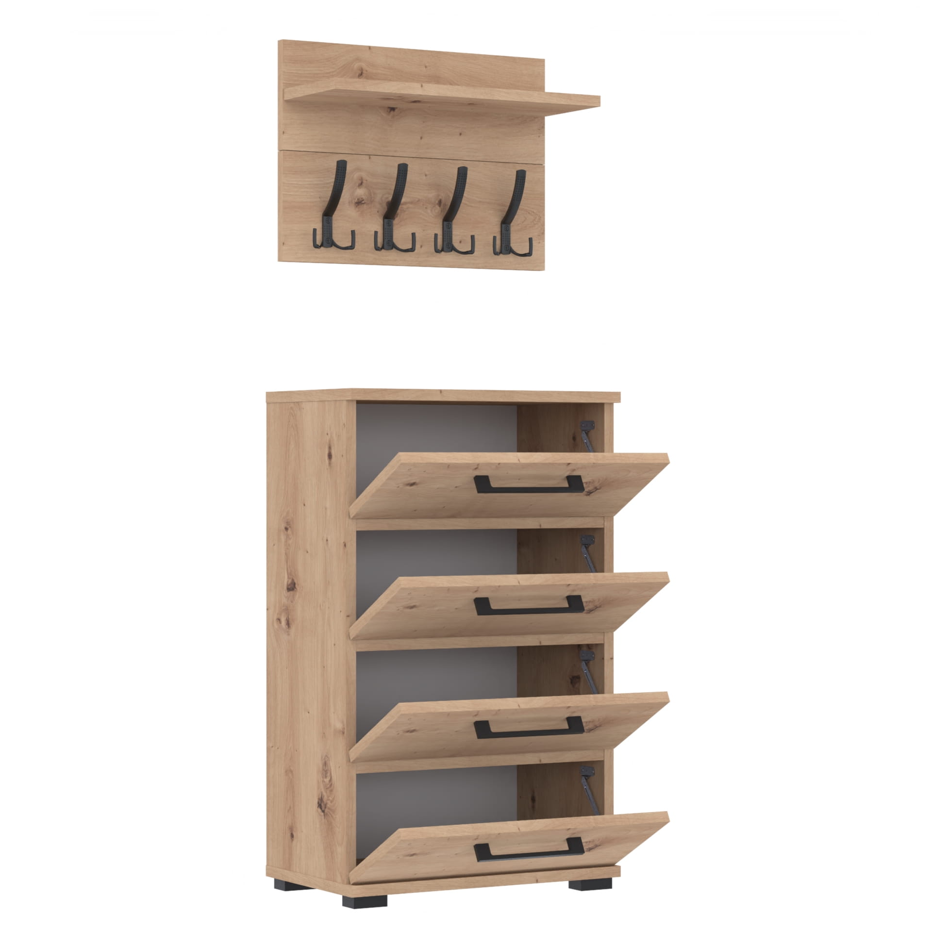 Zestaw składa się z komody ALTUS z czterema szafkami oraz wieszaka. Te elementy razem tworzą harmonijną całość, ale mogą być również ustawiane w dowolnej konfiguracji, zgodnie z indywidualnymi potrzebami i preferencjami.