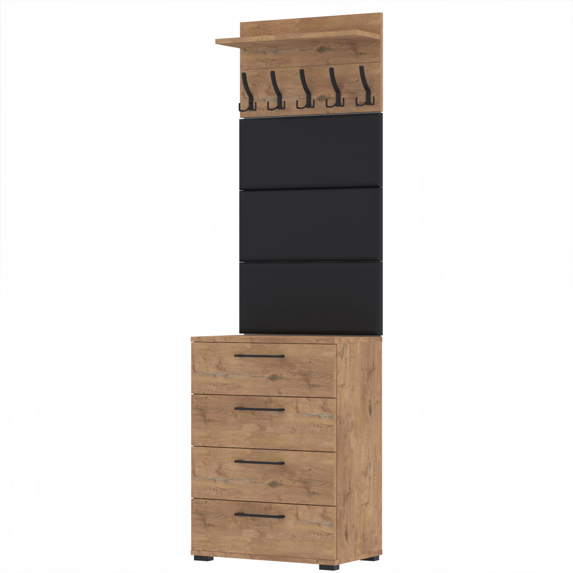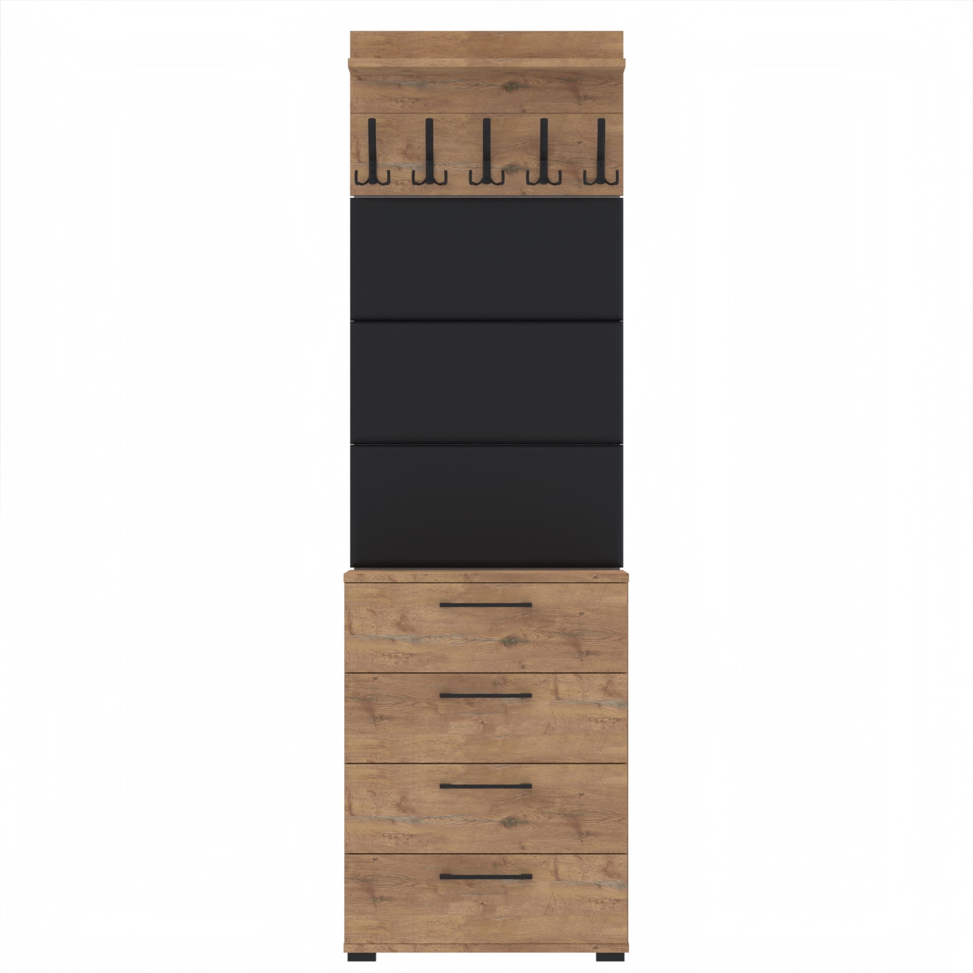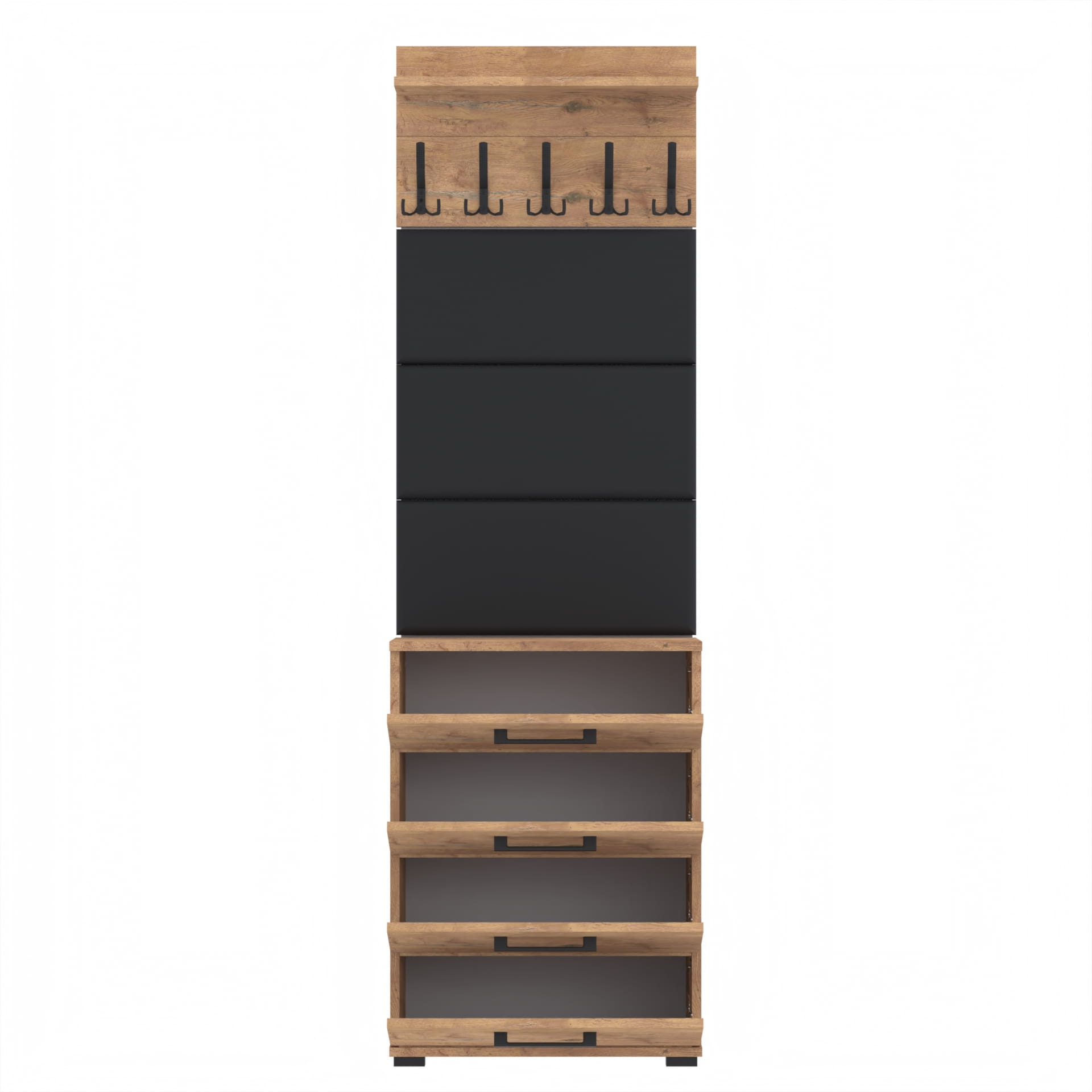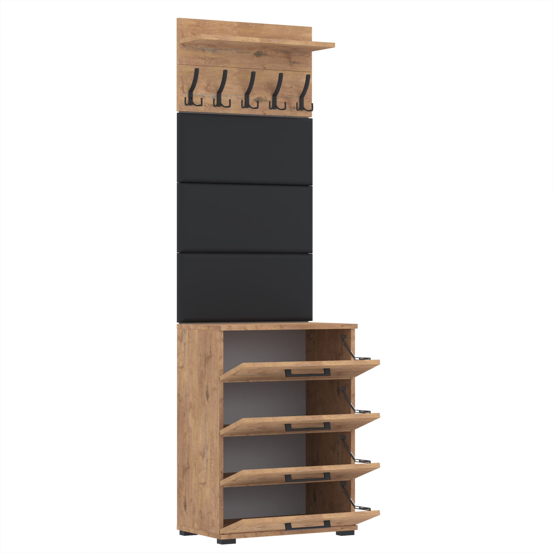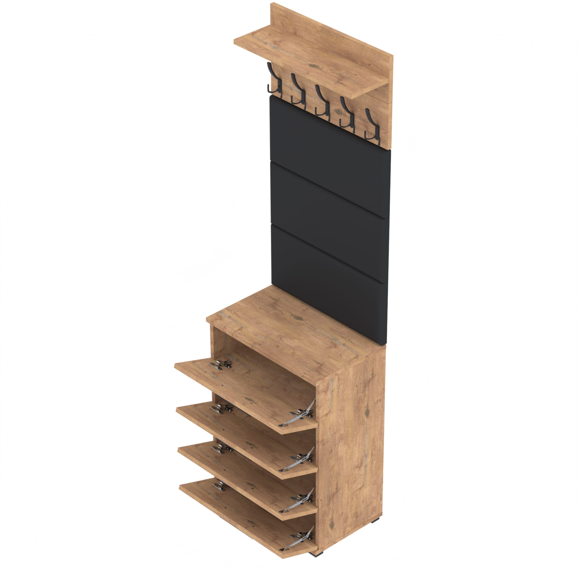 Zestaw składa się z różnorodnych elementów - szafki ALTUS z 4 półkami na buty, paneli ściennych oraz wieszaka. Te elementy razem tworzą harmonijną całość, ale mogą być również ustawiane w dowolnej konfiguracji, zgodnie z indywidualnymi potrzebami i preferencjami.