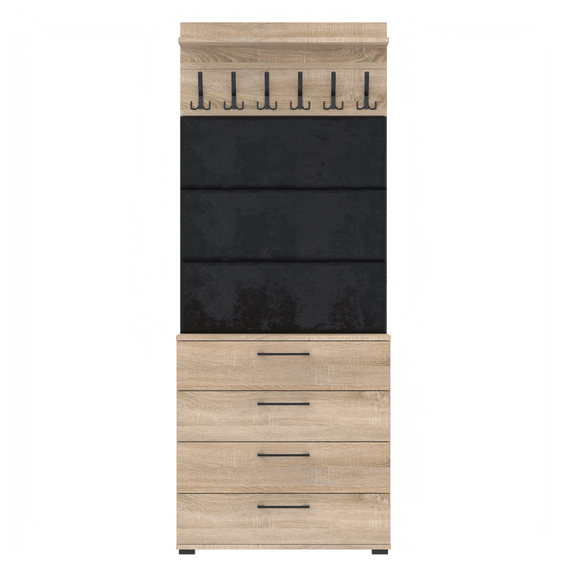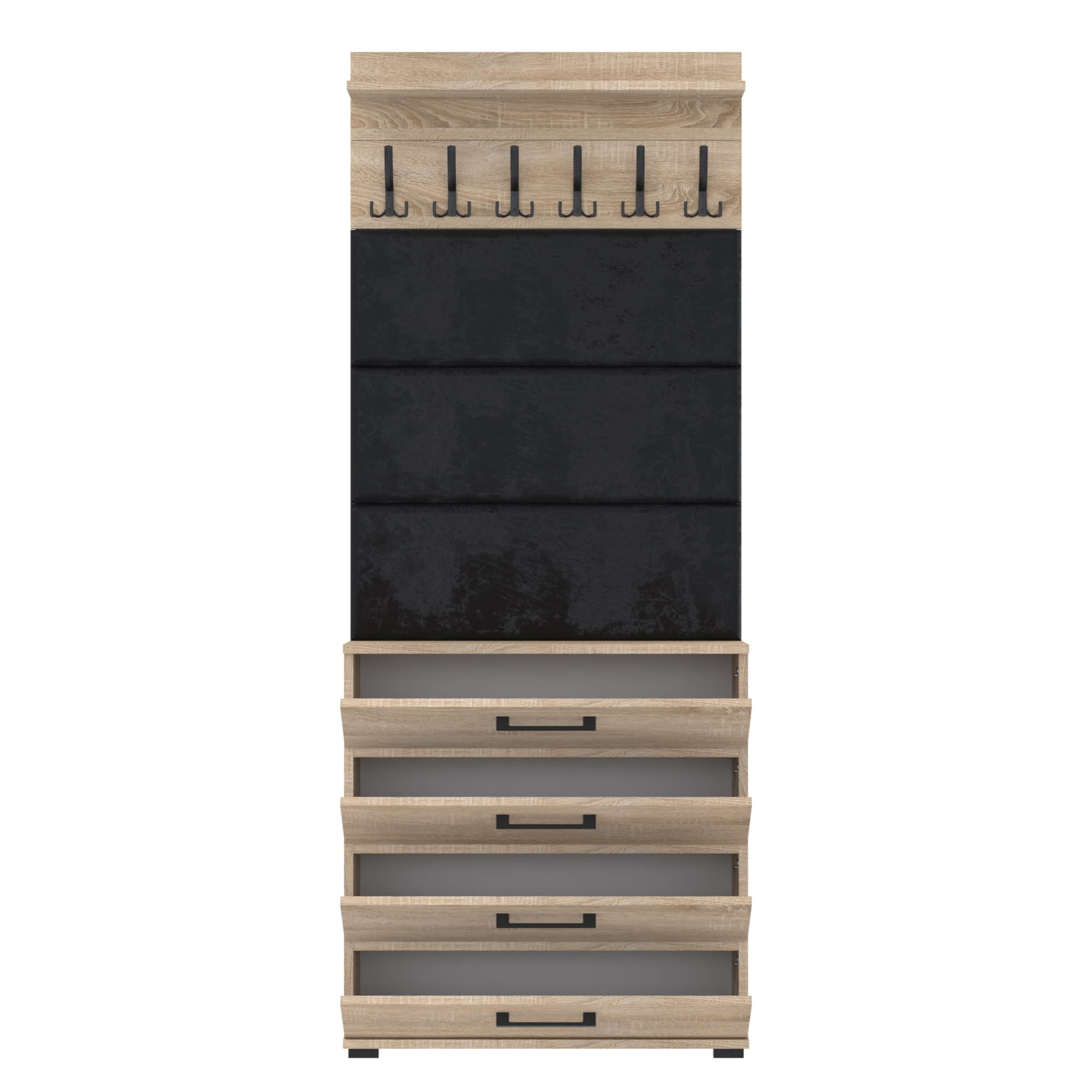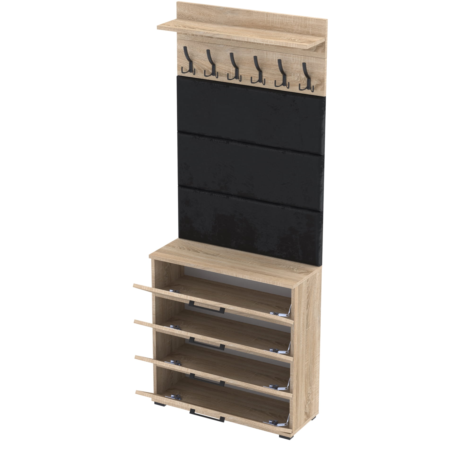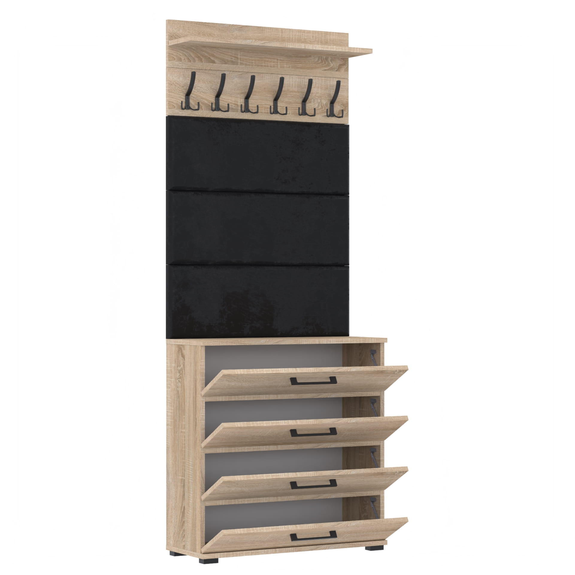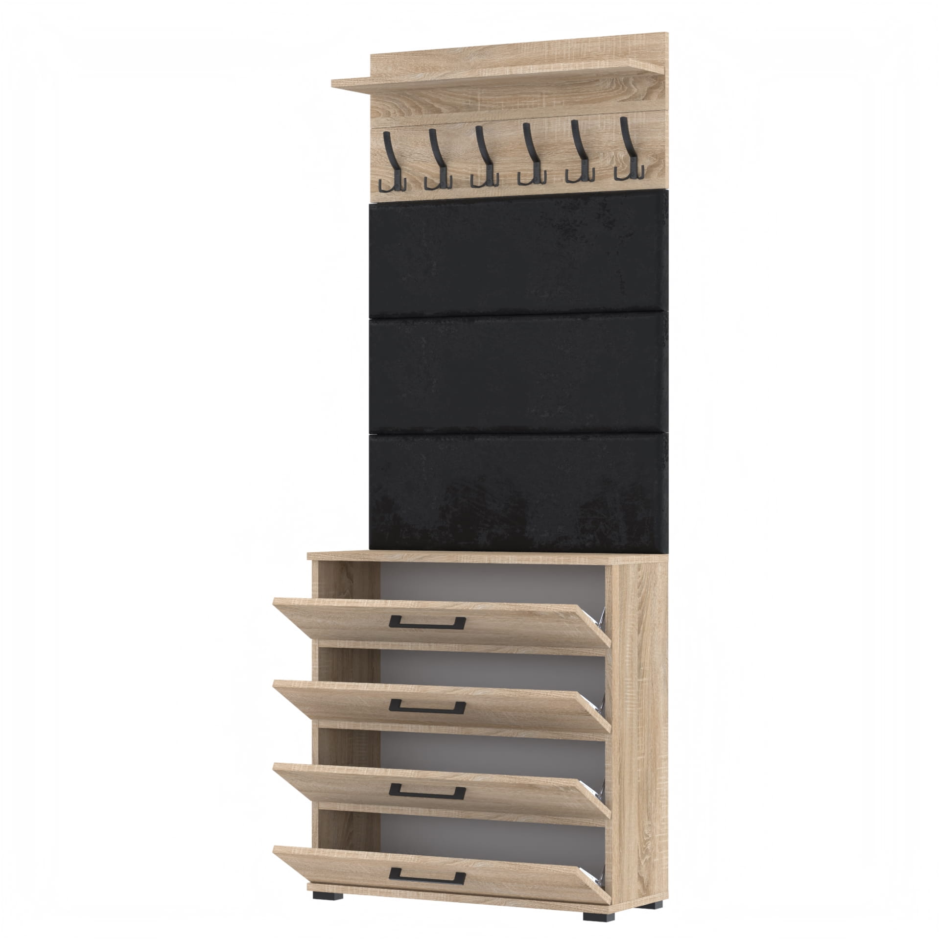 Zestaw składa się z różnorodnych elementów - szafki ALTUS z 4 półkami na buty, paneli ściennych oraz wieszaka. Te elementy razem tworzą harmonijną całość, ale mogą być również ustawiane w dowolnej konfiguracji, zgodnie z indywidualnymi potrzebami i preferencjami.
