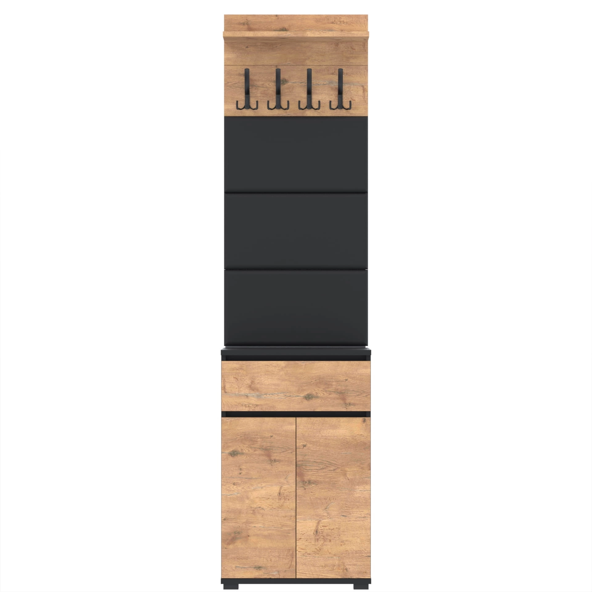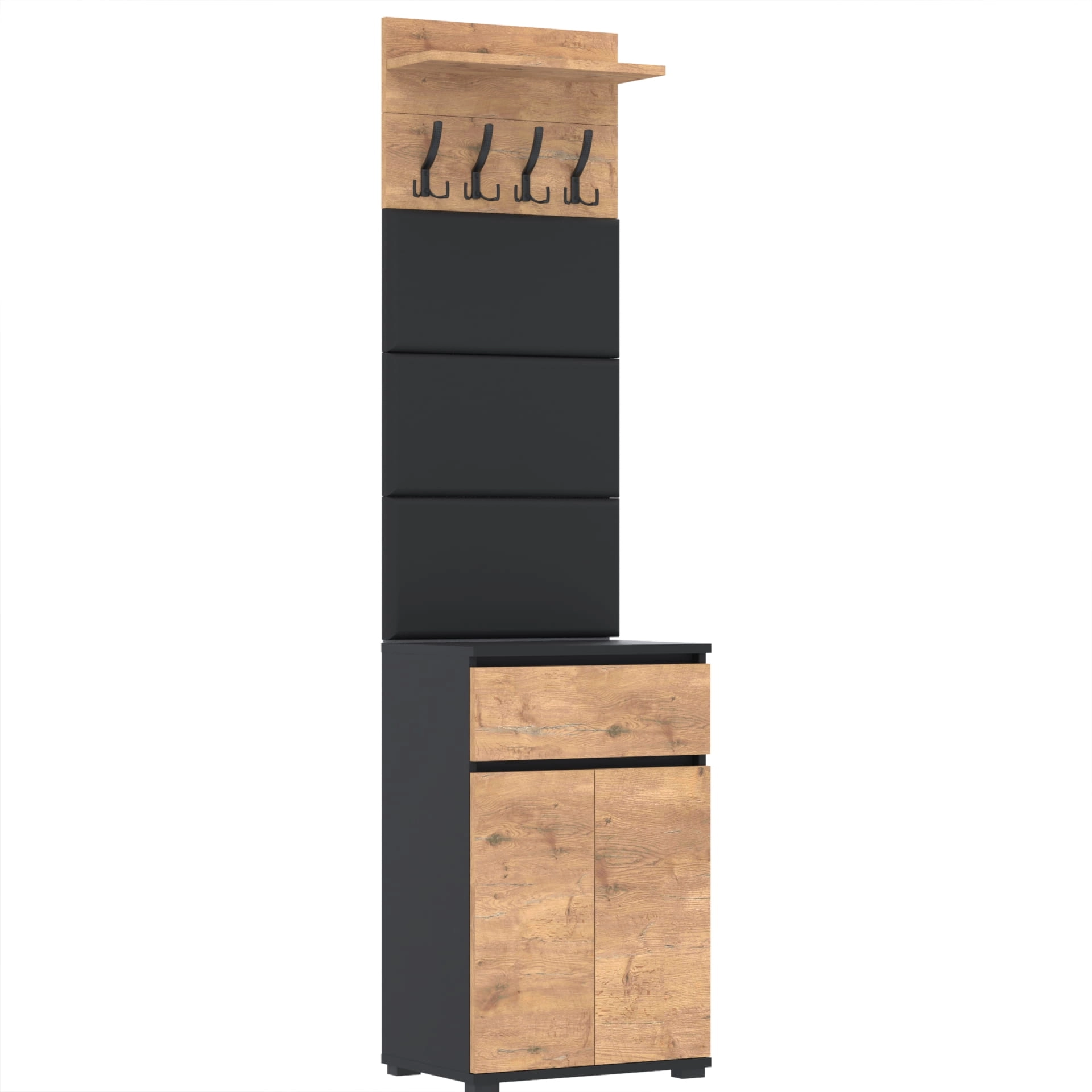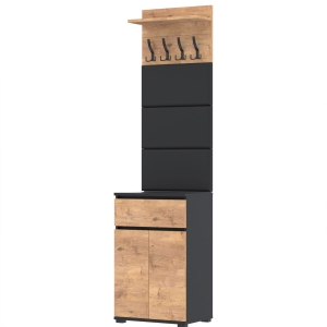 Zestaw składa się z różnorodnych elementów - komody TRES z szufladą i 3 półkami na buty, paneli ściennych oraz wieszaka. Te elementy razem tworzą harmonijną całość, ale mogą być również ustawiane w dowolnej konfiguracji, zgodnie z indywidualnymi potrzebami i preferencjami.