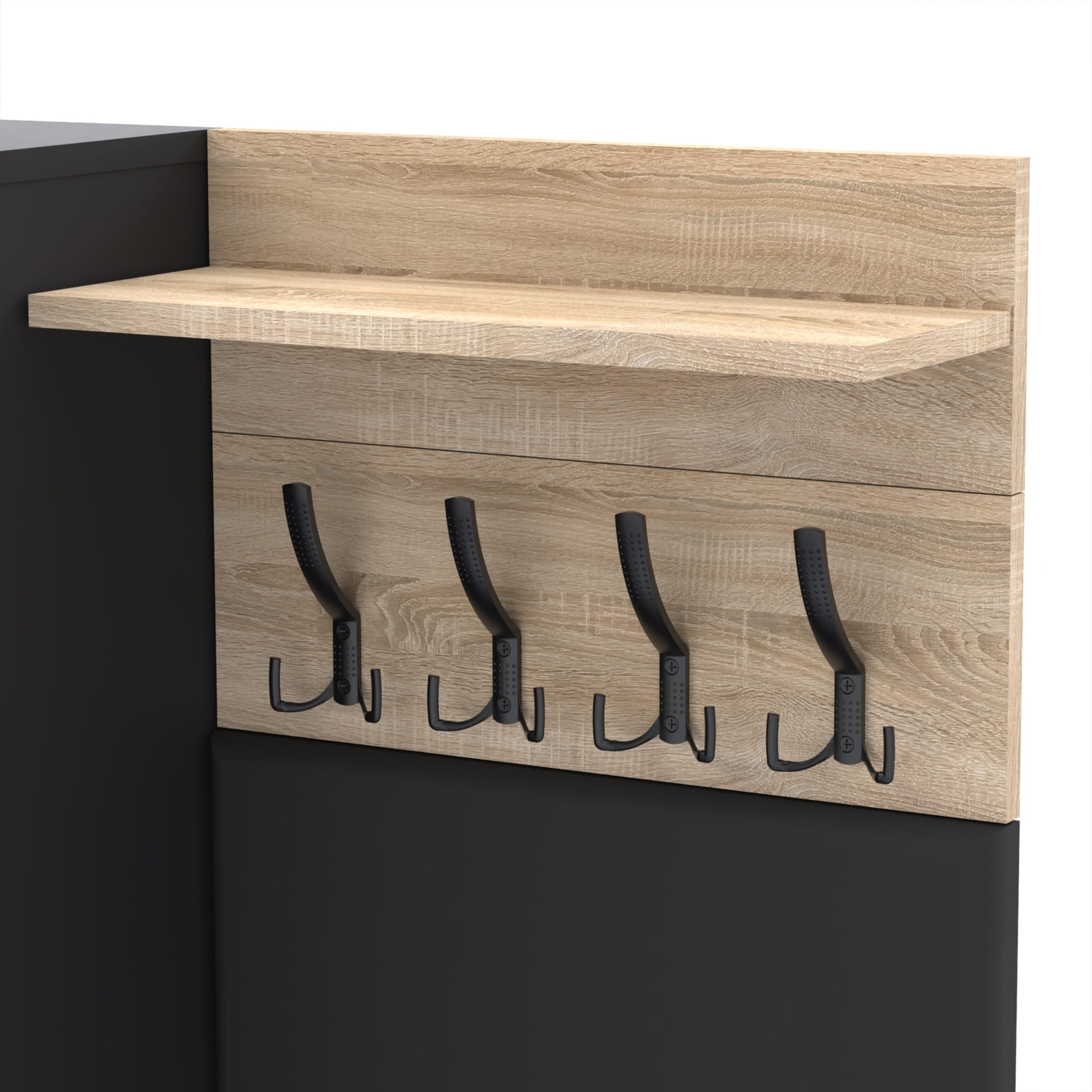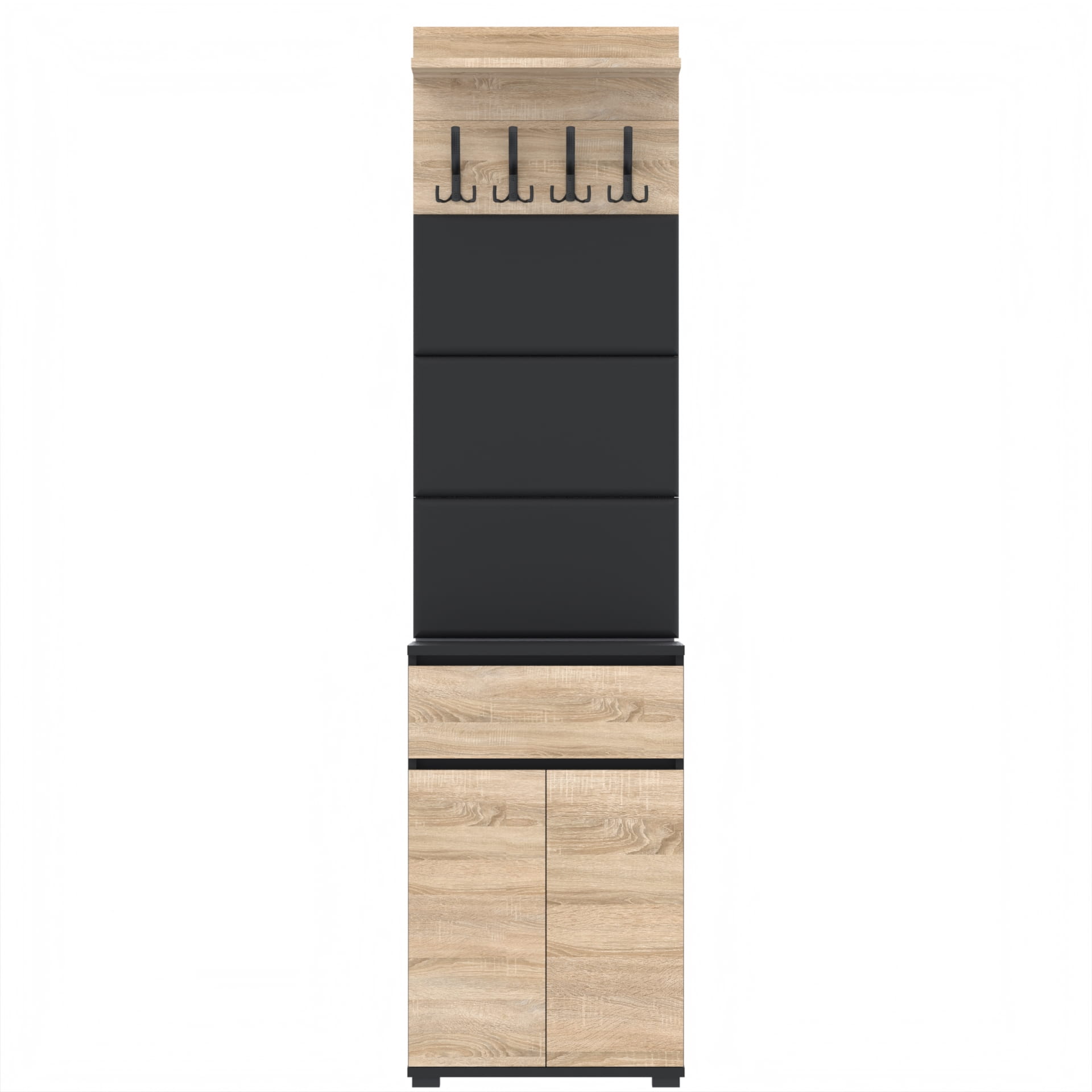 Zestaw składa się z różnorodnych elementów - komody TRES z szufladą i 3 półkami na buty, paneli ściennych oraz wieszaka. Te elementy razem tworzą harmonijną całość, ale mogą być również ustawiane w dowolnej konfiguracji, zgodnie z indywidualnymi potrzebami i preferencjami.
