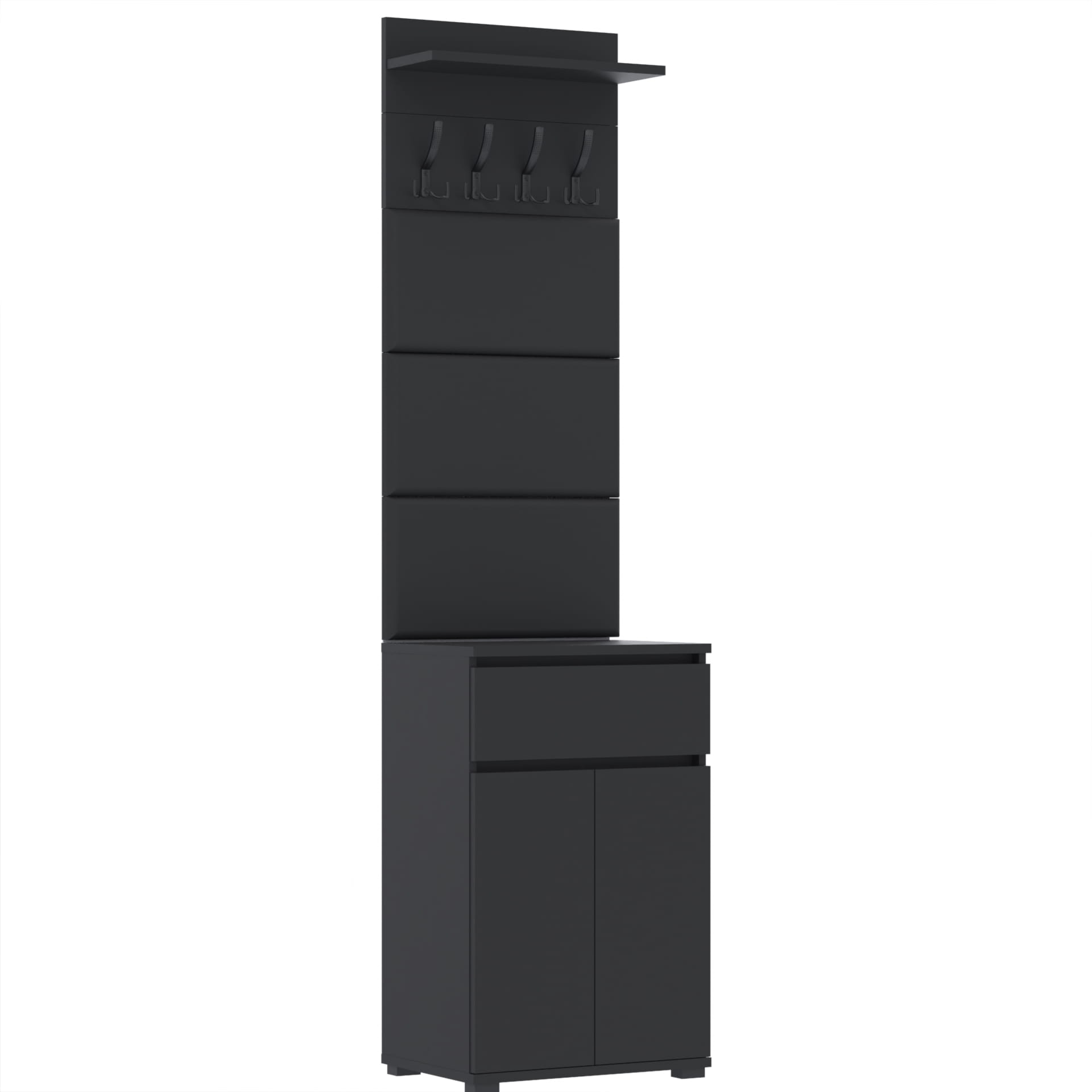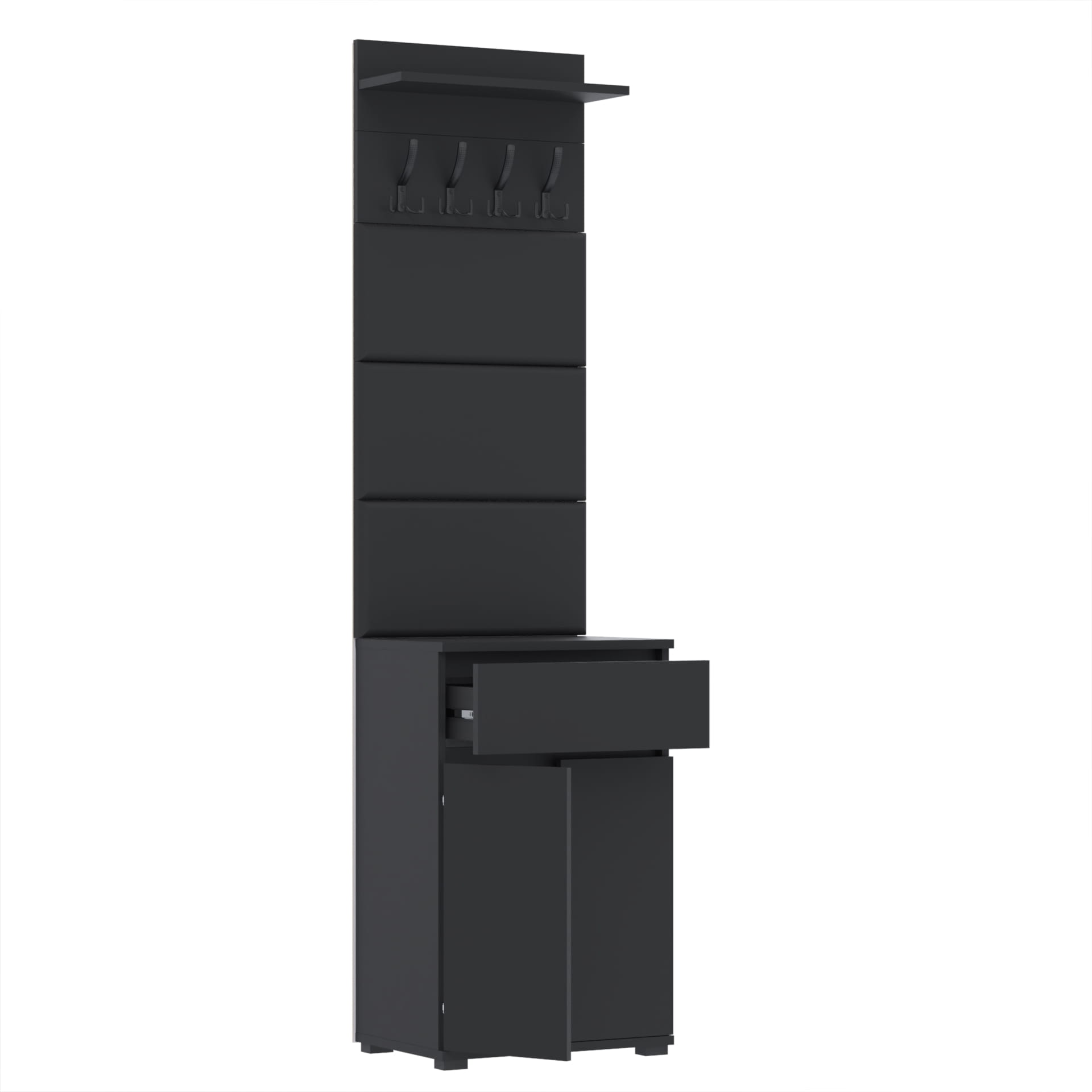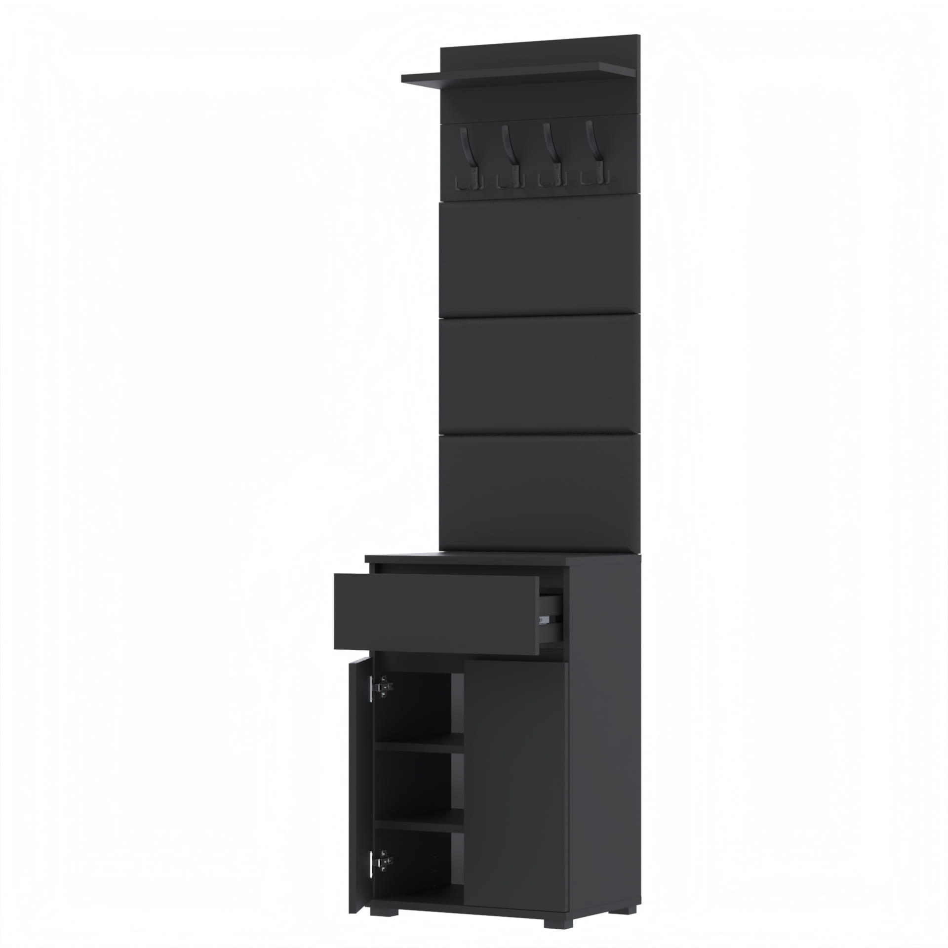 Zestaw składa się z różnorodnych elementów - komody TRES z szufladą i 3 półkami na buty, paneli ściennych oraz wieszaka. Te elementy razem tworzą harmonijną całość, ale mogą być również ustawiane w dowolnej konfiguracji, zgodnie z indywidualnymi potrzebami i preferencjami.