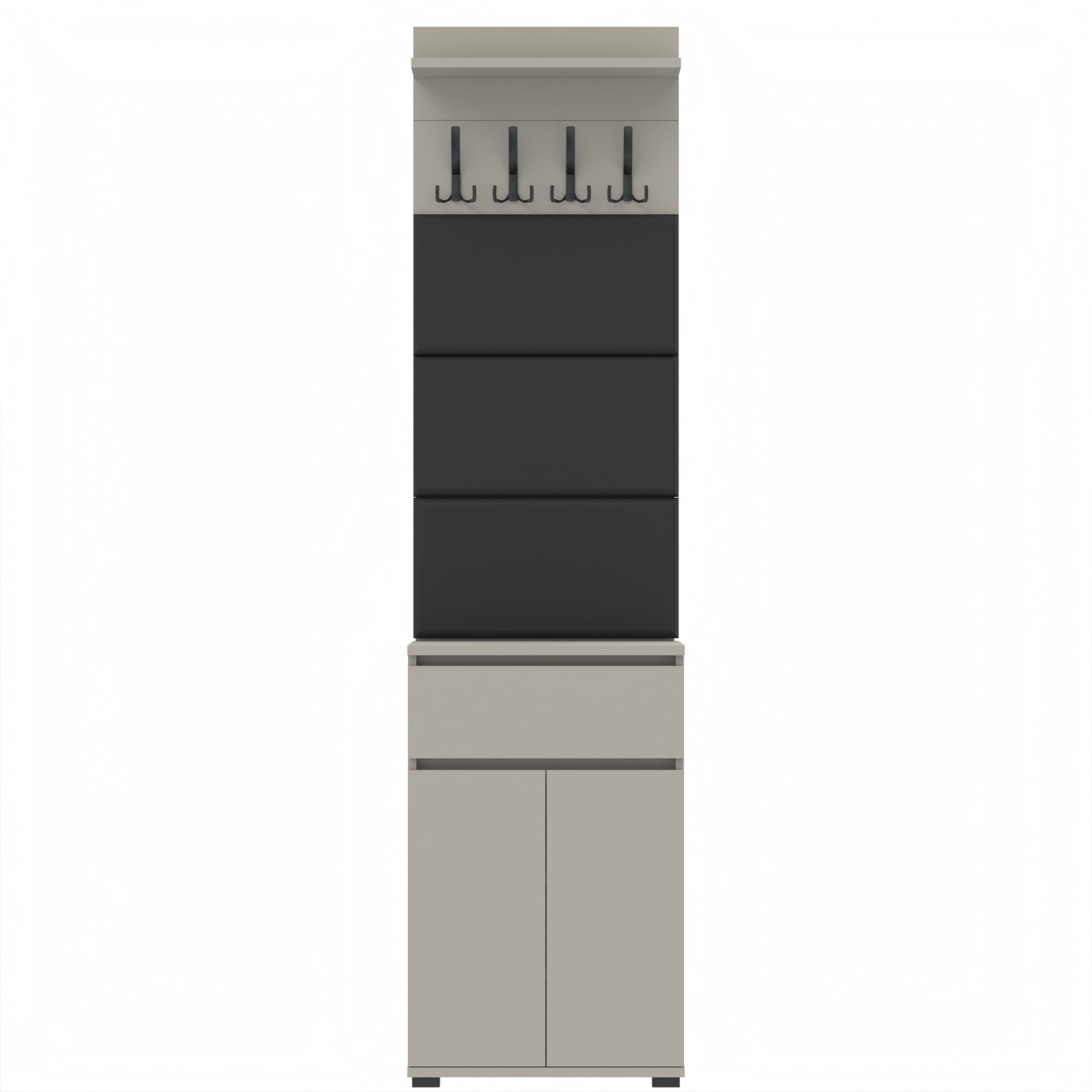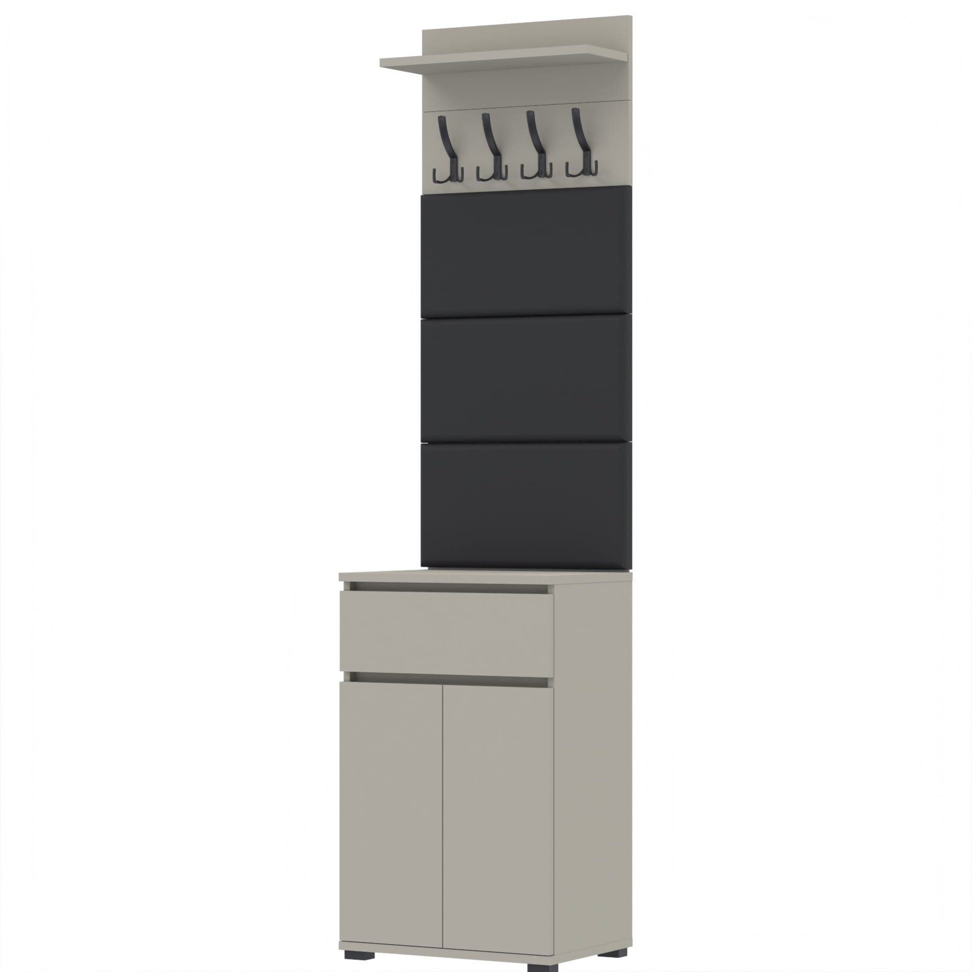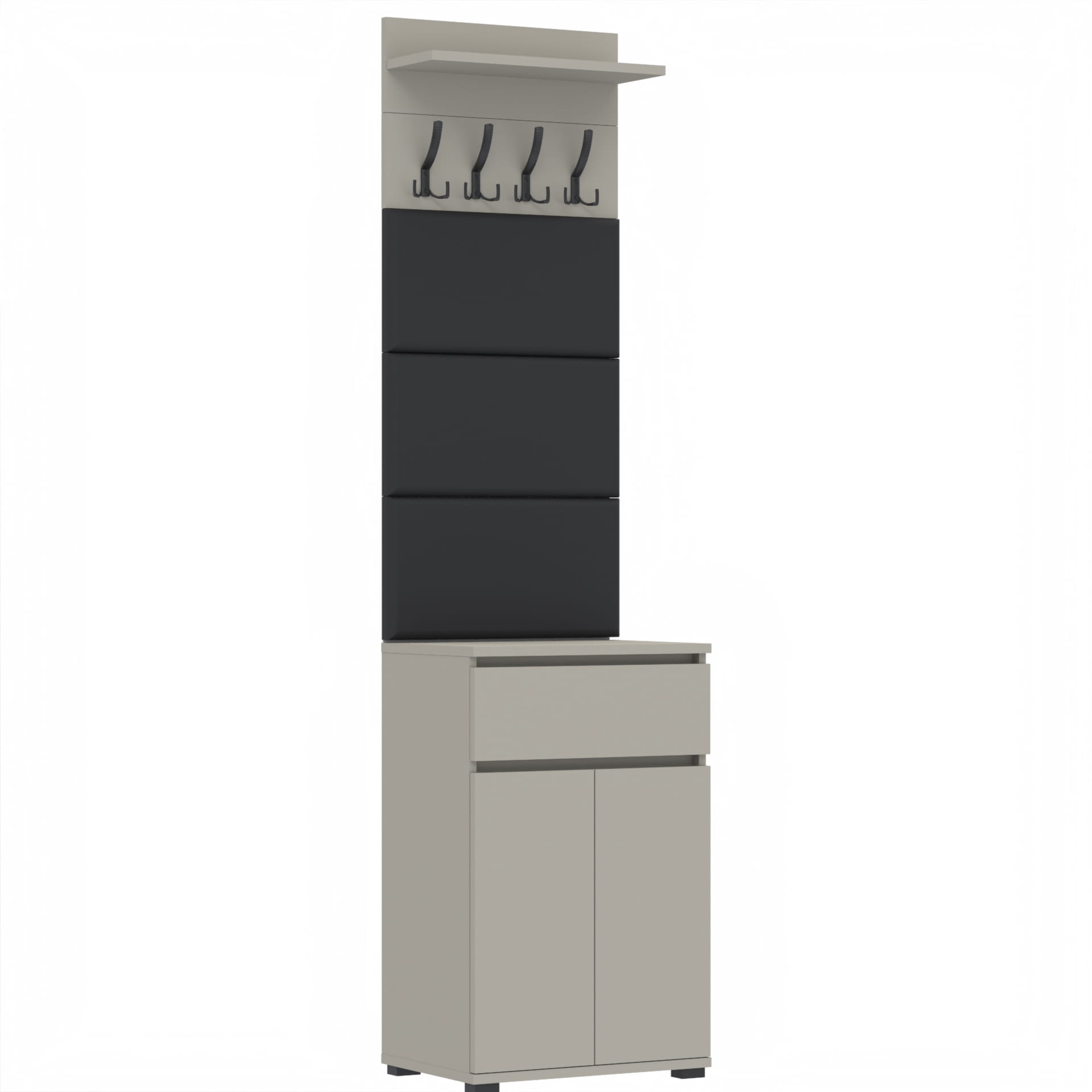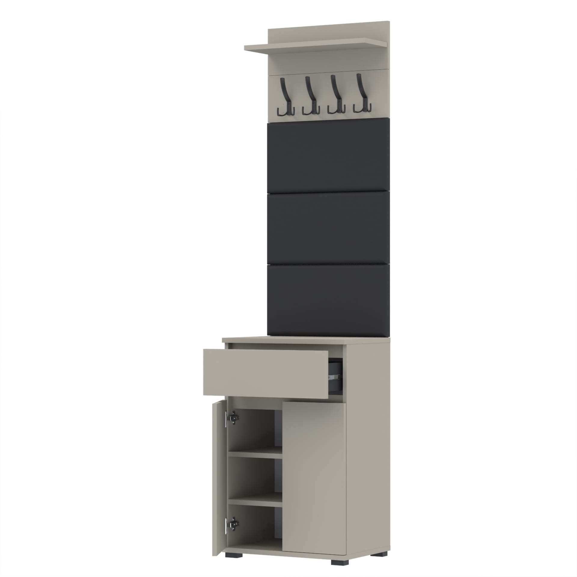 Zestaw składa się z różnorodnych elementów - komody TRES z szufladą i 3 półkami na buty, paneli ściennych oraz wieszaka. Te elementy razem tworzą harmonijną całość, ale mogą być również ustawiane w dowolnej konfiguracji, zgodnie z indywidualnymi potrzebami i preferencjami.