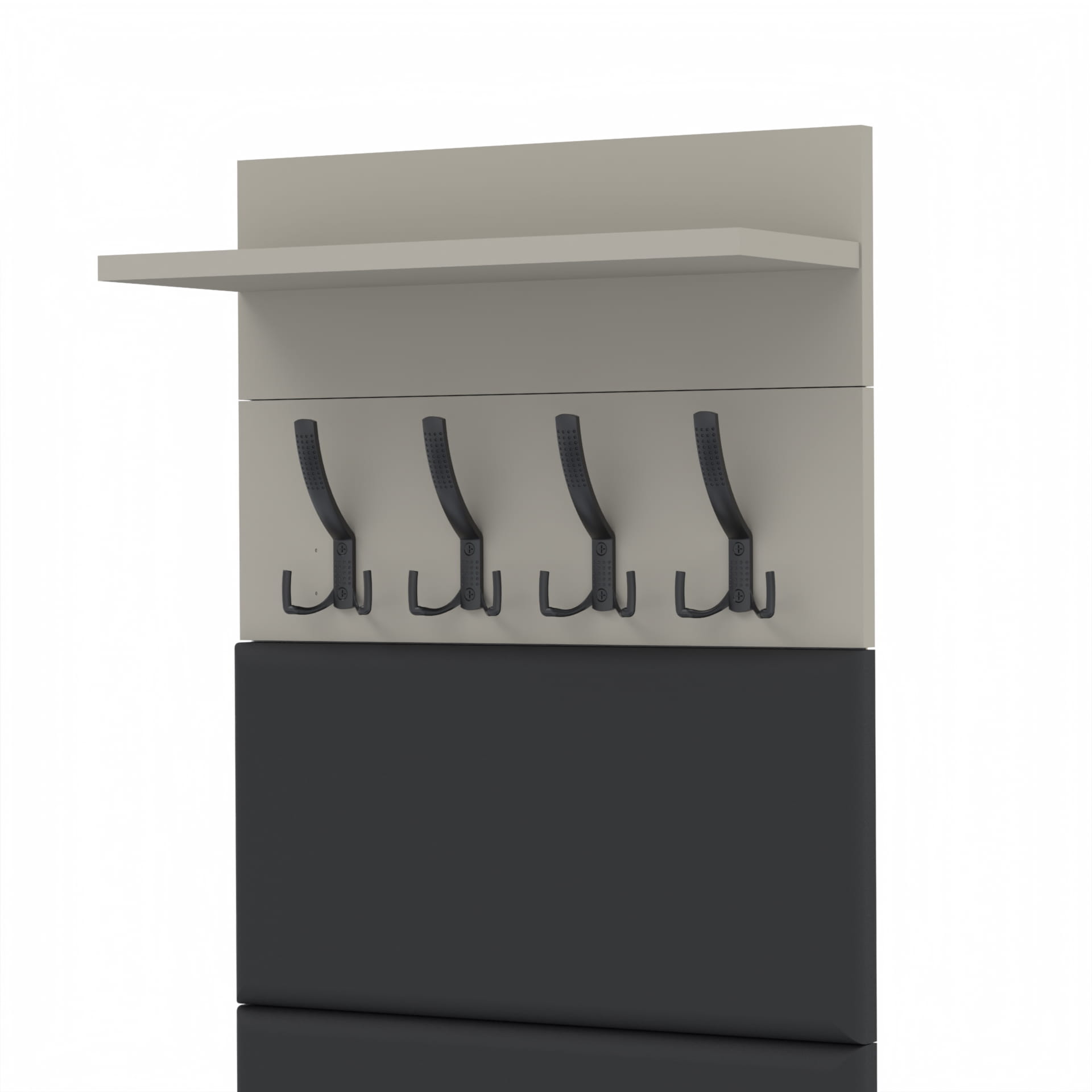 Na górze struktury znajduje się praktyczna półka o głębokości 18 cm, która jest idealna do przechowywania różnych przedmiotów. Półka nie tylko zapewnia dodatkową przestrzeń do przechowywania, ale także stanowi integralną część designu wieszaka, nadając mu ciekawy, nowoczesny wygląd.