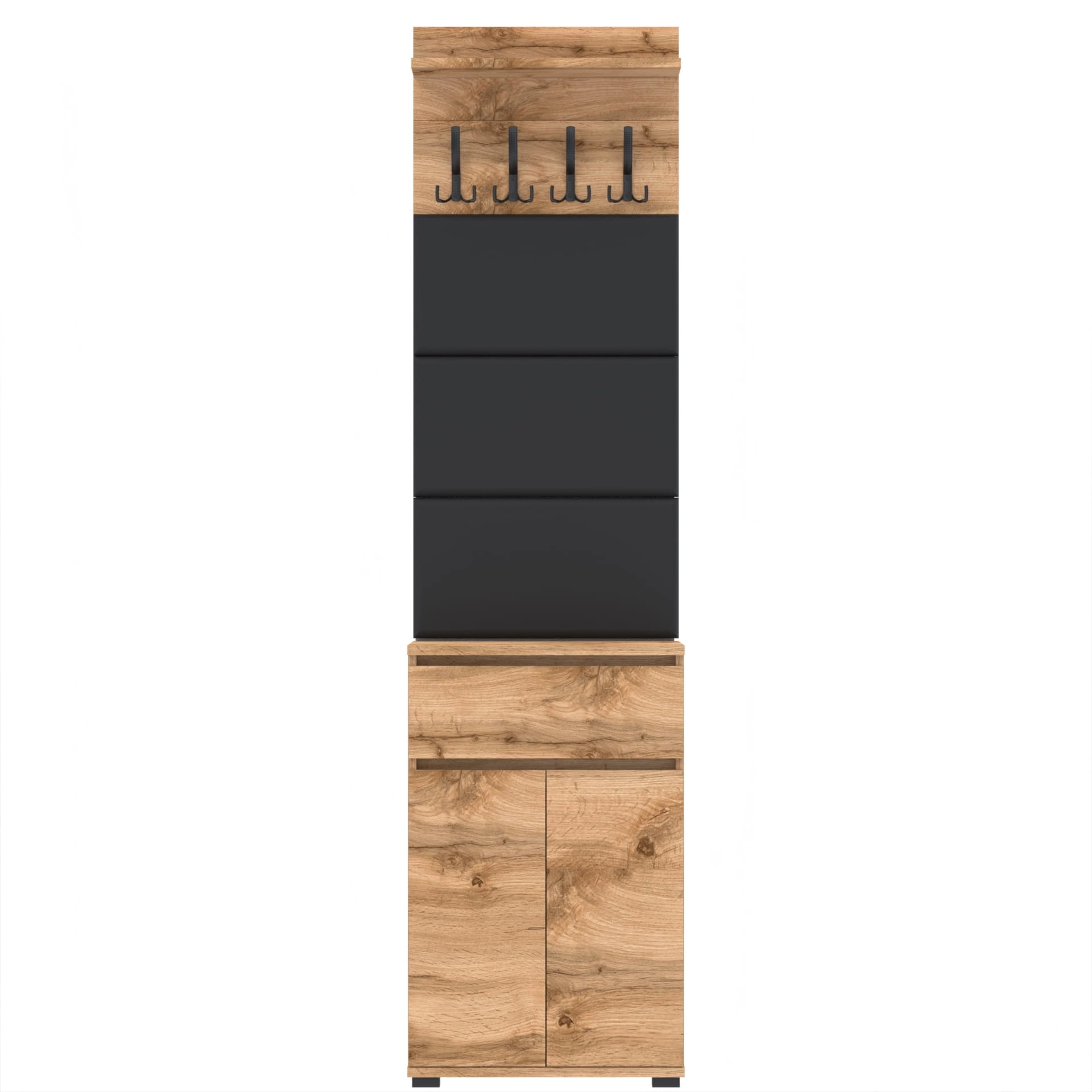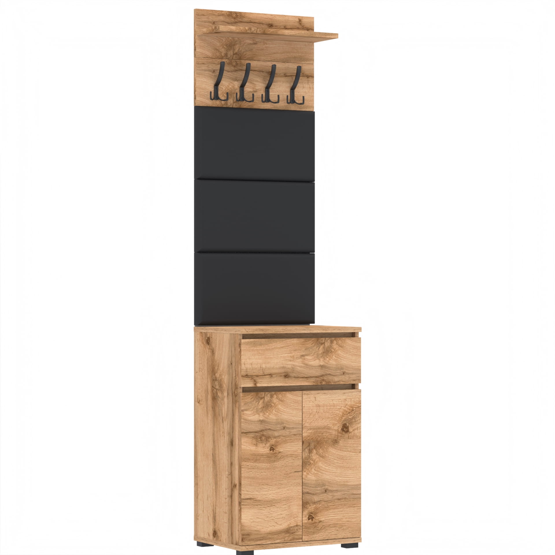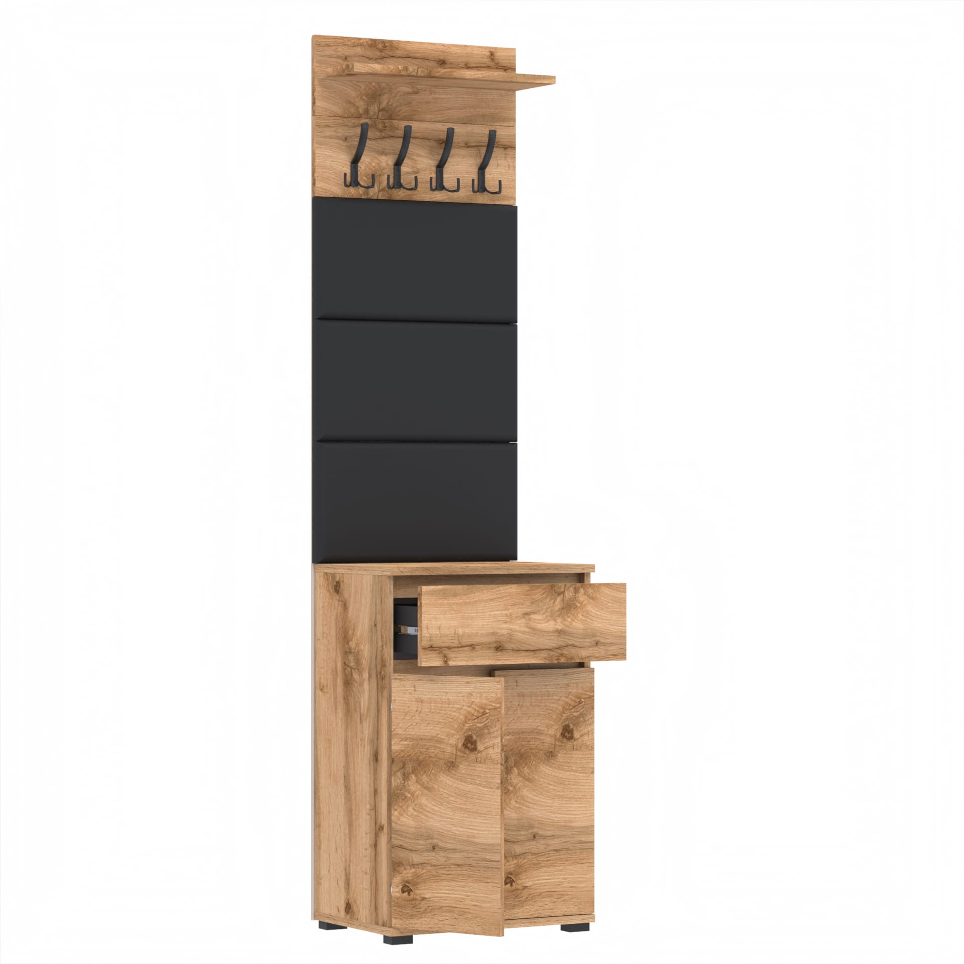 Zestaw składa się z różnorodnych elementów - komody TRES z szufladą i 3 półkami na buty, paneli ściennych oraz wieszaka. Te elementy razem tworzą harmonijną całość, ale mogą być również ustawiane w dowolnej konfiguracji, zgodnie z indywidualnymi potrzebami i preferencjami.
