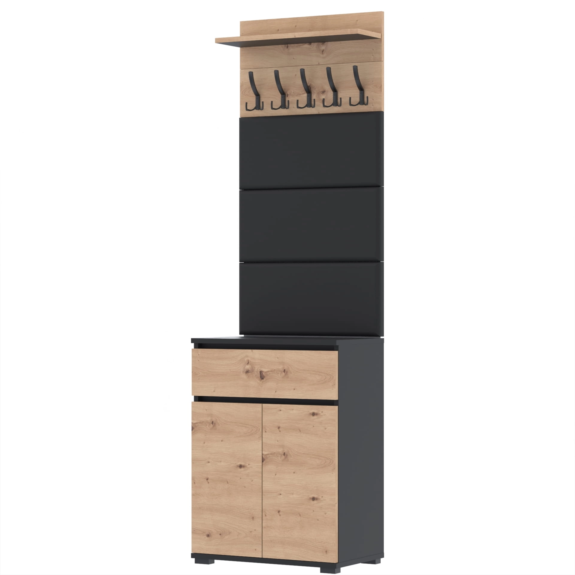 Zestaw składa się z różnorodnych elementów - komody TRES z szufladą i 3 półkami na buty, paneli ściennych oraz wieszaka. Te elementy razem tworzą harmonijną całość, ale mogą być również ustawiane w dowolnej konfiguracji, zgodnie z indywidualnymi potrzebami i preferencjami.