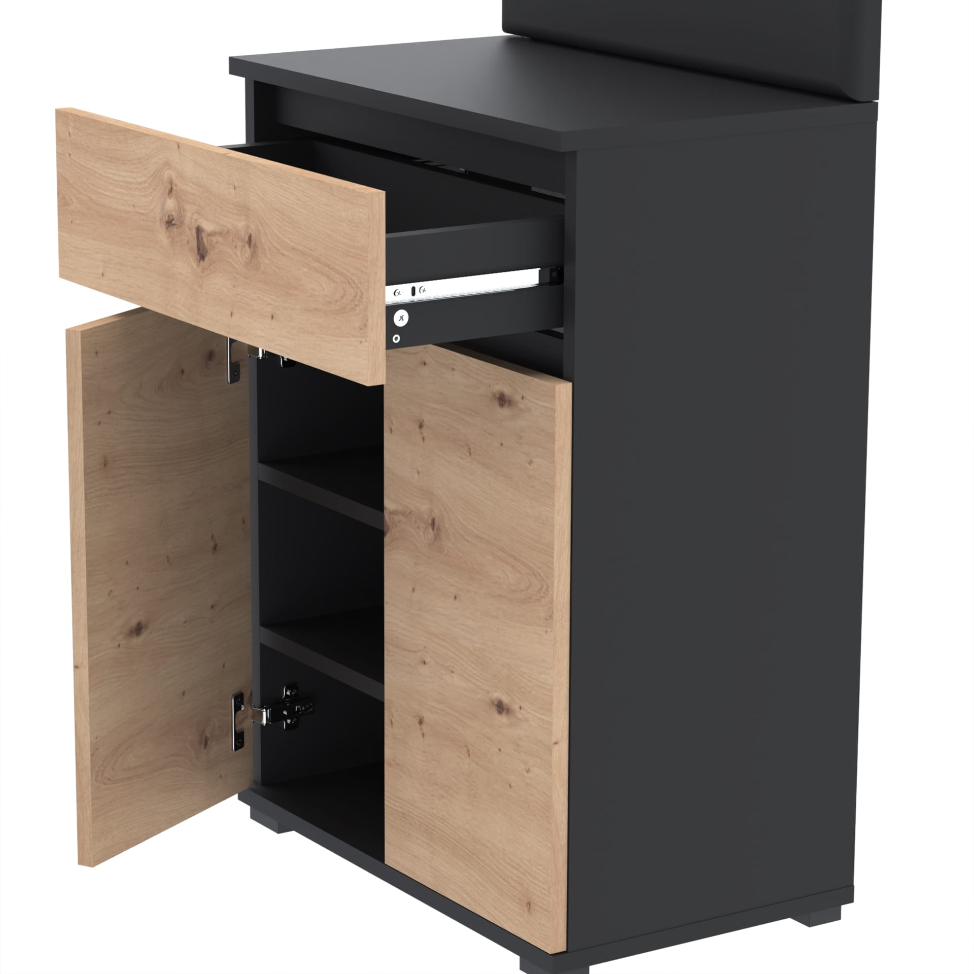 Ten unikalny zestaw mebli doskonale sprawdzi się w każdym przedpokoju. Wyprodukowany z najwyższą starannością w Polsce, łączy w sobie funkcjonalność, jakość i elegancki design.