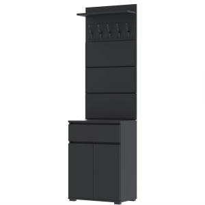 Zestaw składa się z różnorodnych elementów - komody TRES z szufladą i 3 półkami na buty, paneli ściennych oraz wieszaka. Te elementy razem tworzą harmonijną całość, ale mogą być również ustawiane w dowolnej konfiguracji, zgodnie z indywidualnymi potrzebami i preferencjami.