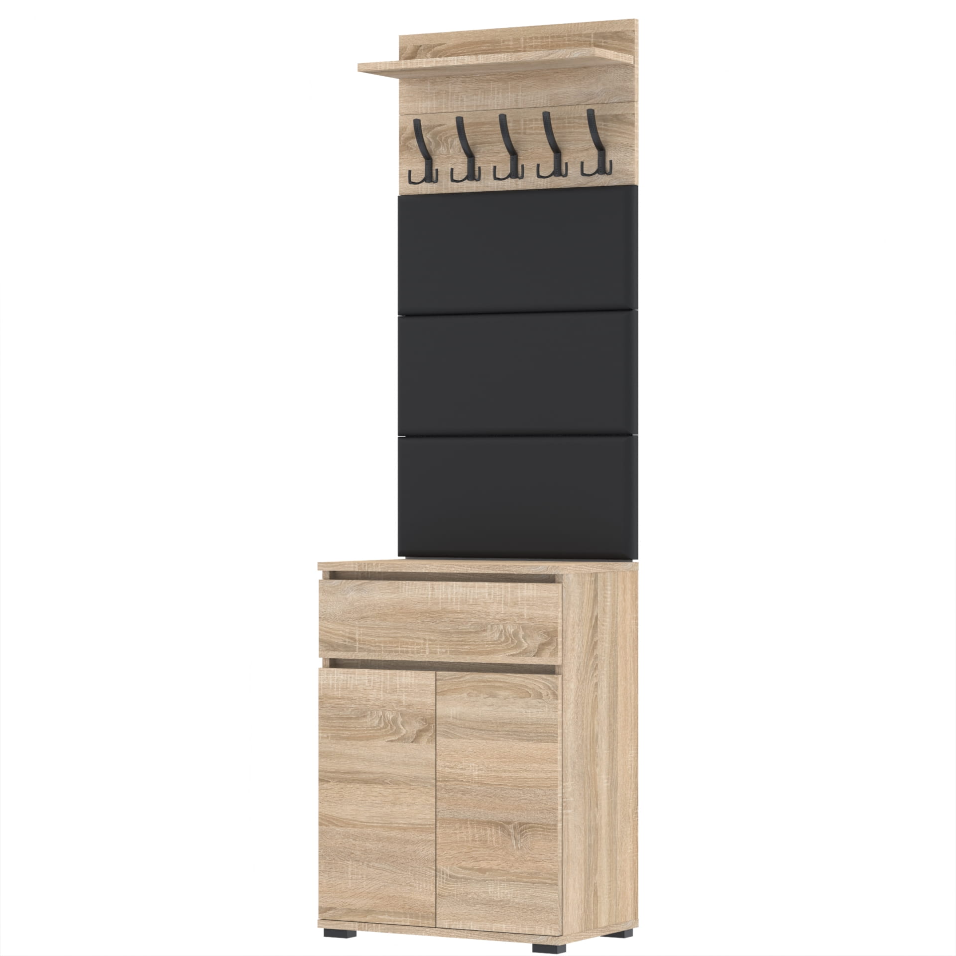 Zestaw składa się z różnorodnych elementów - komody TRES z szufladą i 3 półkami na buty, paneli ściennych oraz wieszaka. Te elementy razem tworzą harmonijną całość, ale mogą być również ustawiane w dowolnej konfiguracji, zgodnie z indywidualnymi potrzebami i preferencjami.